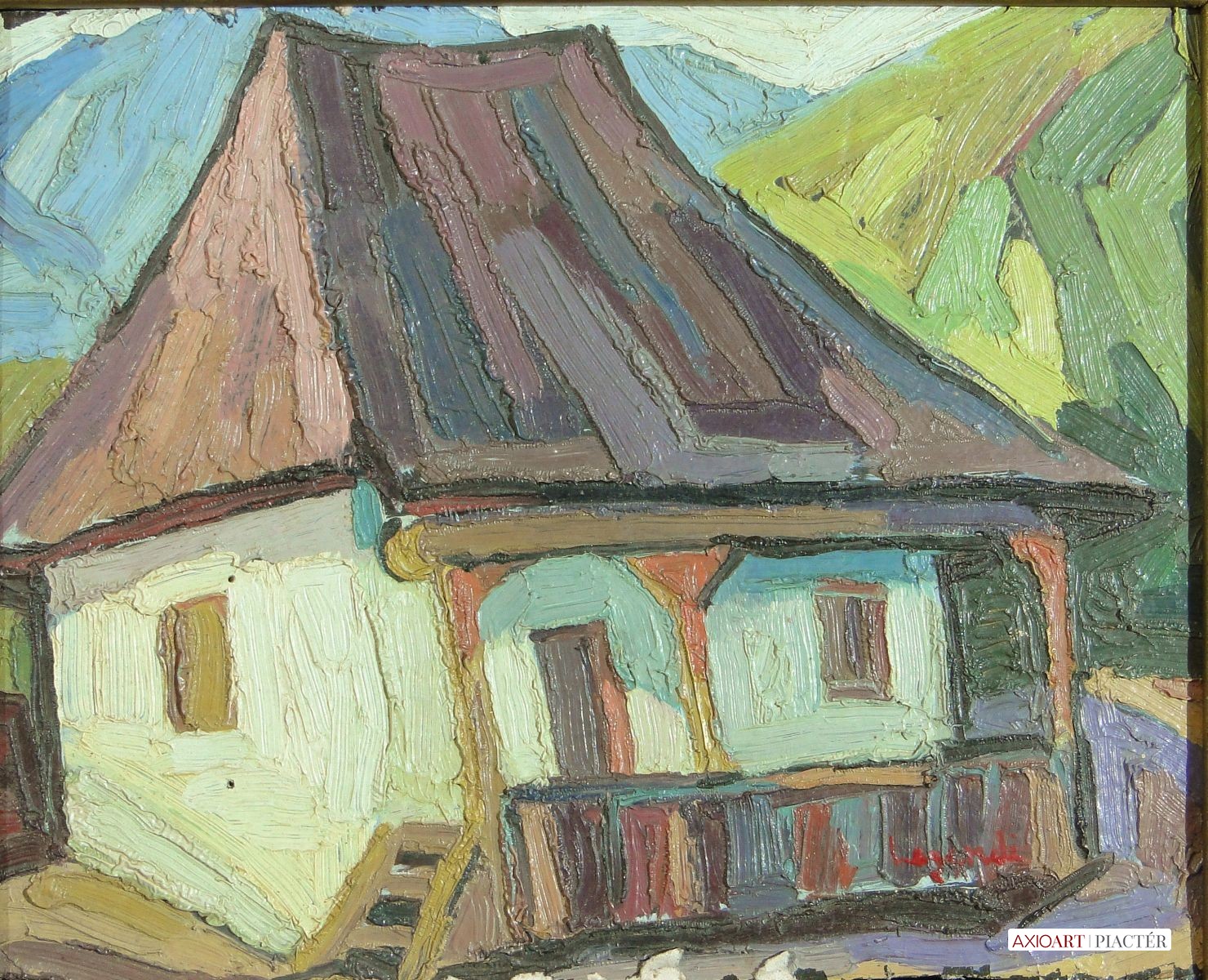 [1Y029/Z018] Olaj farost festmény, üveglap mögött, hibátlan képcsarnokos keretben. Hátoldalán Képcsarnok Vállalat papír címkéje: A művész neve: SCHÉNER MIHÁLY A kép címe: TÁJ Magasság: 66.5 cm Szélesség: 86 cm Súly: 6.54 kg Schéner Mihály festő, grafikus, szobrász, keramikus, bábtervező Medgyesegyháza, 1923-01-9 Elhalálozott: Budapest, 2009. május 11. Honlap: http://www.kormendigaleria.hu/kiadvany.html 1942-1947: Magyar Képzőművészeti Főiskola, tanára: Rudnay Gyula. 1978: Munkácsy-díj; 1984: érdemes művész; 1989: kiváló művész; 1995: Kossuth-díj. 1992-től a Magyar Művészeti Akadémia, 1993-tól a Széchenyi Irodalmi és Művészeti Akadémia tagja. 1956-ig tanított. 1982: Nagyatádi Faszobrász Alkotótelep, 1985: Nemzetközi Acélszobrász Alkotótelep, Dunaújváros. A stílusában felismerhető, mégis sokféle műtárgyat létrehozó ~ gazdag, állandóan alakuló életműve a folyton változó világban helyét kereső, az alkotói szabadságot megvalósító XX. századi képzőművész példázata lehetne. Magát expresszív-szürrealista alkotónak nevezi. Egyaránt dolgozik festékkel, textillel, fával, fémmel. Rajzol, szerkeszt, farag, épít, gyúr, varr és ragaszt, felhasználja a mézesbábok öntőformáit. Festő, rajzoló, textilszobor- és bábkészítő, fazekas, asztalos, esztergályos. Háromlépcsős folyamatban gondolkozik: rajzban tervez, majd fest, szobrot készít, “formába önt”, mindig a végső plasztikai megoldást keresi. Ami állandó és mégis játékosan változékony megjelenésű Schéner művészetében, az a gyermekkori emlékek által meghatározott népi mesterségek iránti tiszteletet kifejező motívumkincs, a tárgyi folklór formakészlete, amely már-már kézjegyként ismétlődik munkáin. Mitologikussá nőtt képzelete új lényeket teremt, pl: a Pigulát, amely disznótestű, emberfejű teremtmény. Schéner festményein a szürrealista motívumokat konstruktív szerkezetbe rendezi, a geometriát és az organikus természeti motívumokat egyaránt beépíti műveibe. A népi, népművészeti formakincsből merített lovas huszárok, betyárok, szegénylegények cifra szűr mentéje, piros csákója, fekete csizmája, az önálló életet élő zsinórdíszek és mézeskalács bábok, a kiskocsik a gyermekkori vásárok, búcsúk színes forgatagába vezet. A primér motívumokat aztán felváltják a vastagon felhordott felületbe karcolt jelek, vonalhálózatok, amelyek a játszó gyermek homokba rajzolt ábráit, a pásztorember fába vésett üzeneteit, az ősember barlang falába rótt mágikus jeleneteit idézik meg. A művész pillanatnyi érdeklődésének megfelelően a színek búvópatakként tűnnek el és jelennek meg ismét. A 60-as években leginkább a formákkal való játék érdekelte, a festmények felülete egyre gazdagodott: a táblaképek felületén applikációk jelentek meg, vagy lemállasztott rétegek hagyták maguk után hiányukat, motívumok nélküli ősformák, archetipikus képzetek bukkantak fel művészetében. A véletlenszerűnek látszó rétegekkel való játék azonban tudatos komponálás eredménye, amely később nyilvánvaló ritmusnak és formai szerkesztettségnek adja át a helyét, mint a Törvénytáblák c. sorozaton. A különböző művészi kifejezési formák egymásra termékenyítő hatással vannak, át- meg áthatják egymást. Textilszobrai, amelyekkel új műfajt teremtett, ugyanazzal az automatikus, expresszív-szürrealista módszerrel készülnek, mint festményei. A hagyományosan a népművészetben alkalmazott anyag, a filc lehetőséget ad a népi formakincs felelevenítésére, amely azonban a művész különös szürrealista átiratában jelenik meg. A szívekkel kivarrt, zsinórdíszes Posztókotlós c. művén mézesbábok lógnak, hátán huszárok lovagolnak. Egész sor textilből készült kéz-plasztikát alkot, amelyeket az ujjakra rávarrt díszekkel öltöztet, személyesít meg. A színes-különös világból aztán ~ újra puritán képi és formai rendbe juttatja el a nézőt, majd nemsokára tépett, gyűrt, vágott, csorgatott, repedezni hagyott szenvedélyesen vonagló képi felületeket hagy hátra. Schéner készített apró gyermekjátékokat, térstruktúra-tereket, mászókákat is. A magyar népi formák mellett szürreális játékaiban gyakran alkalmaz görög mitológiai alakokat, “elkentaurosodott” lovakat, Gorgó-fejeket, sellőket, hárpiákat, Pán-ábrázolásokat. Schéner nemcsak saját művészetéről publikál, hanem művésztársairól is számos írása jelenik meg, elsősorban az Új Auróra c. folyóiratban, amelynek egy ideig főmunkatársa volt. Irodalom kiállítása, Magyar Építőművészet, 1962/4. Húsz év után, Művészet, 1965/4. BOZÓKY M.: ~, Tiszatáj, 1968/5. PERNECZKY G.: Nincs uborkaszezon, Élet és Irodalom, 1969. augusztus 8. BARÁNSZKY-JÓB L.: ~, Művészet, 1969/9. LÁSZLÓ GY.: ~ kaposvári kiállítása, Jelenkor, 1969/4. MAJOR M.: Pásztorok, betyárok, huszárok - kezek, Tükör, 1970. szeptember 15. FRANK J.: Bemutatjuk ~t, Élet és Irodalom, 1972. május 6. ról kiállítása ürügyén, Képzőművészeti Almanach, Budapest, 1972 Sötétkék kokasok, Élet és Irodalom, 1973. szeptember 9. MAJOR M.: ~ játékai, Élet és Irodalom, 1974. július 27. BARTA J.: Egy különös művész, Alföld, 1974/6. VADAS J.: Szárnykészítők, Élet és Irodalom, 1975. október 4. JUHÁSZ F.: A halál ellen játszani, Élet és Irodalom, 1975. május 17. PAP G.: Kincsek és műkincsek, Művészet, 1975/6. P. SZŰCS J.: Az utak kettéválnak, Művészet, 1978/3. Békési művészet, Művészet, 1978/7. SZAMOSI F.: ~ [kismonográfia], Budapest, 1978 VADAS J.: Játék a játékkal, Élet és Irodalom, 1979. augusztus 18. NÉMETH L.: ~ műveiről, Művészet, 1979/4. MIKLÓS P.: Mit akar ez a múzeum?, Művésze