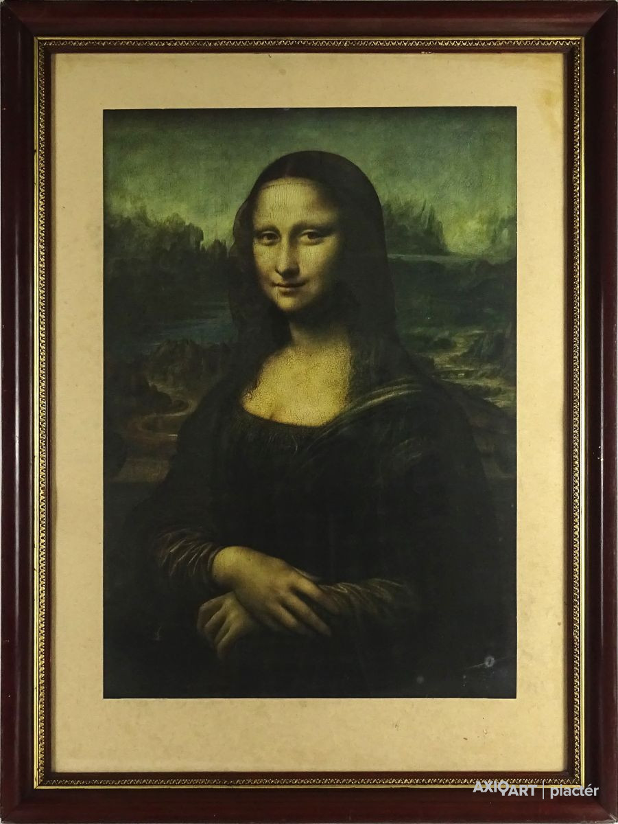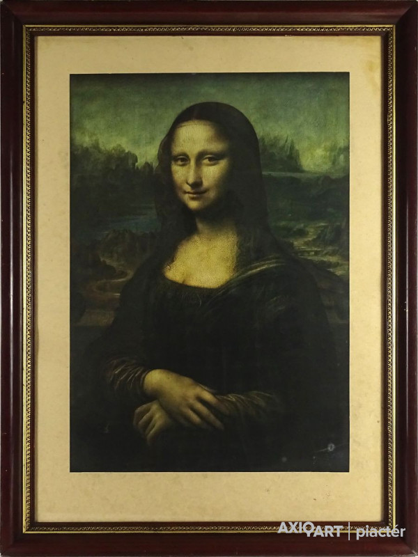 [1Q649/056] Keretezett, nagy méretű színes nyomat, olajnyomat. Akasztási lehetőséggel rendelkezik. Magasság: 77 cm Szélesség: 57.5 cm Súly: 3.995 kg Mona Lisa   Mona Lisa La Gioconda Művész Leonardo da Vinci (1503-1519) Típus olajfestmény Műfaj arckép Mozgalom Késő reneszánsz Magasság 77 cm Szélesség 53 cm Múzeum Louvre Gyűjtemény a Louvre festmény részlege Település Párizs, Franciaország A Mona Lisa (más néven La Gioconda) Leonardo da Vinci 1503-1519 között készült leghíresebb festménye, remekműve, ami jelenleg a párizsi Louvre-ban van kiállítva.     A kép A kép 77 x 53 cm nagyságú, nyárfatáblára olajjal festett portré. Egy rejtélyes, megfontolt választékossággal teli, bölcsességet sugárzó női mosoly egy érdekes tájban. Sokak szerint talán az egész festészet történetének legismertebb alkotása. Ez köszönhető annak, hogy a kép „női” arca gyakorlatilag már a közösségi emlékezet részének tekinthető, ismert az egész világon, másolják, fényképezik, karikatúrákat készítenek róla és ezerszámra sokszorosították. A képet 1911-ben ellopták, de 1913-ban előkerült.  A cím Leonardo soha nem nevezte el a képet (a reneszánsz idejében még nem volt szokás a képeknek címet adni). A Mona Lisa címet Giorgio Vasari, az életrajzírója adta 31 évvel a művész halála után. Lisa Gherardini egy köztiszteletnek örvendő firenzei kereskedő, Francesco del Giocondo ötgyermekes, erényes felesége volt. A „Mona” egy elterjedt rövidítése az olasz madonna (asszony, asszonyom) szónak. A Gioconda a gondtalant jelentő Giocondo név nőnemű alakja. A kép rejtélyes mosolya miatt a cím (a. m. gondtalan nő) e kettős jelentéssel játszik.  Egyéb Vincenzo Peruggia lopta el 1911. augusztus 21-én a képet Louvre-ból. Az esetet a 20. század legnagyobb műkincslopásaként tartják számon. A kép 1913. december 12-én Firenzében került elő, miután Peruggia tárgyalásokat kezdett az eladásáról a firenzei Uffizi képtárigazgatójával, Alfredo Gerivel, aki azonban feljelentette. A festményt az olasz állam visszaszolgáltatta a párizsi múzeumnak.  A Ki van a képen? rejtélye A leggyakoribb vélekedés szerint a kép del Giocondo feleségét, Lisát ábrázolja, amit tények is igazolnak. Azt viszont kevesebben tudják, hogy Lisának volt egy házasságon kívüli gyermeke - nagyapja azért adta hozzá Giocondo-hoz, hogy a szégyent elkerülje (azt is tudjuk, hogy Giocondonak Lisa előtt volt egy felesége aki Lisa anyjának testvére volt) - aki mindössze egy délutánt ért meg, s apja nem is tudott róla soha. Dr. Lillian Schwartz szerint a kép egy önarckép, maga Leonardo da Vinci női ruhában. Digitális elemzése során szinte teljes egyezést fedezett fel Leonardo önmagáról rajzolt képei és a Mona Lisa között. Elméletének kritikusai szerint a hasonlóság oka az, hogy ugyanaz a személy, ugyanabban a stílusban dolgozott. Az sem bizonyított, hogy az önarckép valóban önarckép. Maike Vogt-Lüerssen amellett érvel, hogy a nő a rejtélyes mosoly mögött Aragóniai Izabella, Milánó hercegnéje. Leonardo tizenegy évig dolgozott a hercegi udvarnak. Vogt-Lüerssen szerint Mona Lisa sötétzöld szemei a Visconti-Sforza családhoz tartozását jelzik. Mások szerint viszont Leonardo édesanyja, Catherina látható rajta abban a pillanatban, amikor először érzi gyermeke moccanását, feloldva korábbi egykedvűségét és szomorúságát, és mosolygásra késztetve őt. Mindez észlelhető, ha felváltva eltakarjuk arcának bal és jobb oldalát. Jobboldala közömbös, egykedvű, bal oldala viszont mosolyra nyílik. Csak akkor érthető meg ez a félmosoly, ha ismerjük Catherina és Leonardo sorsát: Catherinát otthonából elrabolták, és rabszolgaként adták el, Leonardót pedig a firenzei Palazzo Vecchióban 1505-ben Michelangelo a Cascinai Csata groteszkjével alázta meg. (Lásd "Reneszánsz probléma...") A rejtélynek persze más megoldásai is lehetségesek. Pl. 2008 januárjában állították, hogy a képen Lisa Gherardini, Francesco del Giocondo firenzei selyemkereskedő felesége látható. A kutatók a Heidelbergi Egyetem gyűjteményében találtak rá a bizonyítékra. A feljegyzést 1503 októberében a művész egyik ismerőse, Agostino Vespucci készítette egy a Cicero leveleit tartalmazó kötet margójára. A feljegyzés arról tanúskodik, hogy a művész egyszerre három képén dolgozott, közülük az egyik Lisa del Giocondo portréja, ami nem kizárt, hogy a Mona Lisa egy másik kép, amit Leonardo magának festett, és amíg élt, senkinek sem adta át. Silvano Vietri régész és munkatársai három, nagyjából egykorú nő földi maradványaira bukkantak abban a kolostorban, ahová Lisa a férje halála után beköltözött. 2013-ban DNS-mintát vettek Lisa fiától. Ha a minta a három nő közül valamelyik rokona a fiúnak, tudni fogjuk, hogy ki volt az igazi Mona Lisa.   Forrás: wikipédia