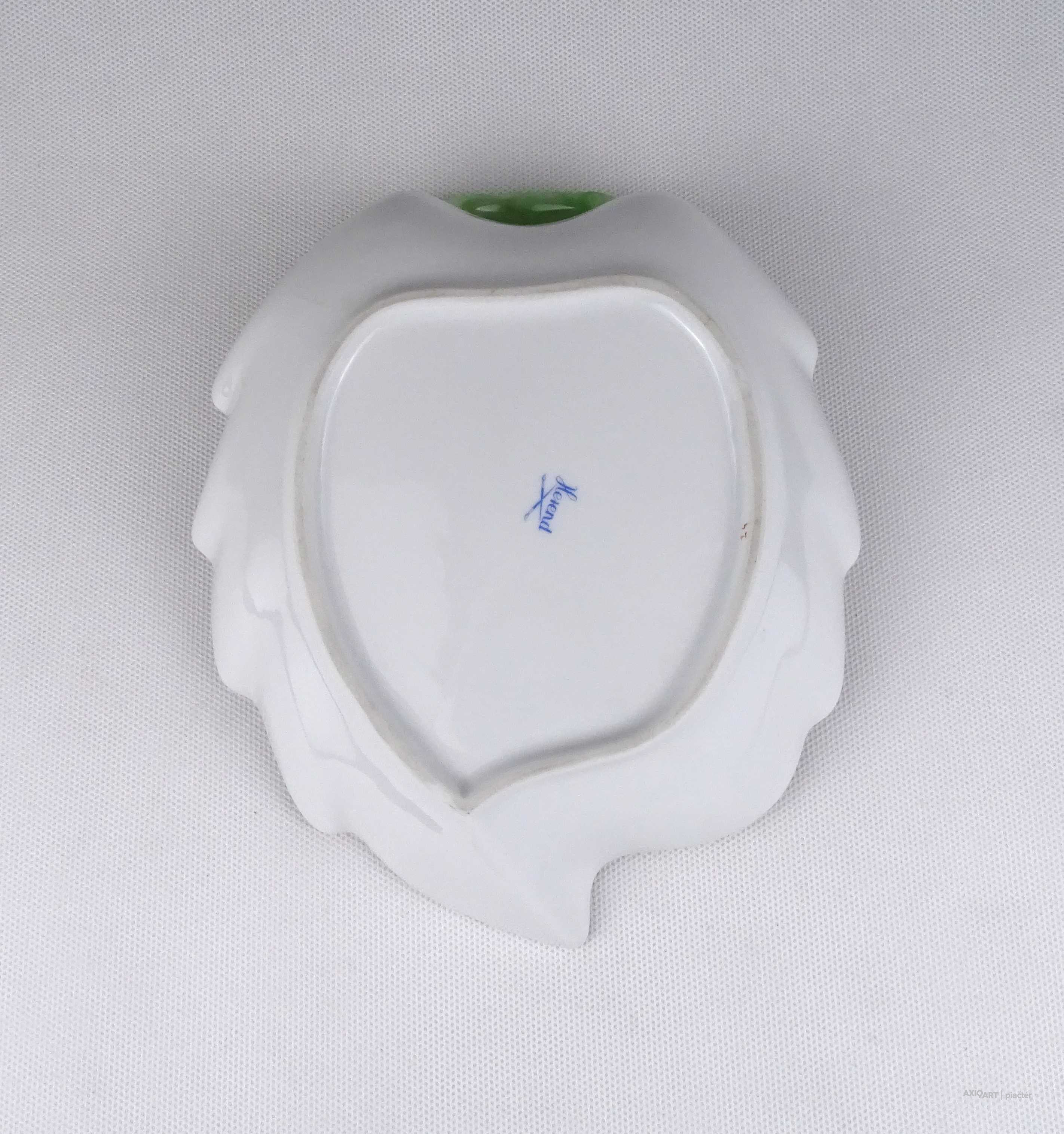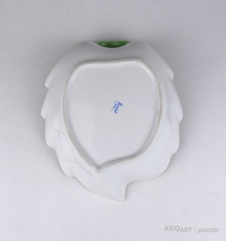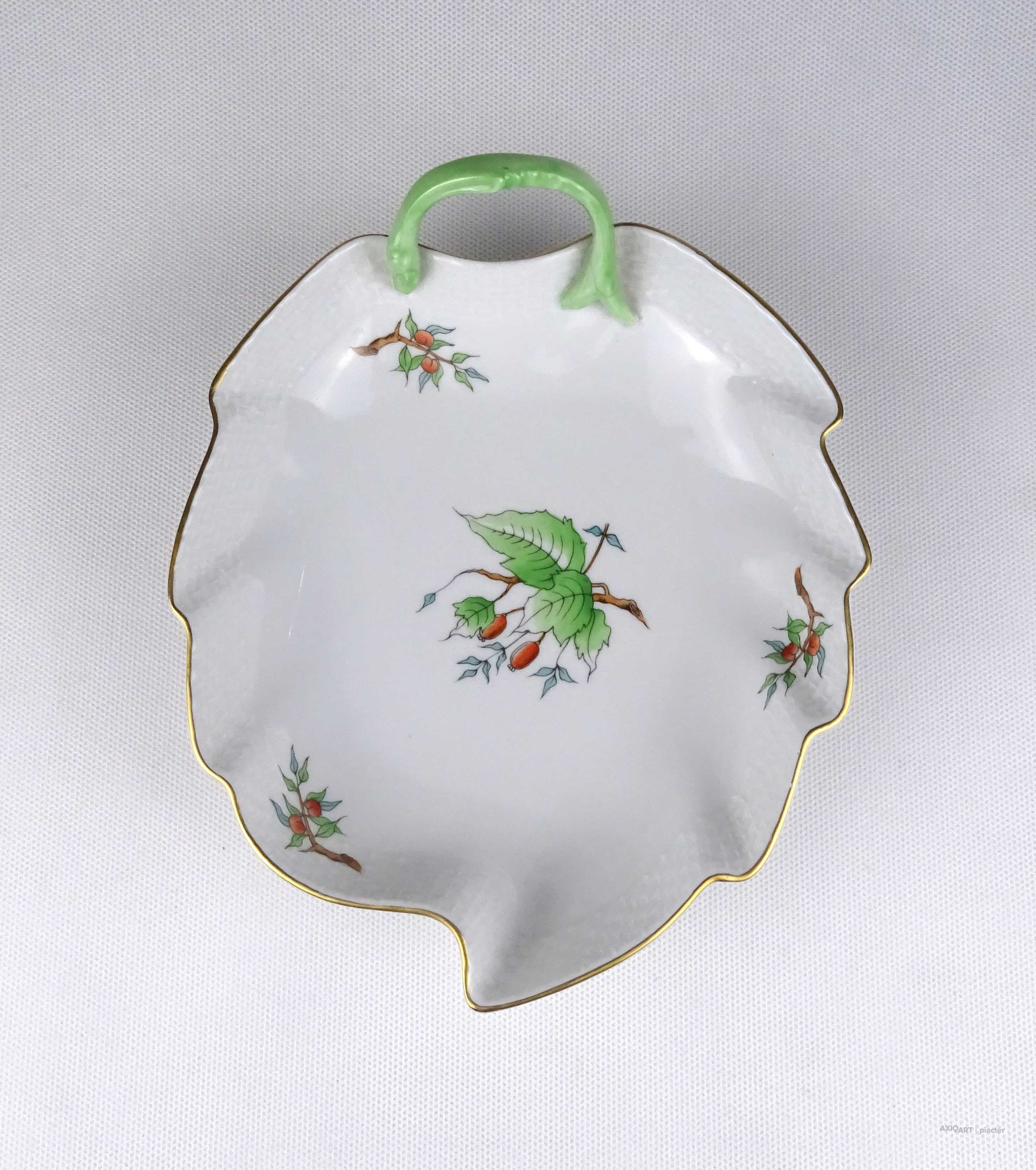 [1U428/X334] Hibátlan állapotú, kézzel festett aranyozott, hecsedli, csipkebogyó mintás, nagy levél alakú Herendi porcelán asztalközép kínáló tál. Alján kék ecsetes Herendi márkajelzés: HEREND Mélynyomással: HEREND Formaszám: 203 Magasság: 6.3 cm Szélesség: 16.5 cm Hosszúság: 19.5 cm Súly: 0.305 kg