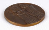 [1I390/X026] Hibátlan állapotú, jelzett bronz plakett szép bőrdíszműves bőr tokban. Elején plasztikus virágdíszítés mellett jelzés: KL Hátoldalán felirat: A KISZ. KIVÁLÓ PROPAGANDISTÁJA Súly: 0.485 kg Kutas László szobrász Budapest, 1936-04-17 Szerző: Matits Ferenc Gimnazistaként Sopronban Ágoston Ernő szabadiskolájában sajátította el a rajzművészet alapismereteit, majd 1954 és 1960 között a Magyar Képzőművészeti Főiskolára járt, ahol Gyenes Tamás és Pátzay Pál voltak a mesterei. Érzékletes mintázás, jó formaérzék, szellemes komponálás, választékos anyaghasználat tünteti ki plasztikai működését. A realista hagyományokra épülő, egyéni stílusát tükröző kő és bronz köztéri szobrokon kívül narratív kisplasztikákat, érmeket készít. A Magyar Nemzeti Bank pályázatain 11 alkalommal nyert emlékpénz készítésére megbízást. A firenzei Giorgio Vasari Nemzetközi emlékérem pályázaton 1974-ben I. díjat kapott, a Sportérem pályázaton 1975-ben II. és III. díjat, az Ezüstgerely pályázaton 1976-ban különdíjat érdemelt ki. 1979-ben a ravennai Dante Biennálé ezüst érmét, 1991-ben és 1995-ben pedig a soproni Országos Éremművészeti Biennálén Roisz Vilmos-díjat nyert. 1990 óta zsűritag a Ravennai Kisplasztikai Dante Biennálén. Figurális kisplasztikái egy-egy történetet mesélnek el. Az alakok kifejező megmintázása, környezetbe helyezése, dinamikus megfogalmazása elgondolkodásra késztetnek. Alkotásai népszerűek a hazai, valamint külföldi gyűjtők körében és szereztek a művésznek világhírnevet. Irodalom (kat. bev., Országos Széchenyi Könyvtár Galéria, 1994) ESZES A.: Otthon útközben. Műteremlátogatás ~nál, Anna, 1994/7. KOVÁCS P.: A tegnap szobrai, Szombathely, 1992 VEKERDY T.: ~ és szobrai, Várhely, 1997/3. Film BAYER I.: Művészportré, Civil Kurázsi Műsor, MTV, 1994-5. Egyéni kiállítások Egyéni kiállítások 1976 • Festőterem, Sopron • Haydn Művelődési Ház, Fertőd 1983 • Bank für Gemeinwirtschaft, Regensburg • Haydn Művelődési Ház, Fertőd • Munkás Művelődési Központ, Paks 1990 • Galerie Meerbusch, Düsseldorf 1993 • Városi Kórház Galéria, Grevenbroich (D) • Galerie Greve, Hamburg 1996 • G. P. Breughel, Venlo (gyűjt.) 1998 • Galéria, Tamási. Válogatott csoportos kiállítások Válogatott csoportos kiállítások Őszi Tárlatoknak és 1977-1999 • Országos Éremművészeti Biennáléknak. 1977-től vett részt a FIDEM nemzetközi kiállításain. A ravennai Dante Biennálén1975-ben, 1977-ben és 1979-ben vett részt. 1964 • Vásárhelyi Tárlatok 1954-1963, Magyar Nemzeti Galéria, Budapest 1968 • Az új Kecskeméti Művésztelep, Katona József Múzeum, Kecskemét 1970 • Kiállítás a Szakszervezetek Országos Tanácsa képzőművészeti pályázatára érkezett alkotásokból, Magyar Nemzeti Galéria, Budapest 1972 • 6. Balatoni Nyári Tárlat, Balatoni Múzeum, Keszthely 1974 • Vásárhelyi Tárlatok 1964-1973, Magyar Nemzeti Galéria, Budapest • G. Vasari nemzetközi Érembiennálé, Firenze 1976 • Balatoni Nyári Tárlat, Balatoni Múzeum, Keszthely 1979 • VI. Országos Kisplasztikai Biennálé, Pécs 1982 • Magyar mesterek, G. P. Breughel, Amszterdam 1990 • Ágoston Ernő tanítványai, Villamosipari Szakközépiskola Galéria, Sopron 1991 • Soproni Képes Céh Kiállítás, Collegium Hungaricum, Bécs • Soproni Képes Céh Kiállítás,Lajtaújfalu [Potzneusiedl] 1992 • Képes Céh Kiállítás, Lábasház, Sopron 1995 • Névjegy-érem kiállítás, OTP Galéria, Budapest 1996 • Képes Céh Kiállítás, Lábasház, Sopron. Művek közgyűjteményekben Művek közgyűjteményekben Királyi Éremtár, Stockholm Liszt Ferenc Múzeum, Sopron Városháza Gyűjteménye, Firenze Windsor Palota Gyűjteménye.  Forrás: artportal.hu