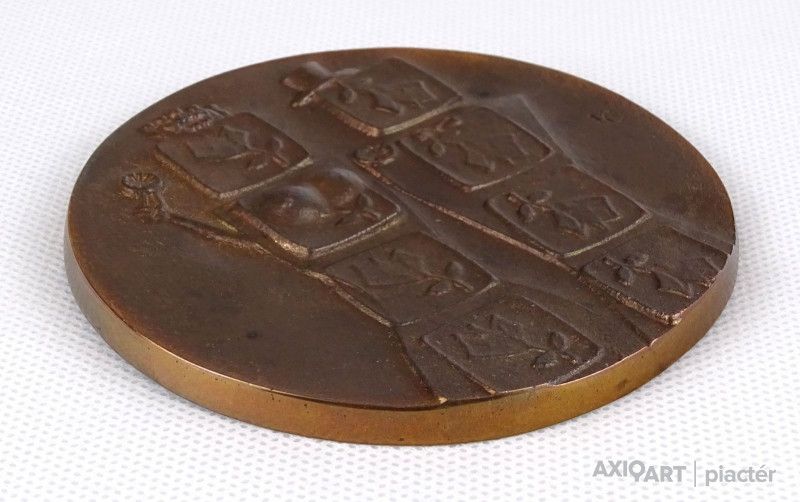 [0F946/X043] Hibátlan állapotú, kétoldalas bronz érem. Egyik oldalon felirat: ACHATIUS BARCSAI DE NAGYBARCSA Másik oldalon felirat: ÉREMGYŰJTŐK HAJDÚ-BIHAR MEGYEI SZERVEZETE 1925 - 1988 Jelzés: TS TÓTH S. Szélesség: 4.2 cm Súly: 0.03 kg Tóth Sándor (1933) szobrász szobrász Születési hely: Miskolc Születési dátum: 1933     Mesterei: Hincz Gyula, Pap Gyula, Barcsay Jenő, Kisfaludi Strobl Zsigmond. 1951-1959: Magyar Képzőművészeti Főiskola, mesterei: Hincz Gyula, Pap Gyula, Barcsay Jenő, Kisfaludi Strobl Zsigmond. 1959-ben a művészeti főiskolák Tanácsköztársasági Pályázatának nagydíját nyerte el. 1959-1960-ban a Művészeti Alap ösztöndíjával a hódmezővásárhelyi telepen alkotott. 1961-ben Szegeden telepedett le és 1974-ig a Művészeti Gimnázium tanára. Ezt követően Nyíregyházán kapott műtermet, ahol alkotótevékenysége mellett eredményes szakköröket vezetett. Egy évtizedig volt a szabolcsi művészek szervezetének titkára. Számos szegedi és nyíregyházi szobrászművészt indított el a pályán. 1977-ben kezdeményezte a Nyíregyháza-sóstói Nemzetközi Éremművészeti és Kisplasztikai Alkotótelep alapítását, az Alkotótelepi Tanácsnak indulástól fogva tagja. Főiskolás éveiben 1954-től nyaranta a hódmezővásárhelyi, 1969-ben a zsennyei, 1971-1975 között a villányi, 1973-ban a kecskeméti és oronskói (PL), 1974-1976 között, 1983-ban, 1985-ben, 1991-ben a nyíregyháza-sóstói, 1975-ben a burgaszi (BG), 1976-ban a potsdami (Német Demokratikus Köztársaság) és a zamosci (PL); 1977-ben a rzeszówi (PL), 1988-ban a palangai (Litvánia), a dzintari-i (Lettország) és a zsdennyevoni (UA), 1988-ban a körmöcbányai, 1992-ben a klaipédai (Litvánia) művésztelepen dolgozott. Eredményes munkásságát számos elismerés jelzi: 1962: Szegedi Nyári Tárlat III. díja; 1963: Szegedi Nyári Tárlat II. díja; 1964: Alföldi Tárlat díja, Gyula; 1968: Szegedi Nyári Tárlat díja; 1969: Szocialista Kultúráért; 1970: Békéscsabai Alföldi Tárlat Nívódíja; 1972: Szegedi Nyári Tárlat díja; Szabadka Város díja; 1973: Békéscsabai Alföldi Tárlat Munkácsy Emlékérme; 1974: Firenzei Giorgio Vasari Nemzetközi Éremverseny 3. díja; 1975: Felszabadulási Pályázat III. díja, Hódmezővásárhely; 1982: Munkácsy-díj; 1984: Szegedi Nyári Tárlat díja; 1986: a Magyar Éremgyűjtők Egyesülete az év legszebb egyesületi érme kitüntetése; 1989: Iserlohn Város díja; 1991: VI. Pál pápa ezüst Emlékérme; 1995: Ravenna Város Aranyérme; 1996: Hatvani Portré Biennálé díja; 1997: Hadtörténeti Múzem Kiállítási díja; Szeged Megyei Jogú Város Polgármesteri Hivatala díja. Az 1986-1987-es tanévben az Egri Tanárképző Főiskola tanszékvezető főiskolai tanára volt. Első kiállításain a szobrászati alkotások mellett festmények és rajzok is helyt kaptak. Rézlemez-domborításai és kisplasztikái témáit leginkább családja életéből vette. Realista stílusú - ritkán absztrakt felfogású (Madarak és halak sorozat, 1972) - alkotásai leggyakrabban bronzból készülnek, de jól bánik más anyagokkal is. Korábban gyakran készített terrakotta, mészkő-, márvány- és faszobrokat. Számos köztéri munkát készített, melyek között emléktáblák, emlékművek, büsztök, önálló térplasztikák sorakoznak. Legmonumentálisabb alkotásaként tarjuk számon a máriapócsi Bazilita templom kapuját. Vert és öntött érmeket is készít. Jelentős emlékérmeinek és orvosi vonatkozású érmeinek száma. Forrás: artportal.hu