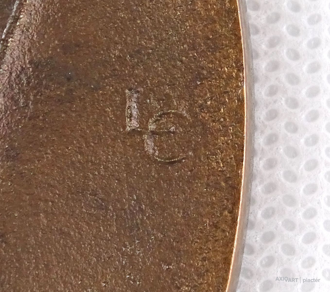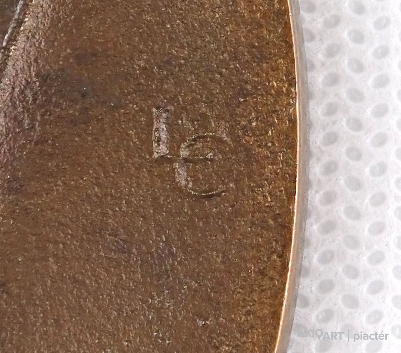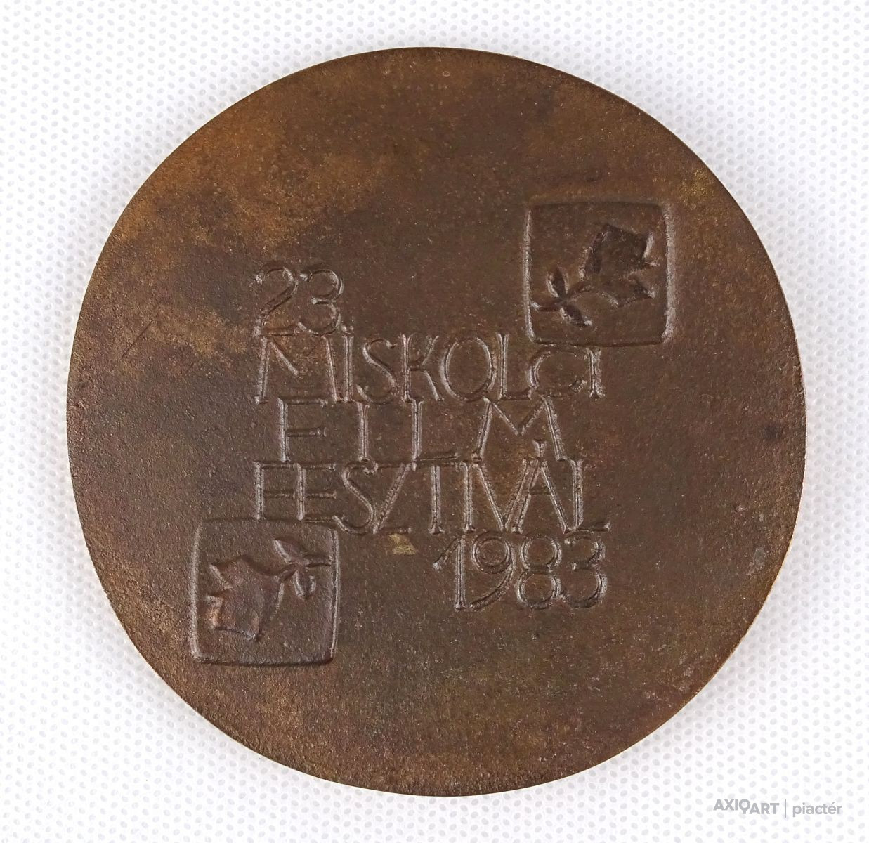 [1M136/X000] Kétoldalas jelzett Ligeti Erika plakett, bronz emlék plakett. Egyik oldalon felirat: 21. MISKOLCI FILM FESZTIVÁL 1983 Másik oldalán plasztikus hölgy és kalapos férfi díszítés látható. Jelzés: LE (L.E.) Szélesség: 9 cm Súly: 0.265 kg Ligeti Erika éremművész, szobrász Budapest, 1934-03-30 Elhalálozott: Szentendre, 2004. július 30. 1952-1958: Magyar Képzőművészeti Főiskola, mestere: Szabó Iván. 1964-1967: Derkovits-ösztöndíj; 1968: X. Szegedi Nyári Tárlat díja; 1972: Munkácsy-díj; 1973: Tornyai-plakett; 1974: IV. Országos Kisplasztikai Biennálé I. díj, Pécs; 1980: Kulturális Minisztérium díja; 1981: III. Országos Éremművészeti Biennálé díja, Sopron; 1983: Szakszervezetek Országos Tanácsa-díj; 1985: érdemes művész; 1993: Symposion-díj, Országos Éremművészeti Biennálé; 1994: az év koszorús szobrásza. 1993-tól a Széchenyi Művészeti Akadémia tagja, a MANIANA nevű nemzetközi művészeti csoport alapítója. 1955-től kiállító művész, elsősorban kisplasztikákat, portrékat és érmeket készít. 1959-1964 között rajztanár, 1965-1966-ban meghatározó élményt jelentett számára a hódmezővhelyi művésztelepen töltött időszak. 1969-től a szentendrei új művésztelepen él. Műveit lírai hangvételű, érzelemgazdag ábrázolásmód, derű és életöröm jellemzi. Érmészetének játékos formavilága a humor iránti érzékenységéről tanúskodik, sőt a groteszk megfogalmazás sem áll tőle távol. Sziporkázó ötletgazdagsága időről időre magától értetődő természetességgel újítja meg a mintázás klasszikus formarendjét. Szobrászatának központi témája az emberi figura. Kisplasztikák, érmek, portrék és monumentális alkotások készülnek műhelyében, amelyeknek legjellemzőbb vonása a játékosság, az ironikus valóságlátás és valóságláttatás, a groteszk szemlélet. Műveinek domináns anyaga a bronz, de farag követ is. Játékossága, ötletgazdagsága legfőként éremművészeti, a hagyományos, klasszikus érem-műformát felbontó munkáiban bomlik ki. Irodalom PERNECZKY G.: Két kiállítás, Élet és Irodalom, 1969. május 24. Érmek - gondok, Élet és Irodalom, 1969. szeptember 6. TÓTH E.: ~ és Nagy B. István, Művészet, 1970/7. MÉSZÖLY M.: ~, Nagy B. István kiállítása, Művészet, 1971/8. PASSUTH K.: Egy groteszk szobrász - ~, Tükör, 1971. február 23. Képzőművészeti Almanach 1, Bp Képzőművészeti Almanach 2, Budapest SZ. KÜRTI K.: Három szentendrei éremművész kiállítása, Alföld, 1972/2. Magyar érem antológia 1945-1976, Kritika, 1977/10. TÓTH A.: A bábubáliak és "Luca babám", ~ művészete, Művészet, 1981/12. A gesztus, Művészet, 1983/2. TÓTH A.: Míves, játékos érmek, ~, Művészet, 1989/11-12. Filmek Tv-G., 1969. május 8. Tv: Tárlatról tárlatra 1971. március 16. Képes Krónika, Tv 1974. október 14. Egyéni kiállítások Egyéni kiállítások 1966 • [Geszler Máriával, Szöllőssy Enikővel], Tornyai János Múzeum, Hódmezővásárhely • Művészklub, Kecskemét • Képzőművészeti Baráti Kör, Rákosliget 1969 • Derkovits Terem, Budapest • Művelődési Ház, Eger 1971 • Hármak: ~, Asszonyi T., Csíkszentmihályi R., Művelődési Ház, Balmazújváros • Berettyóújfalu • Derecske • Megyei Művelődési Központ, Tatabánya [Nagy B. Istvánnal] • Műcsarnok, Kamarat. Hármak, Déri Múzeum, Debrecen 1973 • Hármak, Dobó István Múzeum, Eger • Művésztelepi Galéria, Szentendre [Bartl Józseffel] • Arany János Múzeum, Nagykőrös 1974 • Savoyai-kastély, Ráckeve • Helikon Galéria, Budapest • Hármak, Móra Ferenc Múzeum, Szeged 1983 • Madách Művelődési Központ, Vác • Szentendrei Képtár, Szentendre 1985 • Megyei Művelődési Központ, Nyíregyháza • Jókai Klub, Budapest • Iskolagaléria, Dunakeszi • Alföldi Galéria, Budapest 1987 • Mini Galéria, Miskolc 1993 • Kaposfüredi Galéria [V. Halmos Klárával] • Vörösmarty Művelődési Központ, Bonyhád • Lábasház, Sopron Válogatott csoportos kiállítások Válogatott csoportos kiállítások 1955 • 6. Magyar Képzőművészeti kiállítás, Műcsarnok, Budapest 1960 • 8. Magyar Képzőművészeti kiállítás, Műcsarnok, Dolgozó emberek között, Ernst Múzeum, Budapest 1962 • 9. Magyar Képzőművészeti kiállítás, Műcsarnok, Budapest 1965 • 10. Magyar Képzőművészeti kiállítás, Műcsarnok, Budapest 1966 • Stúdió ’66, Ernst Múzeum, Budapest;1968 • Stúdió 58-68, 11. Magyar Képzőművészeti kiállítás, Műcsarnok, Budapest 1969 • II. Országos Kisplasztikai Biennálé, Pécs 1972 • Stúdió ’72, Ernst Múzeum, Budapest 1974 • Kisplasztikai Biennálé, Pécs 1975 • Jubileumi Képzőművészeti kiállítás, Műcsarnok, Budapest 1976 • V. Országos Kisplasztikai Biennálé, Pécs 1978 • IV. Budapesti Nemzetközi Kisplasztikai kiállítás (B), Műcsarnok, Budapest • I. Országos Éremművészeti Biennálé, Sopron, Szobrászat ’78, Műcsarnok, Budapest 1979 • VI. Országos Kisplasztikai Biennálé, Pécs 1984 • Országos Képzőművészeti Kiállítás ’84, Műcsarnok, Budapest 1991 • XII. Országos Kisplasztikai Biennálé, Pécsi Galéria, Pécs 1994 • IX. Országos Éremművészeti Biennálé, Sopron. Művek közgyűjteményekben Művek közgyűjteményekben Ferenczy Múzeum, Szentendre Janus Pannonius Múzeum, Pécs Sárospataki Galéria, Budapest Vay Ádám Múzeum, Baja.  Forrás: artportal.hu