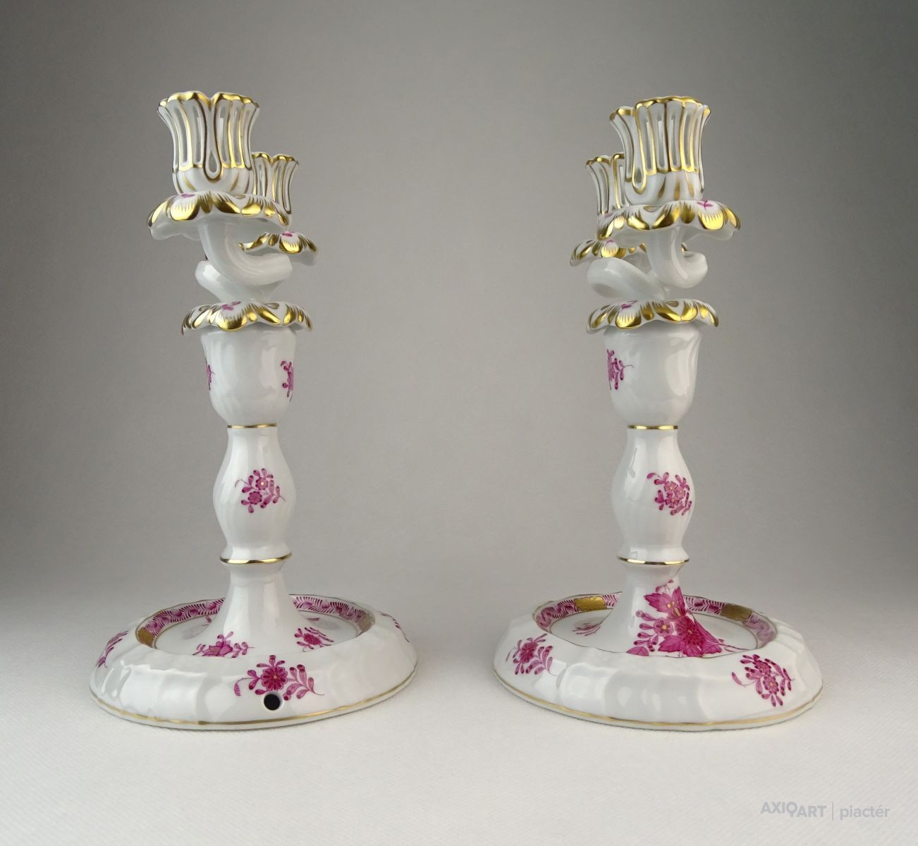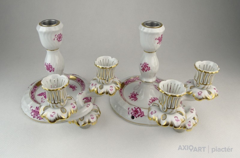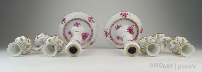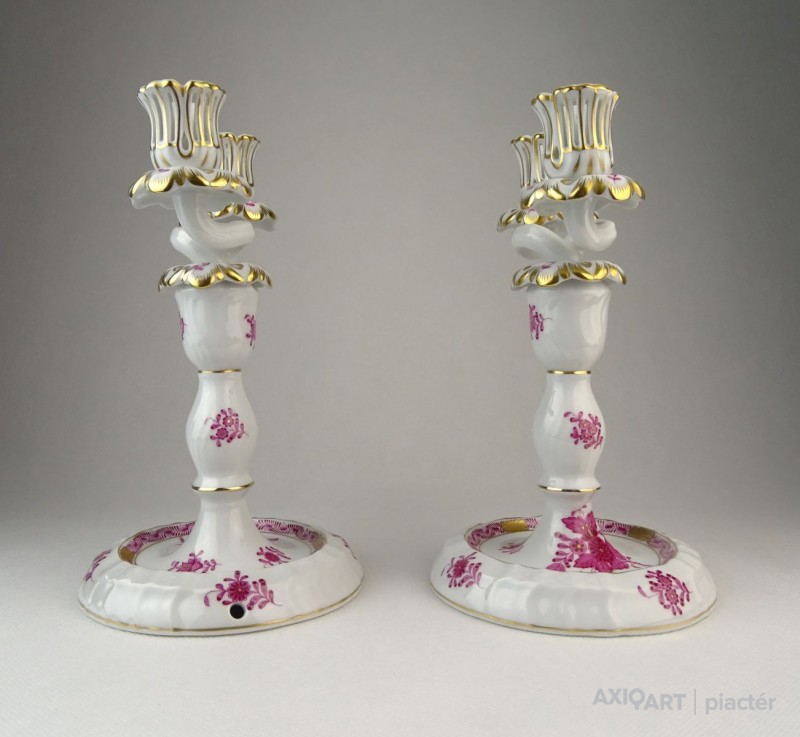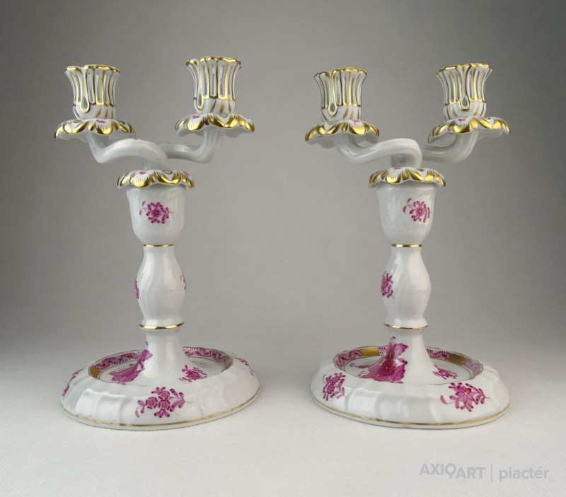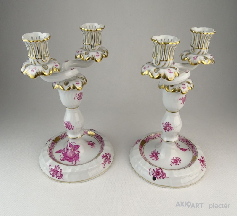 Hibátlan állapotú, talpas lila Apponyi mintás Herendi porcelán gyertyatartó páros. Egyes és kettes pozícióban is használható. Aranyozása is kopásmentes, ajándékozható állapotban van.
