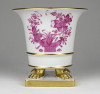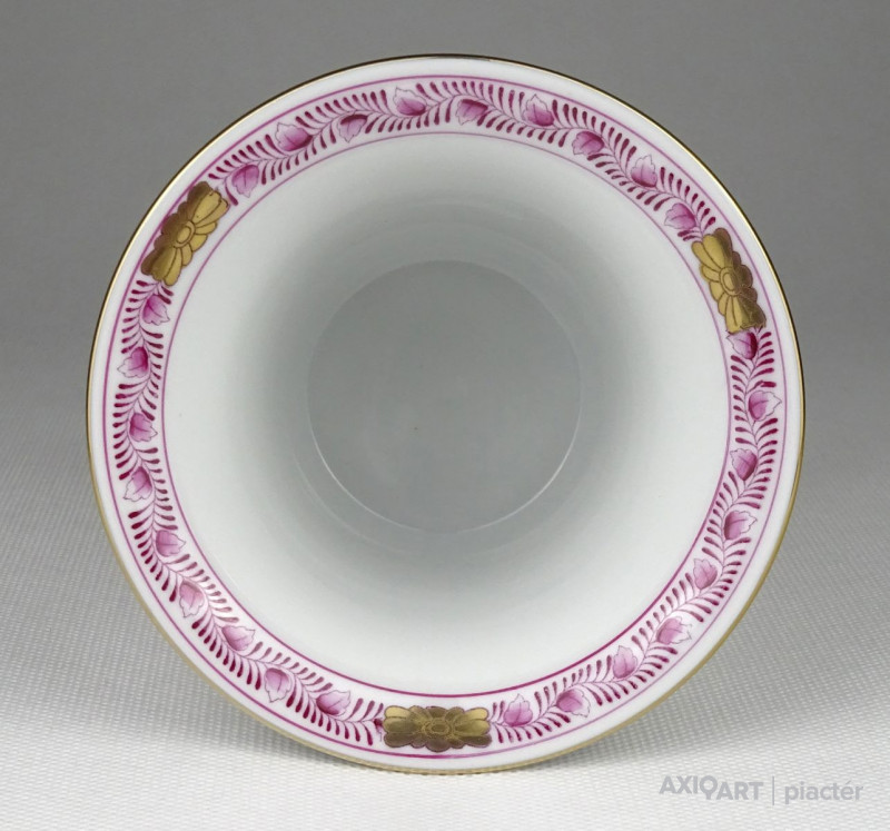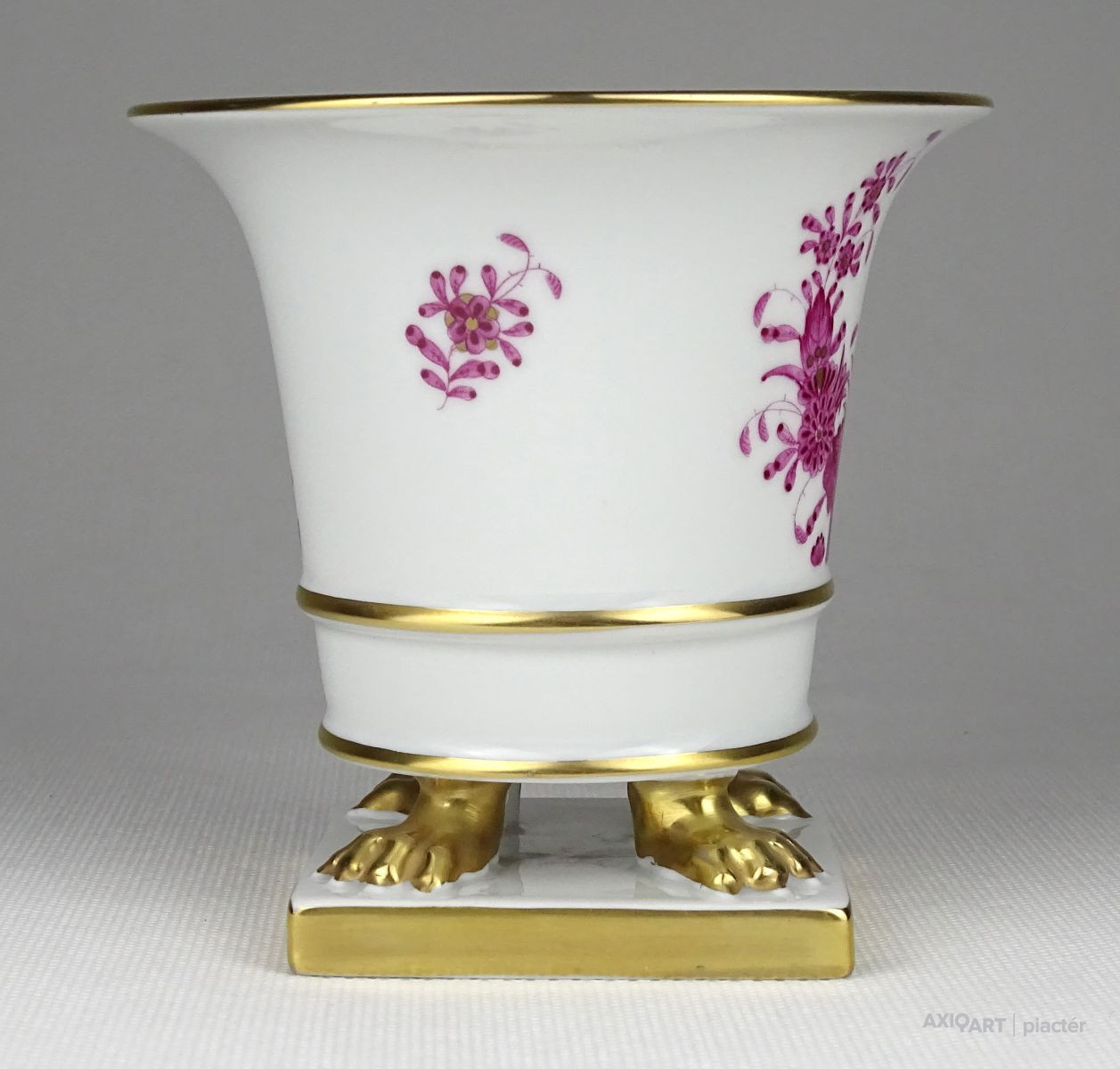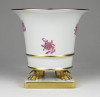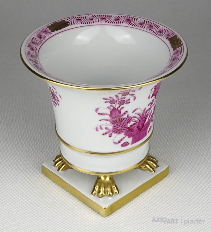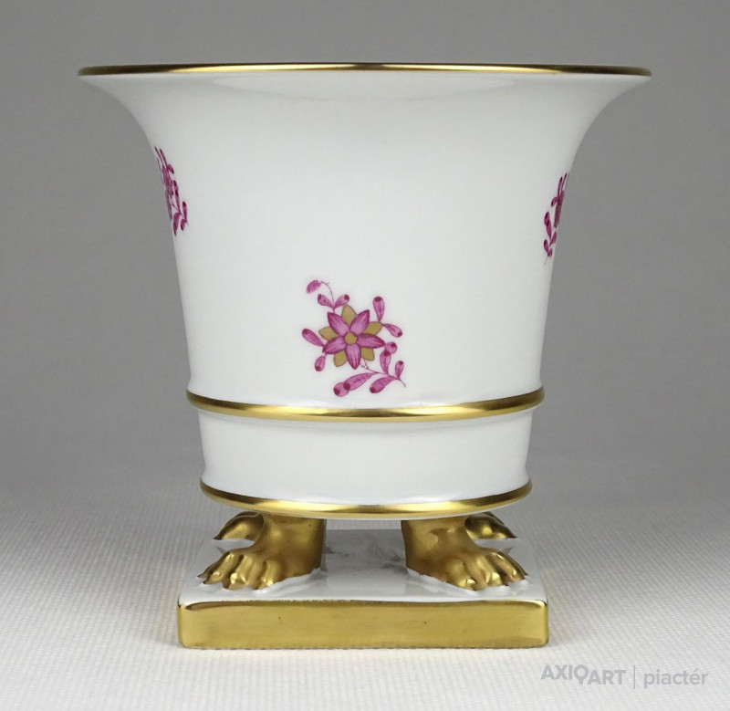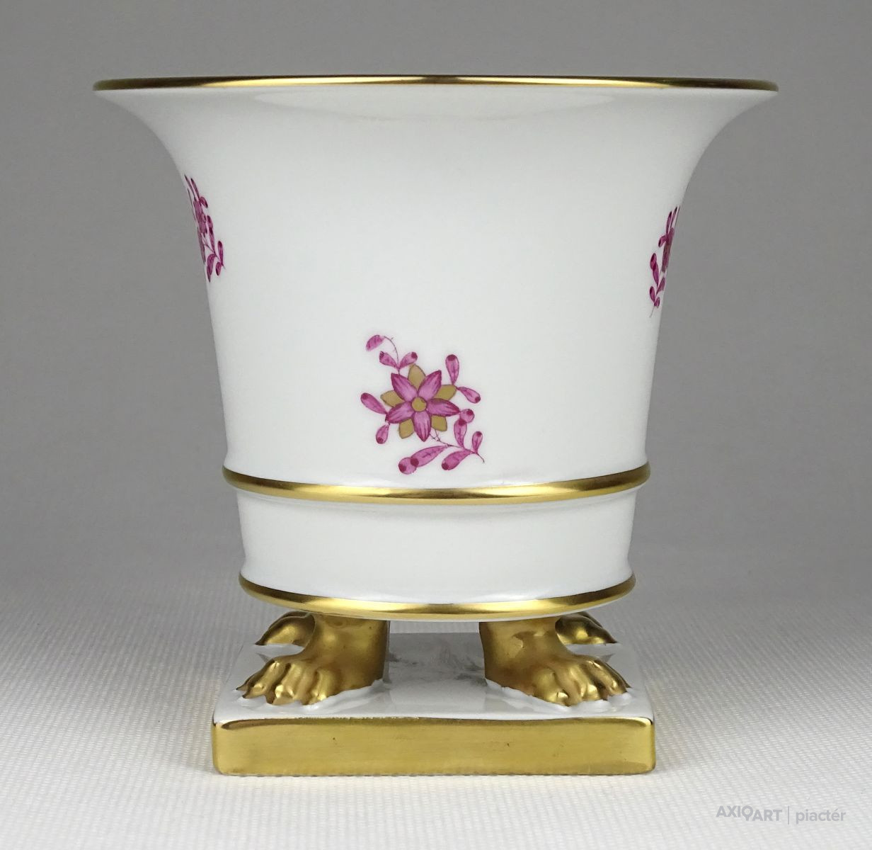 Hibátlan állapotú, kézi festésű lila indiai kosár (Fleurs des Indes) mintával díszített, oroszlánlábakon álló, kis méretű Herendi porcelán kaspó.
