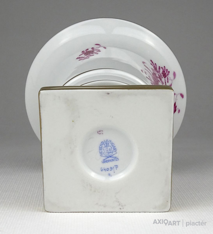 [1Q673/BX-8] Hibátlan állapotú, kézi festésű lila indiai kosár (Fleurs des Indes) mintával díszített, oroszlánlábakon álló, kis méretű Herendi porcelán kaspó. Alján kék Herendi jelzés: HEREND HUNGARY HANDPAINTED Mélynyomással: HEREND Formaszám: 6403/P Magasság: 10 cm Szélesség: 10.5 cm Súly: 0.3 kg