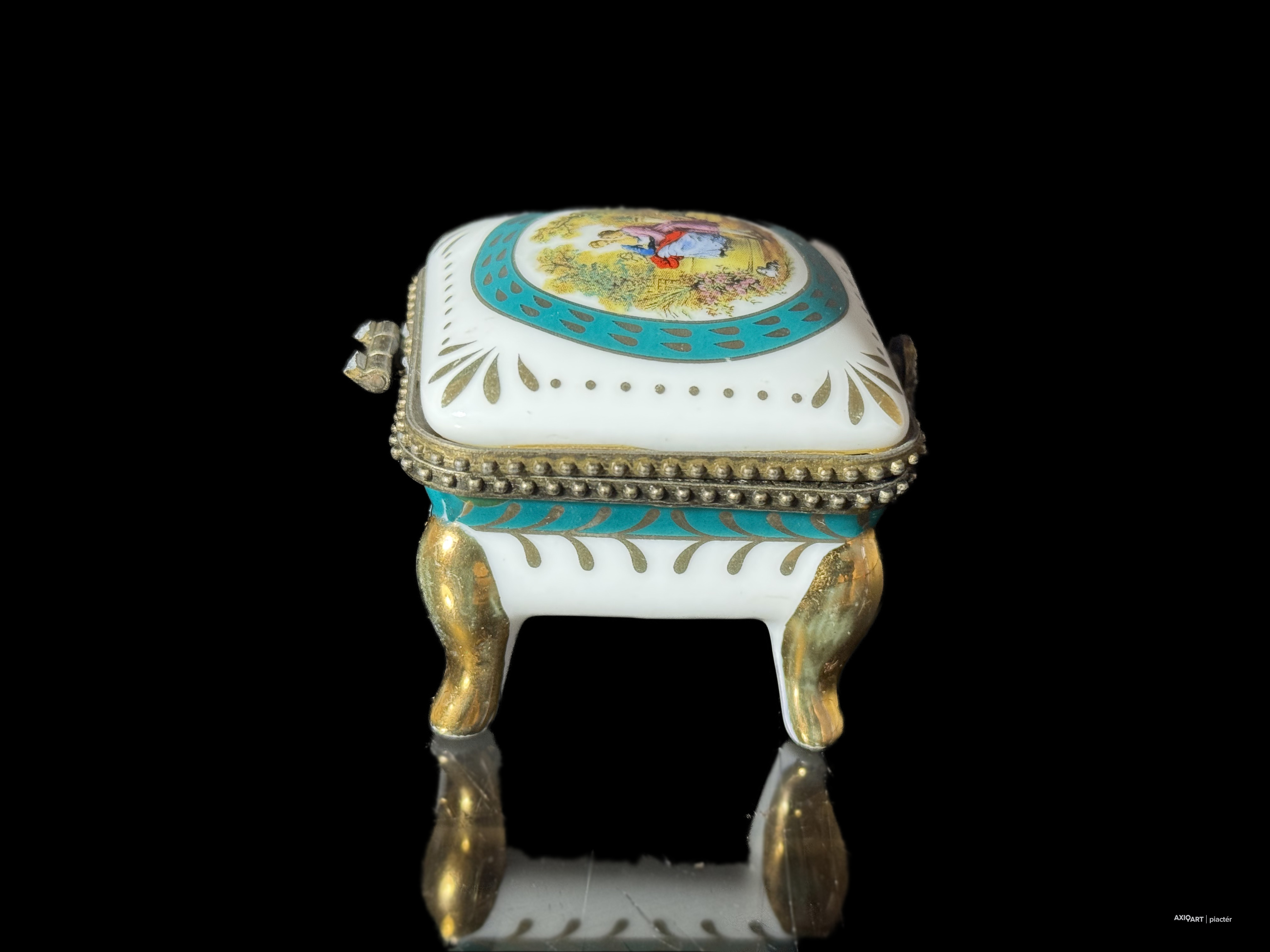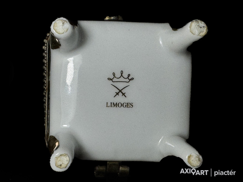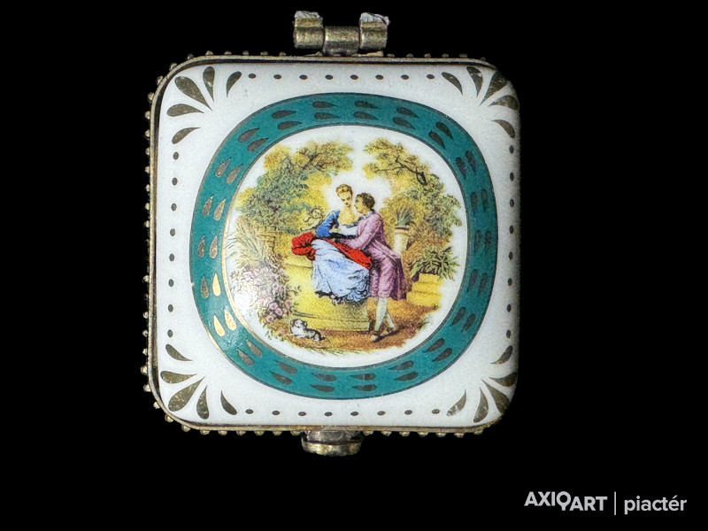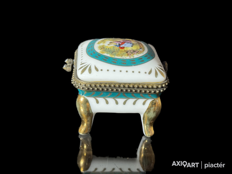 aranyozott-matricás porcelán, fém szerelékkel, XX-XXI. század forduló, aranyozás kopottas, zsanér törött, 5 cm magasság