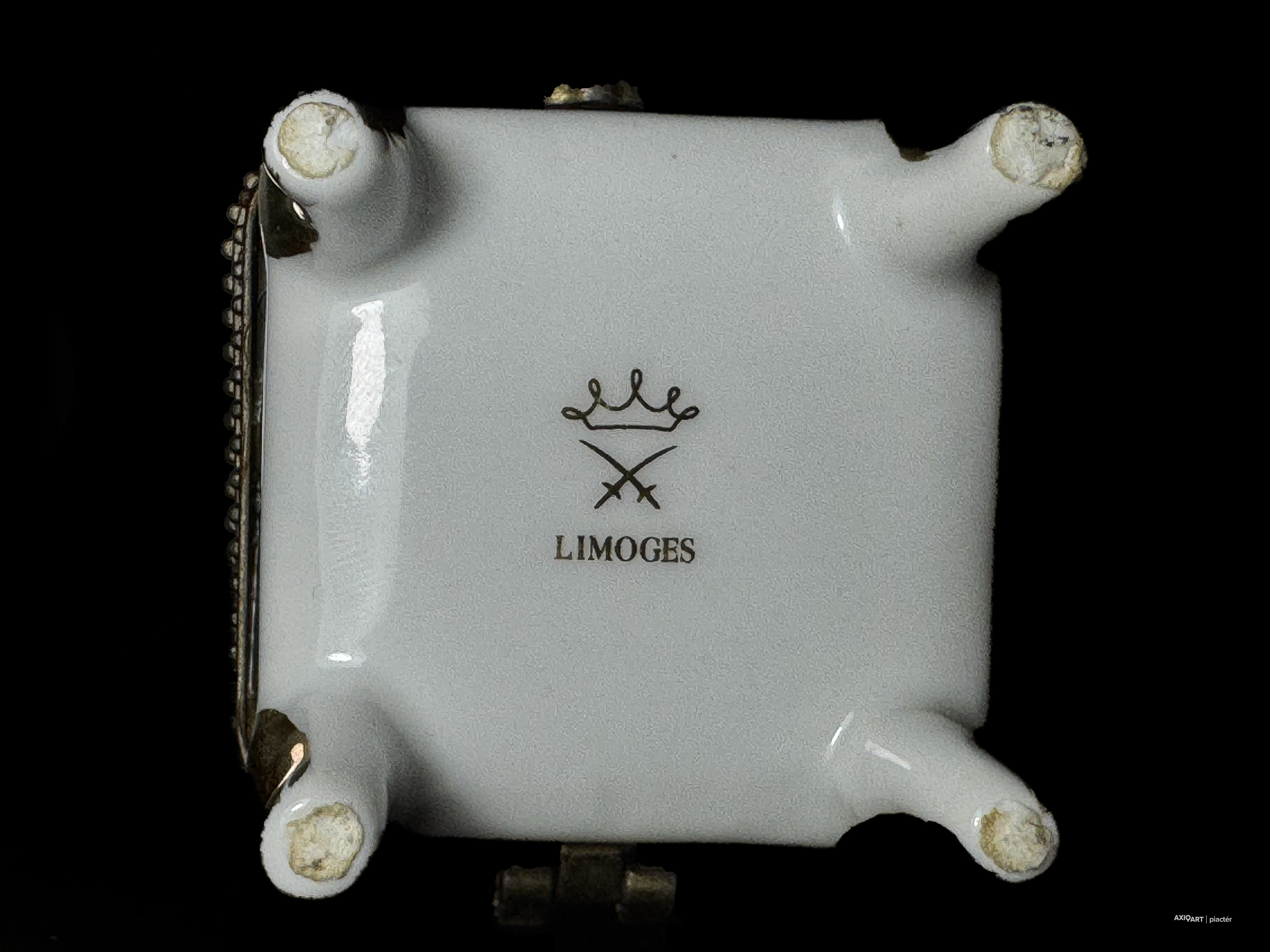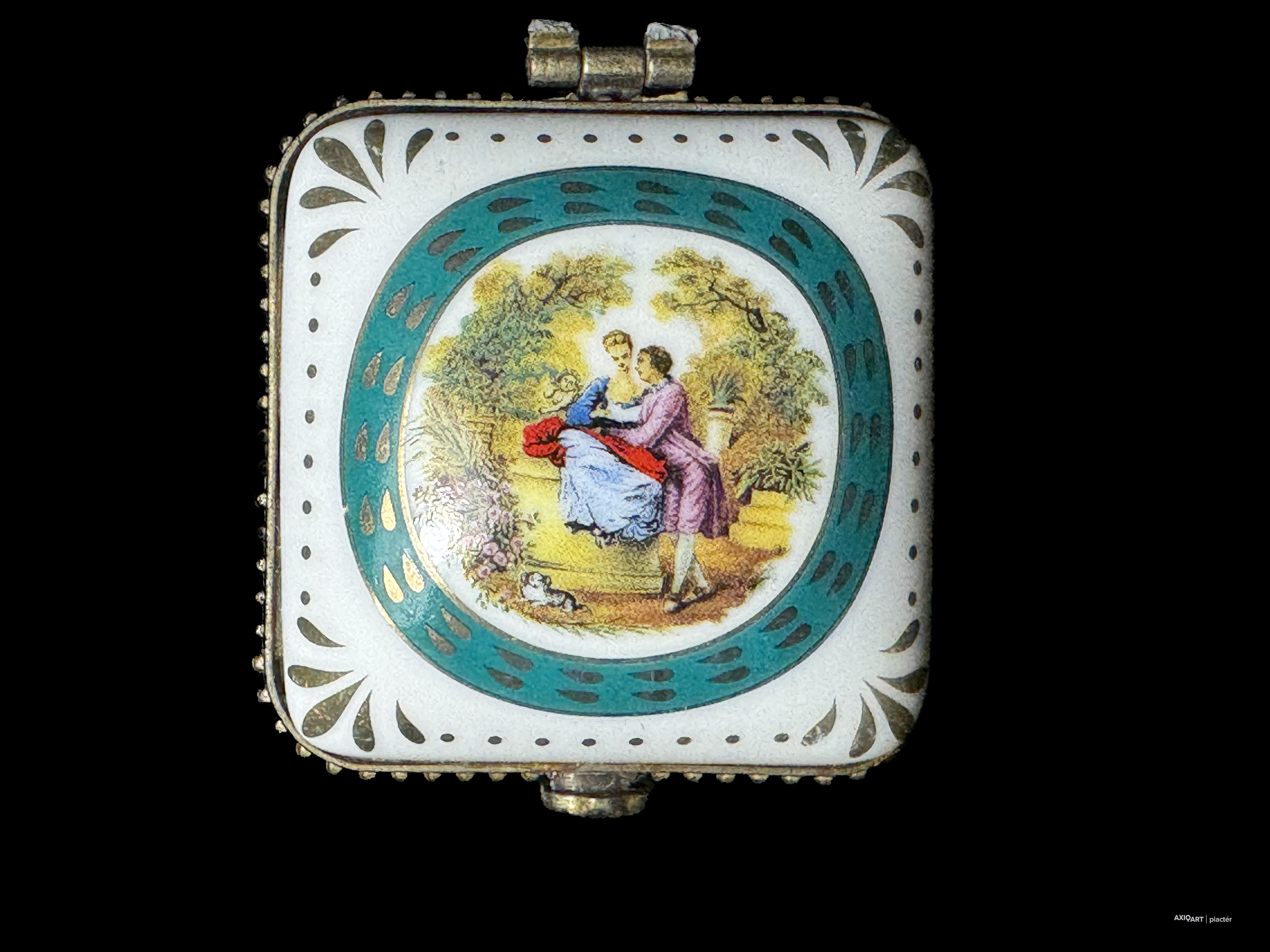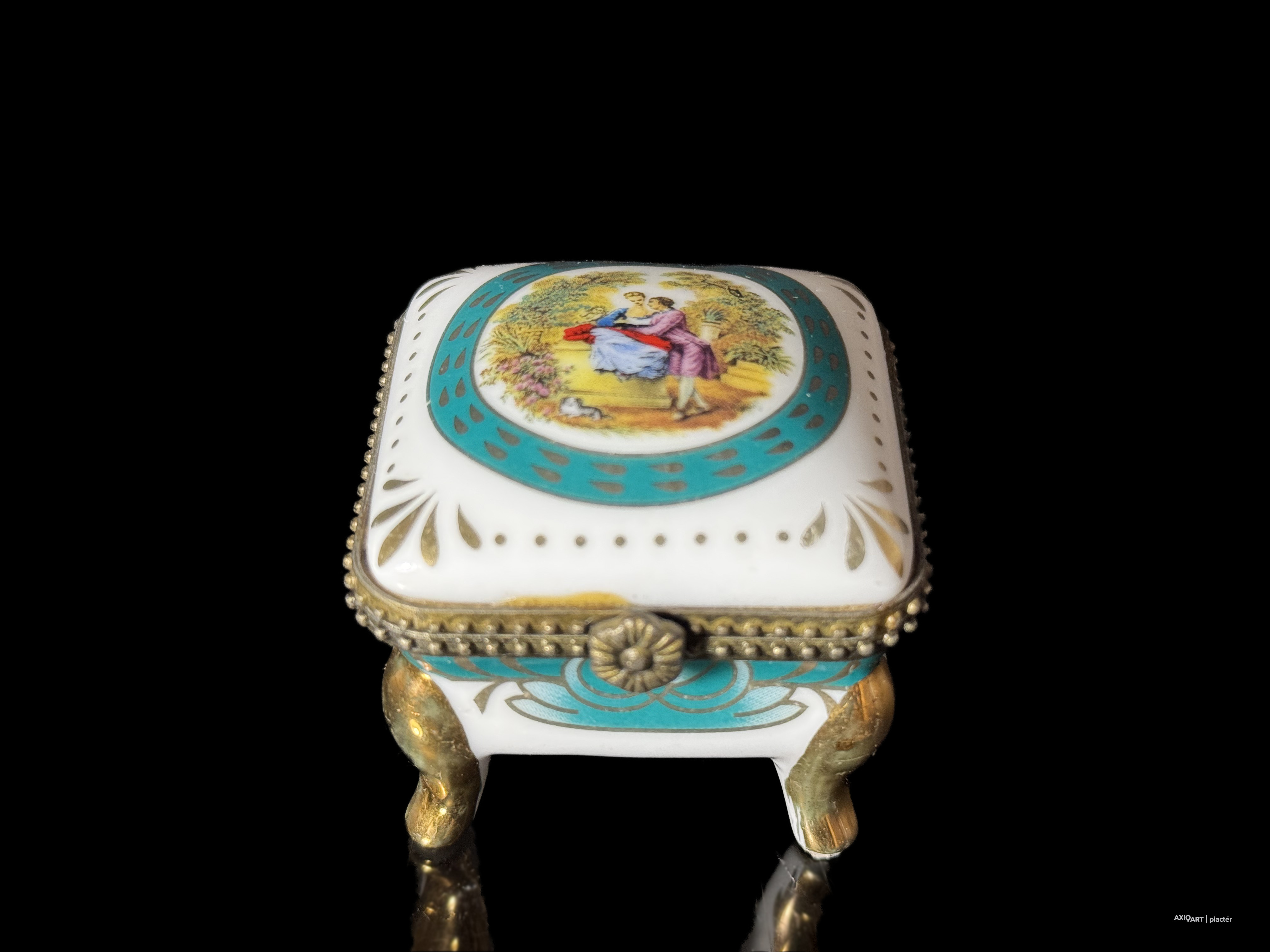aranyozott-matricás porcelán, fém szerelékkel, XX-XXI. század forduló, aranyozás kopottas, zsanér törött, 5 cm magasság