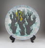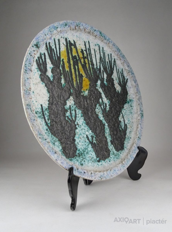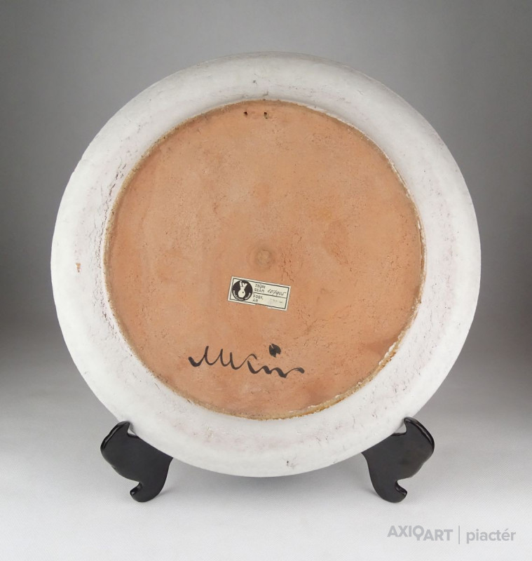 [0X682/Z064] Szép állapotú, jelzett, ártéri fa díszítésű samott fali dísztál, dísztányér. Alján karcolt jelzés: M KISS Alján zsűricímke: IPARMŰVÉSZETI VÁLLALAT ZSŰRISZÁM: 107905 Szélesség: 35.5 cm Súly: 1.49 kg Kiss Katalin, M. keramikus Születési hely: Debrecen Születési dátum: 1941 Kiállítások az adatbázisban: Mesterei: Litkei József, Illés Gyula, Csekoszky Árpád, Jánossy György, Gádor István. 1967: Magyar Iparművészeti Főiskola, mesterei: Litkei József, Illés Gyula, Csekoszky Árpád, Jánossy György, Gádor István. Részt vesz a mártélyi, zsennyei, vásárhelyi művésztelepek munkájában. Tagja a Magyar Keramikusok Társaságának. Korai művei az üveg, fém kombinációjára épültek. A 80-as évektől reliefszerű, plasztikus faliképeket készített, amelyre rusztikusság, leegyszerűsítés jellemző. Egyéni kiállítások 1981 • Vasas Minigaléria, Budapest 1987 • Lágymányosi Galéria, Budapest 1989 • Csepel Galéria, Budapest 1991 • Művelődési Központ, Nádudvar • Kölcsey Kisgaléria, Debrecen Forrás: www.artportal.hu