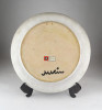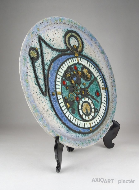 Hibátlan állapotú, jelzett, réz rátétes, óra díszítésű samott fali dísztál, dísztányér. Az egyik rátét máza sérült.