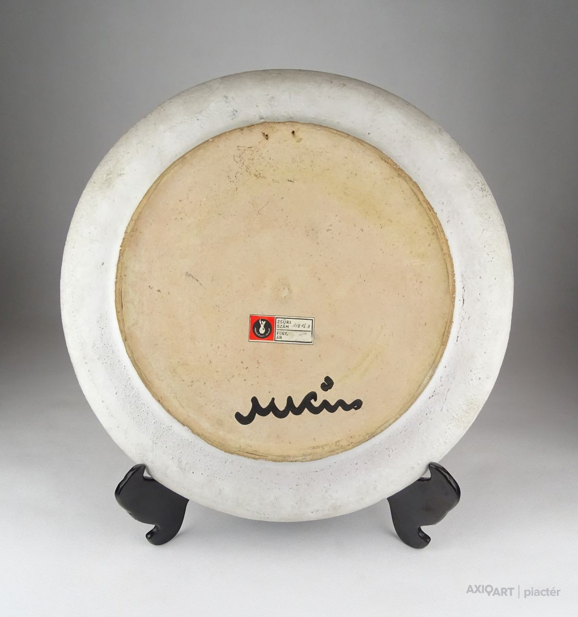 [0X683/BX-9] Hibátlan állapotú, jelzett, réz rátétes, óra díszítésű samott fali dísztál, dísztányér. Az egyik rátét máza sérült. Alján karcolt jelzés: M KISS Mellette Iparművészeti Vállalat címkéje, lásd fotó. Szélesség: 35 cm Súly: 1.54 kg Kiss Katalin, M. keramikus Születési hely: Debrecen Születési dátum: 1941 Kiállítások az adatbázisban: Mesterei: Litkei József, Illés Gyula, Csekoszky Árpád, Jánossy György, Gádor István. 1967: Magyar Iparművészeti Főiskola, mesterei: Litkei József, Illés Gyula, Csekoszky Árpád, Jánossy György, Gádor István. Részt vesz a mártélyi, zsennyei, vásárhelyi művésztelepek munkájában. Tagja a Magyar Keramikusok Társaságának. Korai művei az üveg, fém kombinációjára épültek. A 80-as évektől reliefszerű, plasztikus faliképeket készített, amelyre rusztikusság, leegyszerűsítés jellemző. Egyéni kiállítások 1981 • Vasas Minigaléria, Budapest 1987 • Lágymányosi Galéria, Budapest 1989 • Csepel Galéria, Budapest 1991 • Művelődési Központ, Nádudvar • Kölcsey Kisgaléria, Debrecen Forrás: www.artportal.hu