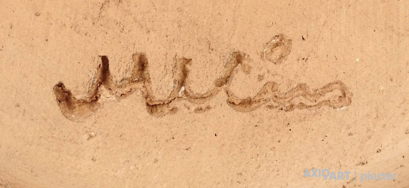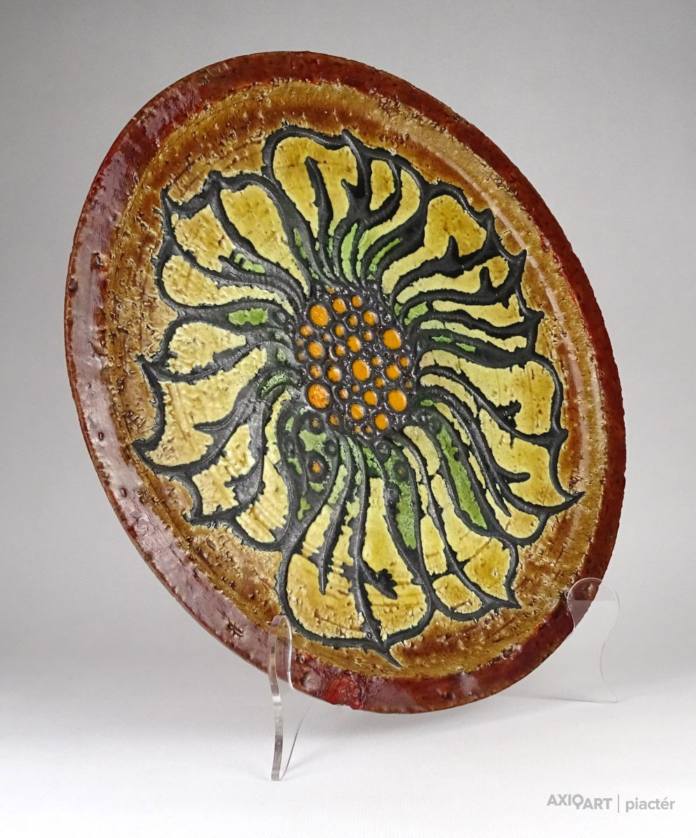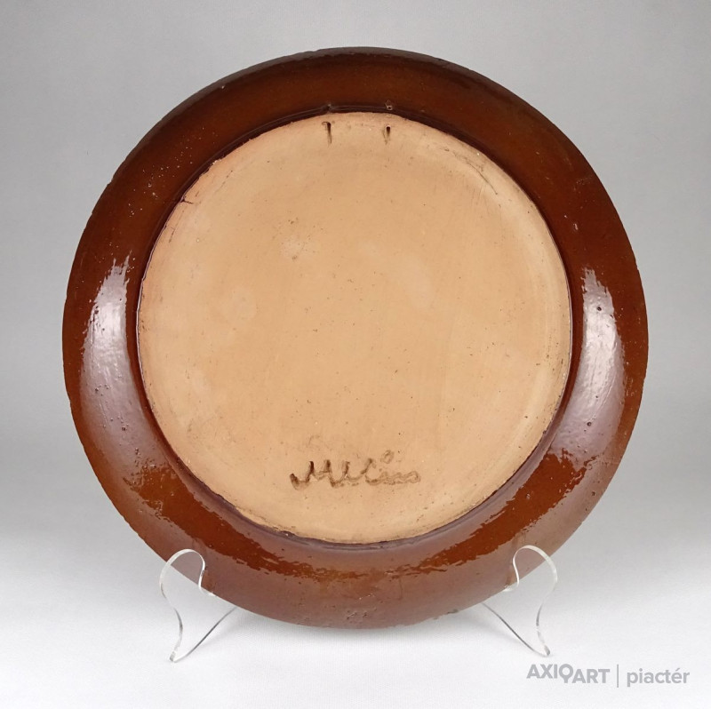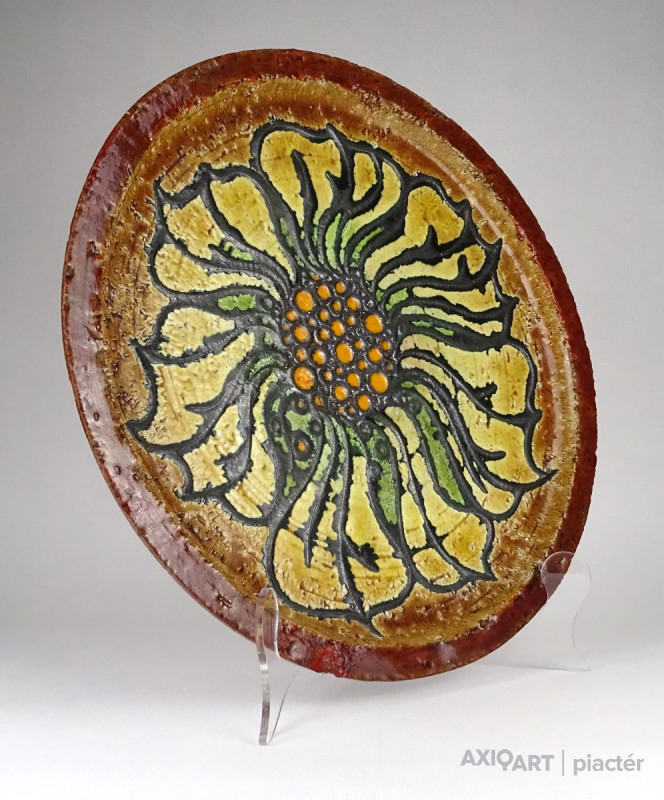 [1N932/Z064] Szép állapotú, jelzett, virág díszítésű samott fali dísztál, dísztányér. Alján karcolt jelzés: MKISS Szélesség: 35 cm Súly: 1.53 kg Kiss Katalin, M. keramikus Születési hely: Debrecen Születési dátum: 1941 Kiállítások az adatbázisban: Mesterei: Litkei József, Illés Gyula, Csekoszky Árpád, Jánossy György, Gádor István. 1967: Magyar Iparművészeti Főiskola, mesterei: Litkei József, Illés Gyula, Csekoszky Árpád, Jánossy György, Gádor István. Részt vesz a mártélyi, zsennyei, vásárhelyi művésztelepek munkájában. Tagja a Magyar Keramikusok Társaságának. Korai művei az üveg, fém kombinációjára épültek. A 80-as évektől reliefszerű, plasztikus faliképeket készített, amelyre rusztikusság, leegyszerűsítés jellemző. Egyéni kiállítások 1981 • Vasas Minigaléria, Budapest 1987 • Lágymányosi Galéria, Budapest 1989 • Csepel Galéria, Budapest 1991 • Művelődési Központ, Nádudvar • Kölcsey Kisgaléria, Debrecen Forrás: www.artportal.hu