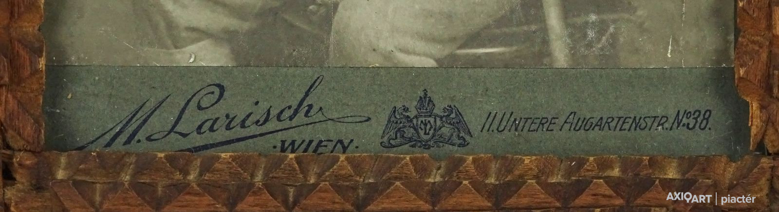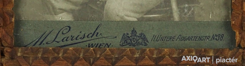 [1K096/X051] 25% ÁRENGEDMÉNY MINDEN TERMÉKÜNKRE Dec. 14-ig Antik faragott fa keretben, üveglap mögött található fekete-fehér katona fénykép, fotográfia. Feliratok: M. LARISCH WIEN II. UNTERE AUGARTEN STR. No 38. Magasság: 22 cm Szélesség: 16.5 cm Súly: 0.34 kg