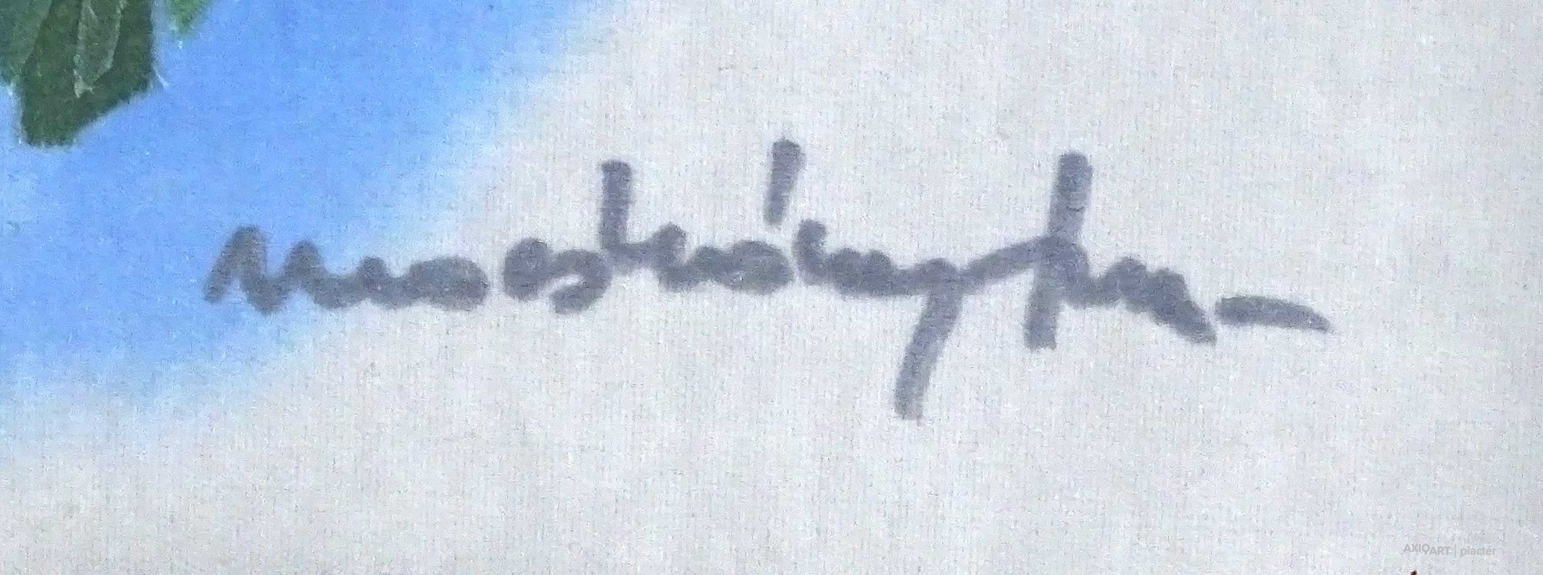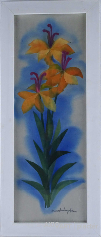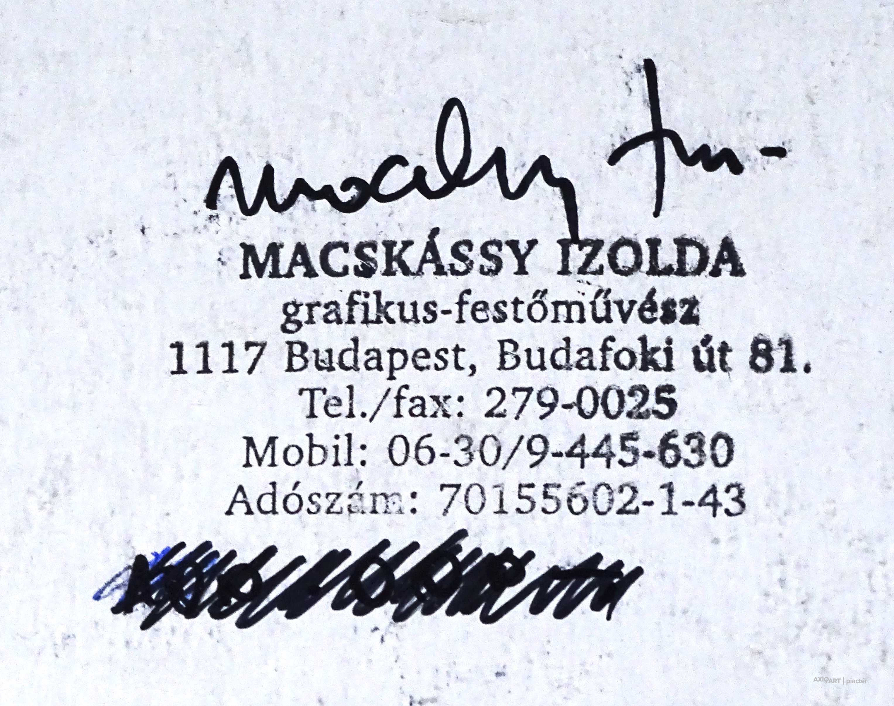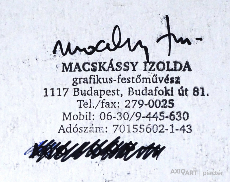 [FKB009/Bp73/23] A kép mérete: 49 x 70 cm keret nélkül. Készült: Tus, Selyem A kép Macskássy Izolda (Marosvásárhely, 1945) alkotása. Jelezve jobbra fent "Macskássy Izolda 1981" A festmény jó állapotban van. Keret: Ép Magyar festők és grafikusok életrajzi lexikona I-II. Festő. Művészeti tanulmányait a kolozsvári Képzőművészeti Főiskolán, majd ösztöndíjjal Ausztriában végezte. 1971 óta Magyarországon él és dolgozik. Számos erdélyi, magyarországi és külföldi tárlaton szerepelt alkotásaival. Munkásságát több díjjal és kitüntetéssel jutalmazták. Derűs hangvételű, életörömet sugárzó textilgrafikái és festményei elismerést hoztak számára, úgy itthon, mint külföldön. (MFGA) Magyar festők és grafikusok adattára Tanulmányait Erdélyben, majd román ösztöndíjjal Ausztriában és Bulgáriában végezte. 1968-ban diplomázott. 1971 óta magyar állampolgár. Sok hazai és külföldi kiállítás mellett grafikai pályázatokon vett részt, ahol díjakat nyert. Hatvanban és Kiskőrösön rendezett kiállításokon bemutatott munkáit kivétel nélkül selyemre festette. Derűs hangvételű, életörömet sugárzó textilgrafikái nagy sikert arattak. ÖLK Magyar festők és grafikusok életrajzi lexikona I-II. Műgyűjtők és kereskedők kézikönyve Festő. Művészeti tanulmányait a kolozsvári Képzőművészeti Főiskolán, majd ösztöndíjjal Ausztriában végezte. 1971 óta Magyarországon él és dolgozik. Számos erdélyi, magyarországi és külföldi tárlaton szerepelt alkotásaival. Munkásságát több díjjal és kitüntetéssel jutalmazták. Derűs hangvételű, életörömet sugárzó textilgrafikái és festményei elismerést hoztak számára, úgy itthon, mint külföldön. (MFGA)