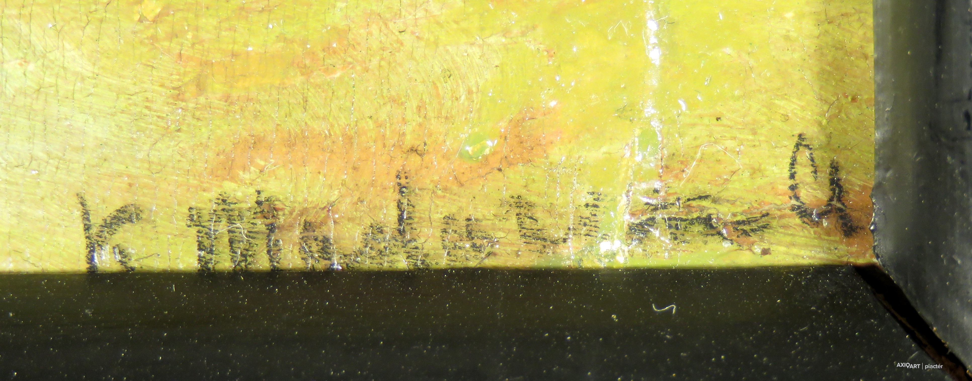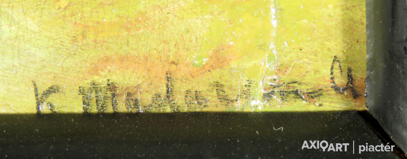 [FK2739/FL-4] A kép mérete: 33 x 48,5 cm keret nélkül. Készült: Olaj, Karton A kép Viski János (Szokolya, 1891, Budapest, 1970) alkotása. Jelezve Jobbra lent "Viski" A festmény jó állapotban van. Keret: Ép Magyar festők és grafikusok életrajzi lexikona I-II. Festő. A budapesti Képzőművészeti Főiskola Rajztanárképző szakán Zemplényi Tivadar növendéke volt. 1912-ben a kecskeméti művésztelep nyári tanfolyamán Olgyai Ferenc és Iványi-Grünwald Béla korrigálta. Tanulmányúton járt Franciaországban. 1913-tól főleg naturalista állatképeket állított ki a budapesti Műcsarnokban és a Nemzeti Szalonban. Számos tájképet is festett. A háború után több évig Dél-Amerikában dolgozott. 1929-től Budapesten tevékenykedett. 1930-ban a Független Művészek Társasága klubjában volt gyűjteményes tárlata. 1934-ben a Műcsarnokban "Hazafelé" című alkotására megkapta a Halmos Izor zsánerdíjat. "Terelés a Hortobágyon" című képének reprodukciója az 1934-es 50 pengős bankjegyet díszítette. Az állat (főleg a ló) karaktere, mozgási formaproblémái, a szabadtéri világítás színhatásai érdekelték impresszionista festőiséggel. Leggyakoribb modellje a ló. Több munkája a Magyar Nemzeti Galéria tulajdona. Művészete a természetből indul ki, annak formáihoz hű marad, képeiből mégis kiérezhető az egyéni temperamentumformáló ereje. (Éber, PZ-SzMF, KM) Magyar festők és grafikusok adattára A Képzőművészeti Főiskolán Zemplényi Tivadar növendéke. Tanulmányutakat tett Franciaországban és Dél-Amerika számos városában. 1913 óta állított ki. Főképpen állatképeket fest, bár témakörében más műfajok is szerepelnek. Az állat karaktere, mozgási és formaproblémái, a szabadtéri világítás színhatásai érdeklik impresszionista festőiséggel. Leggyakoribb modellje a ló. Festészete a természetből indul ki, annak formáihoz hű marad, képeiből mégis kiérezhető az egyéni temperamentumformáló ereje. - Irod:: Pipics Zoltán: Száz magyar festő. Bp. 1943. Magyar festők és grafikusok életrajzi lexikona I-II. Műgyűjtők és kereskedők kézikönyve Festő. A bp.-i Képzőművészeti Főiskolán Zemplényi Tivadar növendéke volt. Tanulmányúton járt Franciaországban. 1913-tól főleg naturalista állatképeket állított ki a Műcsarnokban és a Nemzeti Szalonban. A háború után több évig Dél-Amerikában dolgozott. 1929-től Budapesten tevékenykedett. 1930-ban a Független Művészek Társasága klubjában volt gyűjteményes kiállítása. 1934-ben a Műcsarnokban "Hazafelé" című festményére megkapta a Halmos Izor genreredíjat. "Terelés a Hortobágyon" c. képének reprodukciója az 1934-es 50 pengős bankjegyet díszítette. Az állat karaktere, mozgási formaproblémái, a szabadtéri világítás színhatásai érdekelték impresszionista festőiséggel. Leggyakoribb modellje a ló. Egy képe a MNG tulajdona. Festészete a természetből indul ki, annak formáihoz hű marad, képeiből mégis kiérezhető az egyéni temperamentumformáló ereje. (Éber, PZ-SzMF) Művészeti lexikon I-IV. Festő. A Képzőművészeti Főiskolán Zemplényi Tivadarnál tanult. 1913-tól főleg naturalista állatképeket állított ki a Műcsarnokban és a Nemzeti Szalonban. 1919-29 között D-Amerikában dolgozott. 1933-ban A Független Művészek Társasága klubhelyiségében volt gyűjt. kiállítása. Történelmi témákat is festett: Koppány leveretése (1938), Rákóczi búcsúja (1941). Várakozó kocsi c. képét a Nemz. Gal. őrzi.