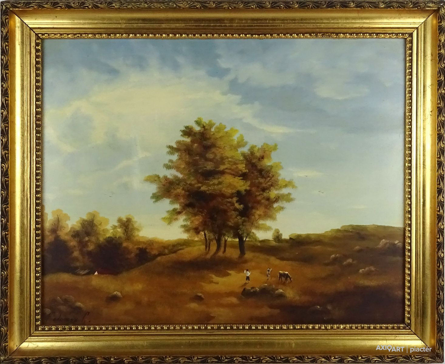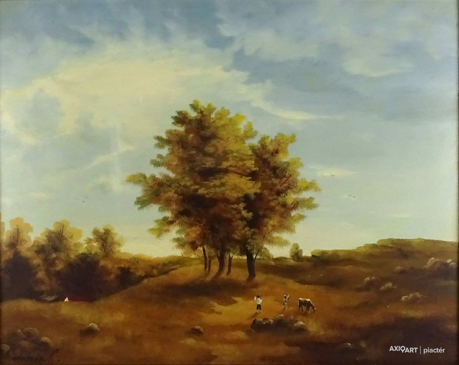 [FK3264/FL-4] A kép mérete: 31,5 x 70,5 cm keret nélkül. Készült: Olaj, tempera, Farostlemez A kép Kurucz D. István (Hódmezővásárhely, 1914, Budapest, 1996) alkotása. Jelezve Jobbra lent "Kurucz 977" A festmény jó állapotban van. Keret: Ép A festmény hátoldalán a Képcsarnokvállalat raglapja látható. Magyar festők és grafikusok életrajzi lexikona I-II. Festő, grafikus. Vásárhelyről, ahol Darvasy István festőművész figyelt fel tehetségére, került Szőnyi István magániskolájába. A fővárosi Képzőművészeti Főiskolának, ahol Rudnay Gyula, Réti István, Benkhard Ágost, Szőnyi István voltak a tanítómesterei 1940-ig volt a tanítványa. A monumentális festészetet Nagy Sándor tanította. Tanulmányúton járt több kelet- és nyugat-európai államban, Mongóliában, Japánban, Algériában. 1940-ben Hódmezővásárhelyen telepedett le, 1943-1947 között bekapcsolódott szülővárosa művészeti és közéletébe. A Vásárhely Népe c. lap munkatársa volt. 1949-59 között Szőnyi tanársegédjeként freskótechnikát tanított a főiskolán. 1951-52-ben megszervezte a Honvédségi Képzőművészeti Stúdiót, majd kinevezték a Honvéd Képzőművészeti Iskola igazgatójának. A vásárhelyi iskola reprezentáns egyéniségeként jelentős szerepe volt a Vásárhelyi Őszi Tárlatok elindításában. Megszervezete és vezette a Mednyánszky Társaságot, s haláláig művészeti vezetője volt a Hajdúböszörményi Nemzetközi Művésztelepnek. Évekig elnöke volt a Hortobágyi Alkotótábornak. Az alföldi parasztok életét megörökítő képei a falképek összefoglaló stílusában a népi realizmus és a dekoratív sommázás szellemében készültek. Számos falképet festett (Kossuth Akadémia, hódmezővásárhelyi iskola, stb.). 1941-től számos kisebb-nagyobb egyéni kiállítása volt, bemutatkozott több hazai és külhoni városban. 1941-től minden jelentősebb országos rendezvény és a magyar művészek külföldi bemutatóinak résztvevője. Rendszeresen szerepelt a Vásárhelyi Őszi Tárlatokon, a Hatvani Tájkép és Portrébiennálékon, a Szegedi Nyári Tárlatokon. Képei bemutatásra kerültek a vásárhelyi iskola jubileumi rendezvényein. 1962-ben több alkotásával szerepelt a Velencei Biennálén. Díjak: SZOT-díj, Munkácsy-díj, Érdemes és Kiváló Művész kitüntetés, Tornyai-plakett, római ösztöndíj, a Munka Érdemrend arany fokozata, Káplár Miklós-díj és emlékplakett, Kossuth-díj. Művei megtalálhatók minden jelentősebb hazai, több olasz és japán közgyűjteményben. (ML, D.J.: Műv. 1985/5, Tasnádi Attila adatközlése nyomán, L.L.: Műv. 1983/3) Magyar festők és grafikusok életrajzi lexikona I-II. Műgyűjtők és kereskedők kézikönyve Festő, grafikus. Vásárhelyről, ahol Darvasy István festőművész figyelt fel tehetségére, került Szőnyi István magániskolájába. A fővárosi Képzőművészeti Főiskolának, ahol Rudnay Gyula, Réti István, Benkhard Ágost, Szőnyi István voltak a tanítómesterei 1941-ig volt a növendéke. A monumentális festészetet Nagy Sándor tanította. Egy ideig tanársegédként működött Szőnyi mellett. Több ízben járt Itáliában tanulmányúton. Évekig művészeti vezetője volt a Hajdúböszörményi Nemzetközi Művésztelepnek. Az alföldi parasztok életét megörökítő képei a falképek összefoglaló stílusában a népi realizmus és a dekoratív sommázás szellemében készülnek. A II. világháború alatt szerepet vállalt a Szocialista Képzőművészek Csoportjának akcióiban. 1949-1960 k. a Képzőművészeti Főiskola falképtanszékének tanára volt. Több falképet festett (Kossuth Akadémia, hódmezővásárhelyi iskola, stb.). 1962-ben több alkotásával szerepelt a Velencei Biennálén, SZOT-díjas, Munkácsy-díjas, érdemes és kiváló művész kitüntető elismerésében részesült. (ML, D.J.: Műv.-1985/5, L.L: Műv.-1983/3) Magyar festők és grafikusok adattára Tanulmányait a Képzőművészeti Főiskolán végezte, ahol Rudnay Gyula és Réti István voltak a mesterei. 1941-1943-ban ösztöndíjas Rómában. 1943-1947 között Hódmezővásárhelyen dolgozik, egyidejűleg a Vásárhelyi Hétfő c. hetilap szerkesztője. 1949-1960 közötti években a budapesti Képzőművészeti Főiskola freskó tanszékének tanára. Az 1940-es évek eleje óta kiállító művész. 1962-ben a Velencei Biennálén állították ki műveit. 1970-ben Csók István Galériában volt kiállítása. A Vásárhelyi Őszi Tárlatok és a Szegedi Nyári Tárlatok rendszeres kiállító művésze. Az alföldi festészet egyéni hangú továbbfejlesztője. Táblaképeket, freskókat és kerámia falképeket alkot. Munkácsy-díjas, érdemes és kiváló művész kitüntető elismerésében részesült. A SZOT a legelső képzőművészek közt, 1962-ben tüntette ki díjával. A 70. születésnapját ünneplő művész 1984 decemberében életmű kiállítást rendezett műveiből a hódmezővásárhelyi Tornyai János Múzeumban. 1986-ban a budapesti Hollósy Galériában nyílt kiállítása. - Irod.: Szij Rezső: Kurucz Dezső István festőművész. Bp. 1967.; Kulcsár Ödön: SZOT-díjasok. Bp., 1981.; Lóska Lajos: Mindig freskót szerettem volna festeni. Beszélgetés Kurucz Dezső Istvánnal. Művészet, 1984. 3. Művészeti lexikon I-IV. Festő, Munkácsy-díjas. A Képzőművészeti Főiskolán Rudnay Gyula, Réti István, Benkhard Ágost, Szőnyi István növendéke volt 1934-40 között. Több ízben járt külföldi tanulmányúton. Az alföldi parasztok életét megörökítő képei a falképek összefoglaló stílusában a népi realizmus és a dekoratív sommázás szellemében készülnek. 1949-60 között a Képzőművészeti Főiskola falképtanszékének tanára volt. Több falképet festett (Kossuth Akadémia; Hódmezővásárhely, iskola, pápai pártház, 1965). Legutóbb 195