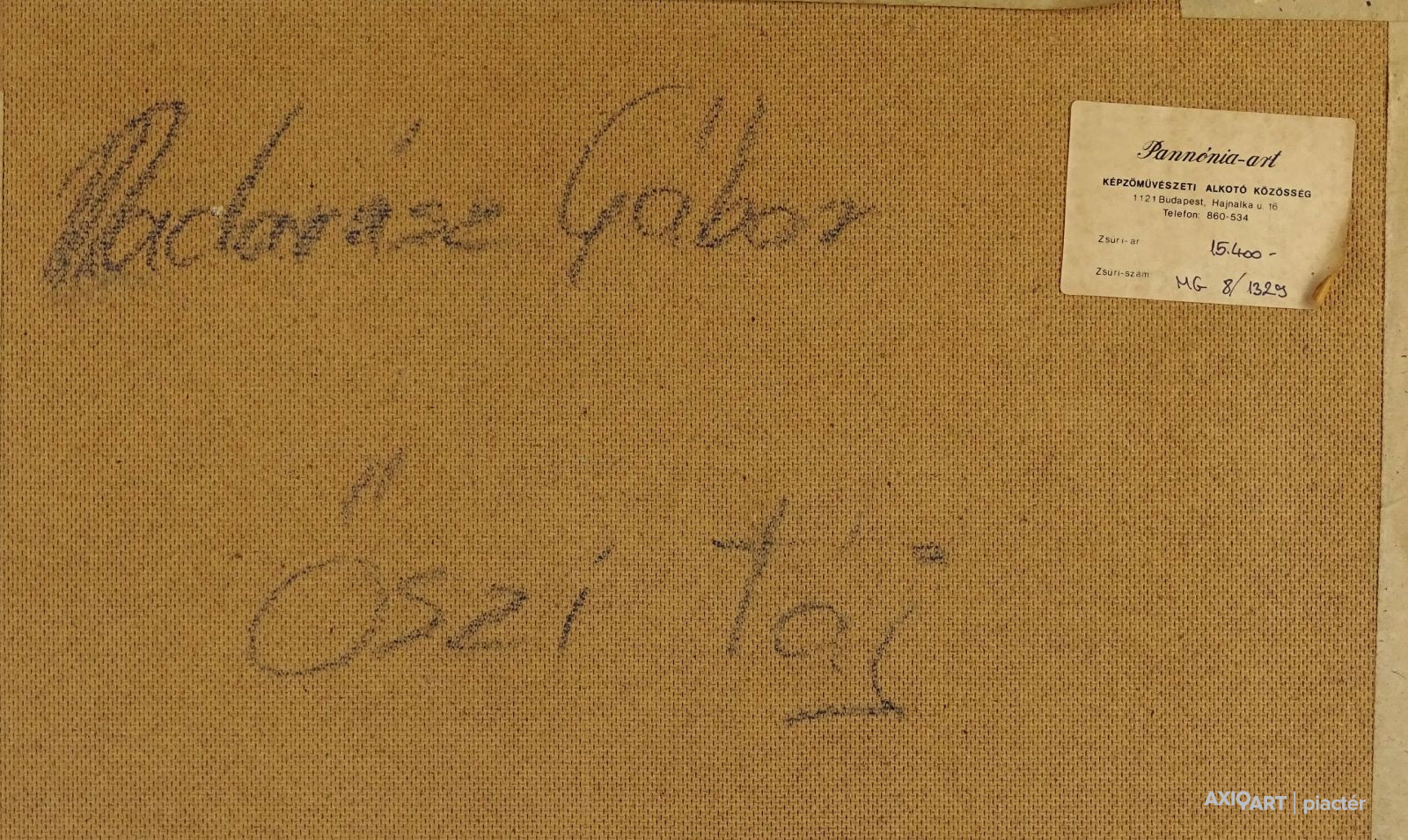 [1T215/137] 25% ÁRENGEDMÉNY MINDEN TERMÉKÜNKRE Dec. 14-ig Olaj farost festmény, hibátlan állapotú aranyozott keretben. Akasztási lehetőséggel rendelkezik. Azonnal falra akasztható, ajándékozható állapotban van. Jelzés balra lent: MADARÁSZ G. Hátoldalán felirat: MADARÁSZ GÁBOR ŐSZI TÁJ Mellette papír címke, rajta felirat: PANNÓNIA-ART KÉPZŐMŰVÉSZETI ALKOTÓ KÖZÖSSÉG 1121 BUDAPEST HAJNALKA U. 16 ZSŰRI SZÁM: MG 8/1329 Magasság: 49.5 cm Szélesség: 59.5 cm Súly: 1.96 kg