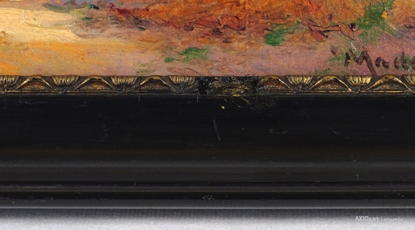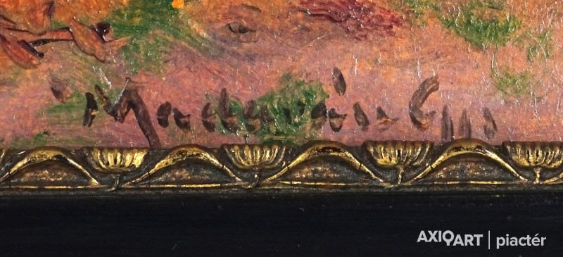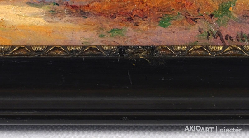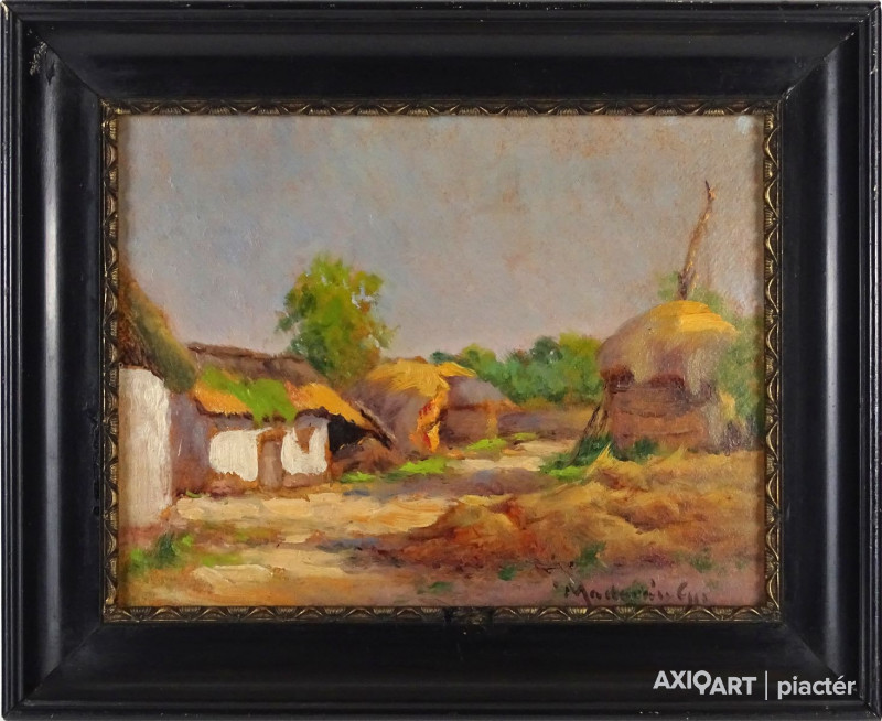 [1P174/136] Olaj karton festmény régi fekete keretben. Akasztási lehetőséggel rendelkezik. Jelzés jobbra lent: MADARÁSZ GY. Hátoldalán címke, rajta felirat: A 054021 Magasság: 26 cm Szélesség: 31.5 cm Súly: 0.51 kg Madarász Gyula festő Zsáka, 1935-03-14   Elhalálozott: Debrecen, 2012. február 8. 1956: egri Tanárképző Főiskola; 1989: Kossuth Lajos Tudományegyetem Bölcsészettudományi Kar. 1964: Debreceni Őszi Tárlat, II. díj; 1968, 1971, 1975, 1979, 1985, 1993: Káplár Miklós-emlékérem; 1971: Debrecen Város Művészeti Díja; 1975: Szabolcs-Szatmár megyei Tanács Művészeti Díja; 1981: Nikola Marinov-emlékérem, arany fokozat; 1983: Nikola Marinov-emlékérem, ezüst fokozat; 1986: SZOT-díj; 1989: Holló László-díj; 1992: X. Országos Tájképfestészeti Biennálé, bronz diploma; 1993. XII. Országos Nyári Tárlat, Debrecen, a szövetség díja; 1995: Kölcsey Ferenc-díj. 1956-tól Hajdúnánáson tanított. 1970-től Debrecenben él. A Debreceni Tanárképző Főiskola Intézet művészeti tanszékének vezetője volt 1975-89 között. Rendszeresen részt vett különböző művésztelepek munkájában, pl.: Hajdúsági Nemzetközi Művésztelep, Tokaji Művésztelep, Hortobágyi Alkotótelep (alapító tag is), Gyergyószárhegy (RO), Kazimierz (PL), Targoviste (BG), S. Michel (FR) művésztelepei. Kamjanka (Ukranja), Gyergyószárhegy, Bucka-Gányó (YU), Bessans (FR). 1999-ben alapítója és vezetője a balatonvilágosi Kárpátmedencei Magyar Festők művésztelepének. Művészete elkötelezett a bihari, nyírségi, hortobágyi táj és ember iránt. Panteisztikus áhítata mellett megfogalmazza a környezetért való aggódását is. Újabban temperaképeket és nagyméretű akvarelleket fest. Irodalom kiállítása Hajdúnánáson, Alföld, 1962/1. Kelet-magyarországi művészek kiállítása a Magyar Nemzeti Galériában, Alföld, 1973/2. (kat., Debrecen, 1996, szerk.: ~). Egyéni kiállítások Egyéni kiállítások 1965, 1970, 1975, 1980, 1985 • Medgyessy Terem, Debrecen 1993 • Művészek és Műpártolók Egyesülete, Debrecen • Bank Ausztria Klubja, Linz 1998 • Önálló Galéria, Zsáka 1999 • Morestel (FR). Válogatott csoportos kiállítások Válogatott csoportos kiállítások 1968-tól Őszi, Tavaszi Tárlatok, Debrecen 1971-től Hajdúsági Nemzetközi Művésztelep kiállításai, Hajdúböszörmény • Debrecen 1972 • Kelet-magyarországi képzőművészek, Magyar Nemzeti Galéria, Budapest 1981-től Vásárhelyi Őszi Tárlatok, Hódmezővásárhely 1983 • I. Táblaképfestészeti Biennálé, Móra Ferenc Múzeum, Szeged 1989 • 25 éves a Hajdúsági Nemzetközi Művésztelep, Ernst Múzeum, Budapest 1992 • X. Tájképfestészeti Biennálé, Hatvan 1994 • Délibábok hazája IV., Déri Múzeum, Debrecen. Művek közgyűjteményekben Művek közgyűjteményekben Forrás: artportal.hu