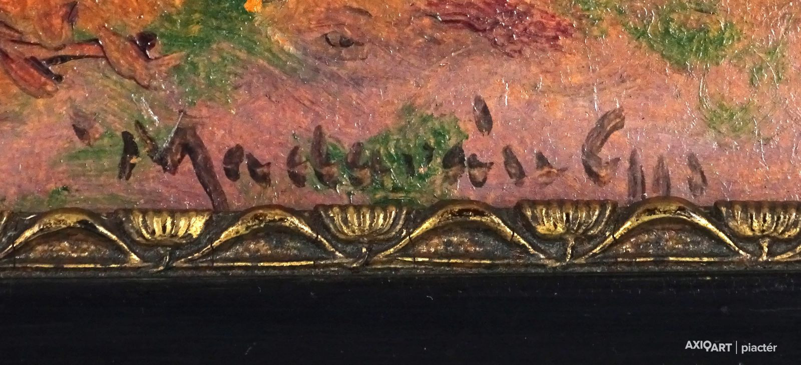 [FK2668/Bp301/4] A kép mérete: 50,5 x 80,5 cm keret nélkül. Készült: Olaj, Vászon A kép Moldován István (Kolozsvár, 1911) alkotása. Jelezve Jobbra lent "Moldován István" A festmény jó állapotban van. Keret: Ép A festmény hátoldalán a Képcsarnokvállalat raglapja láltható. Magyar festők és grafikusok életrajzi lexikona I-II. Festő. Tanulmányait Kolozsvárott, a Szépművészeti Főiskolán kezdte 1930-ban. A következő esztendőben a nagybányai Szépművészeti Iskolában Thorma János és Krizsán János korrektúráján képezte magát. 1931-ben a budapesti Képzőművészeti Főiskola hallgatója lett. Réti István, később Szőnyi István volt a mestere. Már mint főiskolás sok díjat és kitüntetést nyert. 1948-ban megkapta a római ösztöndíjat, de lemondva róla, Erdélybe ment. 1948-1950 között Erdélyben élt, és népművészetben gazdag vidékein festett. 1943-ban Kolozsvárott, 1946-ban Gyöngyösön, 1955-ben, 1959-ben és 1962-ben a Kulturális Kapcsolatok Intézetében, illetve a Csók Galériában rendezett egyéni bemutatókat. Ezen kívül több Európai országban, az USA-ban, Kanadában és Indiában is bemutatta munkáit. Eleinte sajátos atmoszférájú, lírai tájképeket, eleven színvilágú képmásokat festett, később mondernebb, erőteljesebben szerkesztett művekkel jelentkezett. A Pécsi Tanárképző Főiskola számára mozaikot készített. Erdély szerelmese volt. A székely népművészet gazdag formavilágának hatása döntő jelentőségűvé vált sokoldalú művészetében. Műv. díjak: a Szinyei Társaság elismerő oklevele, a Főváros festészeti-díja, "Kolozsvár a képzőművészetben" II. díj, állami ösztöndíj, római ösztöndíj, a Képzőművészek Szövetsége Észak-Magyarországi festészeti díja, SZOT festészeti díj. Több murális művet (mozaik) alkotott. A Magyar Nemzeti Galéria több alkotását őrzi. (M. L.: Műv. 1967/6, RI-NM) Magyar festők és grafikusok életrajzi lexikona I-II. Műgyűjtők és kereskedők kézikönyve Festő. Tanulmányait a kolozsvári Szépművészeti Főiskolán kezdte 1930-ban. A nagybányai szabadiskolában is megfordult. Itt Thorma János és Krizsán János korrektúráján képezte magát. 1931-ben Budapesten a Képzőművészeti Főiskola hallgatója lett. Réti István, később Szőnyi István volt a mestere. Már mint főiskolás sok díjat nyert. 1948-ban megkapta a római ösztöndíjat, de lemondva róla, Erdélybe ment. 1948-1950 k. Erdélyben élt, és népművészetben gazdag vidékein festett. 1943-ban Kolozsváron, 1946-ban Gyöngyösön, 1955-ben, 1959-ben és 1962-ben a Kulturális Kapcsolatok Intézetében, illetve a Csók Galériában rendezett önálló kiállítást. Ezen kívül több Európai országban, az USA-ban, Kanadában és Indiában is bemutatta műveit. Eleinte sajátos atmoszférájú, lírai tájképeket, eleven színvilágú képmásokat festett, később mondernebb, erőteljesebben szerkesztett művekkel jelentkezett. A Pécsi Tanárképző Főiskola számára mozaikot készített. Erdély szerelmese volt. A székely népművészet gazdag formavilágának hatása döntő jelentőségűvé vált sokoldalú művészetében. 1942-ben megkapta a Szinyei Társaság elismerését, és a Főváros festészeti-díjat,1943-ban elnyerte a "Kolozsvár a képzőművészetben" c. díjat. 1947-ben állami ösztöndíjat,1948-ban a római ösztöndíjat, 1972-ben a Képzőművészek Szövetsége Észak-Magyarországi festészeti díját kapta meg. A MNG több művét őrzi. (M. L.: Műv.-1976/6) Magyar festők és grafikusok adattára Tanulmányait Kolozsvárott a Képzőművészeti Főiskolán, majd Nagybányán Thorma János és Krizsán János irányítása mellett kezdte, 1931-től Budapesten megszakításokkal a Képzőművészeti Főiskolán Réti István és Szőnyi István növendékeként fejezte be. 1949-ben és 1950-ben ösztöndíjjal dolgozott Erdélyben, majd hosszú tanulmányutakra indult Nyugat-Európába, az Egyesült Államokba, s a Szovjetunióba. Először Kolozsvárott lépett a nyilvánosság elé 1943-ban, majd 1946-ban Egerben és Gyöngyösön, 1947-ben Miskolcon, 1948-ban Hatvanban, 1955, 1961 és 1981-ben a Csók Galériában, 1959-ben a KKI-ben, 1960-ban Nagykanizsán, 1963-ban Kiskunfélegyházán, 1966-ban Debrecenben, 1969 és 1975-ben Békéscsabán, 1971-ben a Mednyánszky Teremben, 1973-ban Gyöngyösön és Debrecenben, 1977-ben Egerben, 1979-ben Veszprémben, 1983-ban Miskolcon, 1984-ben Csepelen, 1986-ban a Vigadó Galériában rendezett önálló kiállítást. Külföldi kiállításai: Moszkva, Varsó, India, Szófia, Párizs, Bukarest, Belgrád, New York, Montreál és Toronto. Eddig közel kétezer színes táblaképet festett, de szívesen foglalkozik mozaikkészítéssel is. 1964-ben a Pécsi Pedagógiai Főiskola, 1968-ban a Salgótarjáni Kórház, 1969-ben a názáreti templom és 1970-ben a Videoton Vállalat díszterme részére mozaikot készített. - Erdély szerelmese. A székely népművészet gazdag formavilágának hatása döntő jelentőségűvé vált festészetében. Olyan formanyelvet alakított ki magának, amely színvilágában és summázó formaalakításában sajátos erdélyi zamat érződik, ugyanakkor korszerűen modern is konstruktivista stílusa. Munkásságát 1942-ben a Szinyei Társaság elismerésével és a Fővárosi festészeti-díjjal, 1943-ben Római-ösztöndíjjal, 1947-ben Állam ösztöndíjjal (Románai), 1963-ben a SZOT festészeti-díjával, 1972-ben a Képzőművészek Szövetsége Észak-Magyarországi festészeti-díjával tüntették ki. - Irod.: Bíró Béla: Kolozsváry Moldován István. Erdélyi Helikon, 1943.; Felvinczi Takács Zoltán: Kolozsváry Moldován István. Kolozsvár, 1943.; Dutka Mária: Magyar Nemzet, 1961.; Maksay László: Moldován István. Művészet, 1965.; D. Fehér Zsuzsa. Moldován István, Bp. 1971.; Theisler G