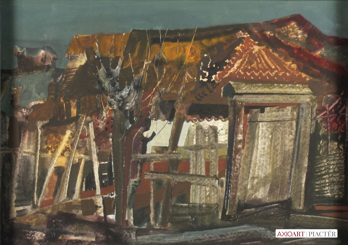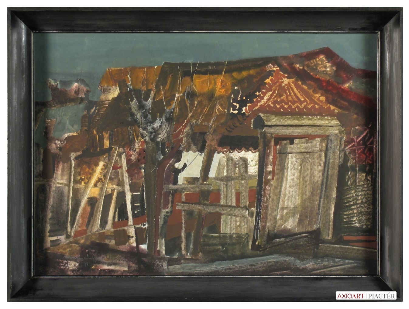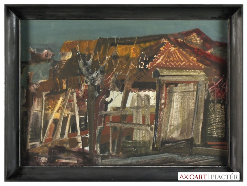 [FK0037/Z018] A kép mérete: 50 x 70 cm keret nélkül. Készült: Olaj, Vászon A kép Paizs László (Szentpéterúr, 1935) alkotása. Jelezve Jobbra lent "P. L." A festmény jó állapotban van. Keret: Ép A festmény hátoldalán a Képcsarnokvállalat címkéje található. Magyar festők és grafikusok életrajzi lexikona I-II. Festő. Tanulmányait a budapesti Iparművészeti Főiskolán végezte 1959-ben. Z. Gács György, Rákosy Zoltán és Szentiványi Lajos növendéke volt. A '60-as évek első felében hagyományosabb felfogású olajképeket festett, mozaikokat, freskókat, utóbb a pop-art körébe tartozó, a francia Arman munkáival rokon műveket alkotott. 1961 óta kiállító művész. Egyéni (Fényes Adolf Terem, Csók Galéria, Műcsarnok, Magyar Nemzeti Galéria, Halászbástya, Bástya Galéria, Vigadó Galéria, Budapest Galéria, Győr, Szombathely, Szeged, Zalaegerszeg, Duisburg, Aix-en-Provence, stb). és vegyes (Ernst Múzeum, Műcsarnok, Óbuda Galéria, Magyar Nemzeti Galéria, Csók Galéria, Vigadó Galéria, Székesfehérvár, Kaposvár, Pécs, Hódmezővásárhely, Firenze, Milano, Padova, Nápoly, Velence, Düsseldorf, Aachen, Genf, stb) tárlatokon vett részt. 1980-ban Munkácsy-díjjal jutalmazták, 1988-ban Érdemes Művész kitüntető elismerésben részesült. Munkáit őrzi a Magyar Nemzeti Galéria, a Fővárosi Képtár, a szombathelyi képtár, a pécsi Janus P. Múzeum, a székesfehérvári István Király Múzeum és a dunaszerdahelyi Kortárs Magyar Galéria. (H.B.: Műv, 1972/4, K.Gy.: Műv. 1977/2, K.G.: Műv. 1978/10, M.L.: Műv, 1983/5, R.G.: Műv, 1987/9, Sz.Gy.: Új Műv. 1995/4, MK) Magyar festők és grafikusok életrajzi lexikona I-II. Műgyűjtők és kereskedők kézikönyve Festő. Tanulmányait a bp.-i Iparművészeti Főiskolán végezte. Mozaikokat ferskókat, utóbb a pop-art körébe tartozó, a francia Arman műveivel rokon műveket alkotott. Mozaikok: a Szegedi Megyei Tanács, a Pécsi Óvoda, a Gödöllői Agrártudományi Egyetem. Freskók: Budapest - Csatárka úti Gyermekotthon. 1971-ben a Fényes Adolf Teremben volt kiállítása, 1983-ban pedig a szegedi Móra Ferenc Múzeumban nagyszabású tárlatokon mutatta be munkáit. 1988-ban érdemes művész kitüntető elismerésben részesült. (MK) Magyar festők és grafikusok adattára Az Iparművészeti Főiskolán végzett 1959-ben. Mozaikokat (Szeged, Megyei Tanács; Pécs, Óvoda; Gödöllő, Agrártudományi Egyetem), freskókat (Budapest, Csatárka úti Gyermekotthon), újabban a pop art körébe tartozó, a francia Arman műveivel rokon műveket alkotott. 1971-ben a Fényes Adolf Teremben nyílt kiállítása. 1983 februárjában a szegedi Móra Ferenc Múzeumban megrendezett nagyszabású tárlaton mutatta be alkotásait. 1988-ban érdemes művész kitüntető elismerésben részesült. - MK Művészeti lexikon I-IV. (Szentpéterur, 1935. dec. 26.- ): festő. Az Iparművészeti Főiskolán 1959-ben végzett Rákosy Zoltán, Z. Gách György és Szentiványi Lajos növendékeként. Épületdiszítő mozaikokat, (Szeged, Megyei Tanács, 1961; Pécs, Óvoda, 1964), műanyagfreskókat (Bp., Csatárka úti Gyermekotthon, 1964) és gobelinterveket készít. Kortárs magyar művészeti lexikon I-III. Festő, szobrász, grafikus. 1959: MIF, mesterei: Z. Gács György, Rákosy Zoltán, Szentiványi Lajos. 1980: Munkácsy-díj; 1988: érdemes művész. Főiskolás éveinek második felében, majd azt követően számos murális munka kivitelezésében vett részt, Fónyi Géza, Konecsni György, Z. Gács György, Rákosi Zoltán és Domanovszky Endre mellett dolgozva. A 60-as évek első felének hagyományosabb fölfogású olajképeket festett. 1964-ben a Velencei B.-n megismerkedett az amerikai pavilonban a pop art Európában akkor még újnak számító törekvésével, és részben ez inspirálta, hogy 1967-ben textil, fém, bőr anyagú "varrottas" képeket küldjön az FKS éves tárlatára; a megnyitó előtt többek között az ő munkáit is eltávolították a falról. A 70-es években pop art-os objekteket (A trónörököspár politikai gyilkosság áldozata lett, 1970, plexiüveg, újság, szarvasbogarak), majd konstruktív, átlátszó plexiüveg plasztikákat készített belső fénytörő határfelületekkel. A 80-as években készültek az anyagában színezett, konstruktív, nagyméretű poliészter szobrai, majd színes poliészter táblaképeket alkotott, mesterségesen roncsolt felületekkel, mintha régészeti leletek vagy atomtámadás utáni festmény-szurrogátumok lennének. Ekkor kezdett organikus plaszikájú bronzszobrokat is mintázni. A 90-es években, a táblaképek és szobrok mellett nagyméretű, egyedi grafikákat készített, formavilágában némileg a roncsolt táblaképekből kiindulva, de szinte kizárólag az emberi alakból elvonatkoztatott torzókat megjelenítve. Ek: 1966: Művészklub, Győr; 1971: Fényes A. T.; 1972: Bercsényi 28-30 G.; 1973: BME B-épület; 1976: Csók G.; 1977: G. Hildebrandt, Duisburg (NSZK); 1979: Bástya G., Halászbástya; Helyőrségi Műv. H., Nagyatád; József A. Műv. Közp., Szeged; Göcsej M., Zalaegerszeg; 1982: Bezzegh G., Küsnacht (CH); 1983: Móra F. M., Szeged; 1987: Műcsarnok (kat.); MNG; 1988: Pandora G., Badacsonytomaj; 1989: Parktheatter, Iserlohn (NSZK); Qualitas G.; Hevesi S. Színház, Zalaegerszeg; 1990: Vasarely Fondation (Ferdinánd Judittal, Fóth Ernővel), Aix-en-Provence (FR); 1994: Vigadó G.; 1997: Pest Center G.; 1998: Budapest G. (kat.); 1999: Pest Center G. (kat); G. Arcis, Sárvár; MMA, Bp.; 2001: SZK, Szhely; Ernst M. (kat.) Vcsk: 1961, 1964, 1966: FKS, Ernst M.; 1962: 9. Magyar Képzőműv. kiállítás, Műcsarnok; 1967: Mai magyar festészet, Új-Delhi; 1969: Vas megyei művészek, Savaria M., Szhely; V. Orsz. Grafikai B., Miskolc; 1971: Új művek, Műcsarnok; 1972: Fiatal művészek Budapestről. Likovni Salon, Újvidék (YU); 1972, 1973: Balatonboglár