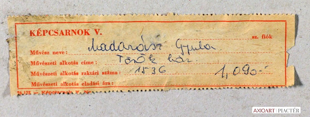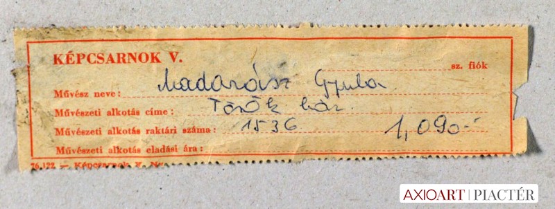 A festmény hátoldalán Képcsarnok Vállalat raglapja és az eredeti hátlapról vágott lap található.