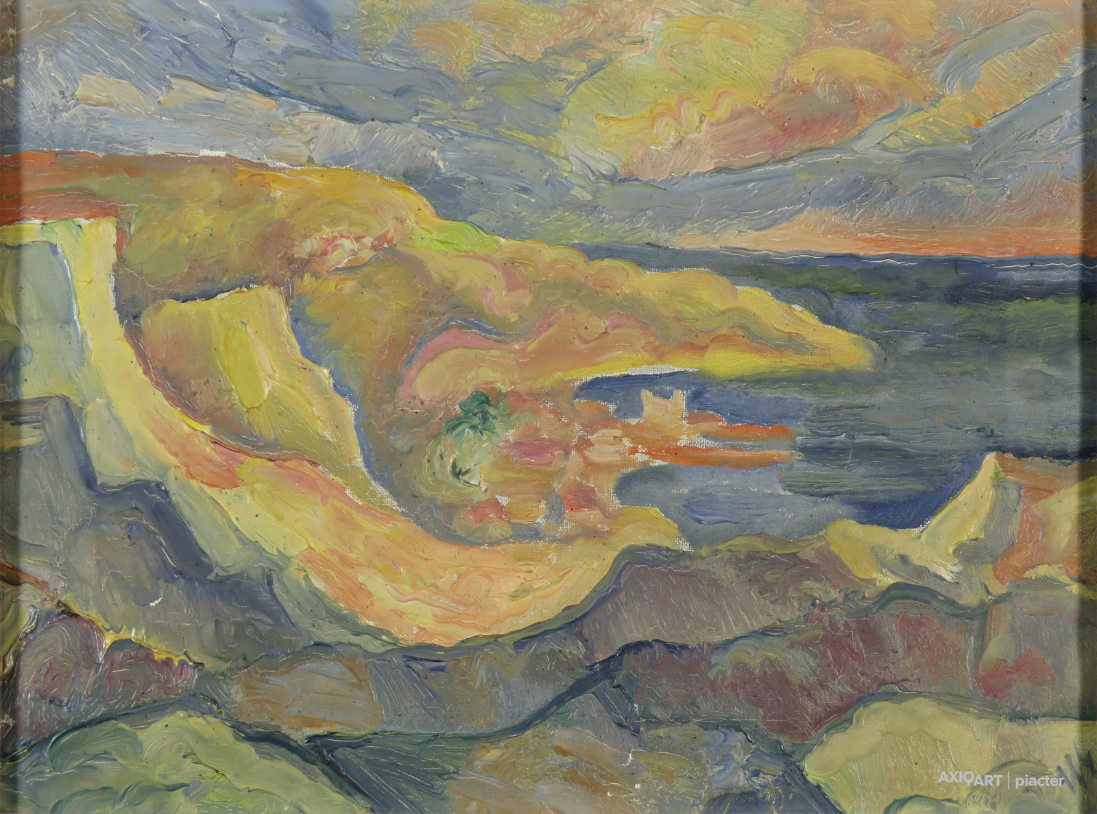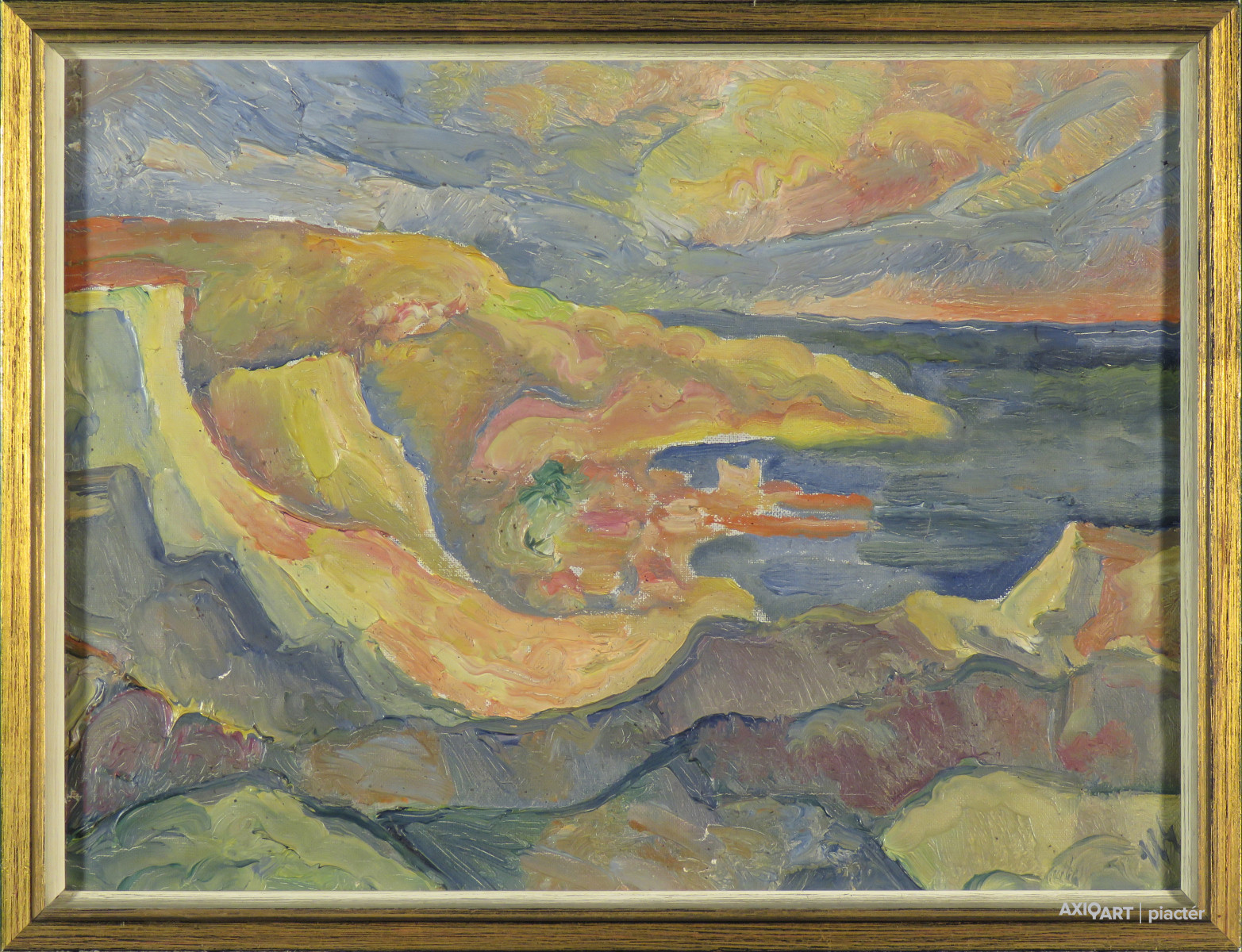 [FK2668/Bp301/4] A kép mérete: 50,5 x 80,5 cm keret nélkül. Készült: Olaj, Vászon A kép Moldován István (Kolozsvár, 1911) alkotása. Jelezve Jobbra lent "Moldován István" A festmény jó állapotban van. Keret: Ép A festmény hátoldalán a Képcsarnokvállalat raglapja láltható. Magyar festők és grafikusok életrajzi lexikona I-II. Festő. Tanulmányait Kolozsvárott, a Szépművészeti Főiskolán kezdte 1930-ban. A következő esztendőben a nagybányai Szépművészeti Iskolában Thorma János és Krizsán János korrektúráján képezte magát. 1931-ben a budapesti Képzőművészeti Főiskola hallgatója lett. Réti István, később Szőnyi István volt a mestere. Már mint főiskolás sok díjat és kitüntetést nyert. 1948-ban megkapta a római ösztöndíjat, de lemondva róla, Erdélybe ment. 1948-1950 között Erdélyben élt, és népművészetben gazdag vidékein festett. 1943-ban Kolozsvárott, 1946-ban Gyöngyösön, 1955-ben, 1959-ben és 1962-ben a Kulturális Kapcsolatok Intézetében, illetve a Csók Galériában rendezett egyéni bemutatókat. Ezen kívül több Európai országban, az USA-ban, Kanadában és Indiában is bemutatta munkáit. Eleinte sajátos atmoszférájú, lírai tájképeket, eleven színvilágú képmásokat festett, később mondernebb, erőteljesebben szerkesztett művekkel jelentkezett. A Pécsi Tanárképző Főiskola számára mozaikot készített. Erdély szerelmese volt. A székely népművészet gazdag formavilágának hatása döntő jelentőségűvé vált sokoldalú művészetében. Műv. díjak: a Szinyei Társaság elismerő oklevele, a Főváros festészeti-díja, "Kolozsvár a képzőművészetben" II. díj, állami ösztöndíj, római ösztöndíj, a Képzőművészek Szövetsége Észak-Magyarországi festészeti díja, SZOT festészeti díj. Több murális művet (mozaik) alkotott. A Magyar Nemzeti Galéria több alkotását őrzi. (M. L.: Műv. 1967/6, RI-NM) Magyar festők és grafikusok életrajzi lexikona I-II. Műgyűjtők és kereskedők kézikönyve Festő. Tanulmányait a kolozsvári Szépművészeti Főiskolán kezdte 1930-ban. A nagybányai szabadiskolában is megfordult. Itt Thorma János és Krizsán János korrektúráján képezte magát. 1931-ben Budapesten a Képzőművészeti Főiskola hallgatója lett. Réti István, később Szőnyi István volt a mestere. Már mint főiskolás sok díjat nyert. 1948-ban megkapta a római ösztöndíjat, de lemondva róla, Erdélybe ment. 1948-1950 k. Erdélyben élt, és népművészetben gazdag vidékein festett. 1943-ban Kolozsváron, 1946-ban Gyöngyösön, 1955-ben, 1959-ben és 1962-ben a Kulturális Kapcsolatok Intézetében, illetve a Csók Galériában rendezett önálló kiállítást. Ezen kívül több Európai országban, az USA-ban, Kanadában és Indiában is bemutatta műveit. Eleinte sajátos atmoszférájú, lírai tájképeket, eleven színvilágú képmásokat festett, később mondernebb, erőteljesebben szerkesztett művekkel jelentkezett. A Pécsi Tanárképző Főiskola számára mozaikot készített. Erdély szerelmese volt. A székely népművészet gazdag formavilágának hatása döntő jelentőségűvé vált sokoldalú művészetében. 1942-ben megkapta a Szinyei Társaság elismerését, és a Főváros festészeti-díjat,1943-ban elnyerte a "Kolozsvár a képzőművészetben" c. díjat. 1947-ben állami ösztöndíjat,1948-ban a római ösztöndíjat, 1972-ben a Képzőművészek Szövetsége Észak-Magyarországi festészeti díját kapta meg. A MNG több művét őrzi. (M. L.: Műv.-1976/6) Magyar festők és grafikusok adattára Tanulmányait Kolozsvárott a Képzőművészeti Főiskolán, majd Nagybányán Thorma János és Krizsán János irányítása mellett kezdte, 1931-től Budapesten megszakításokkal a Képzőművészeti Főiskolán Réti István és Szőnyi István növendékeként fejezte be. 1949-ben és 1950-ben ösztöndíjjal dolgozott Erdélyben, majd hosszú tanulmányutakra indult Nyugat-Európába, az Egyesült Államokba, s a Szovjetunióba. Először Kolozsvárott lépett a nyilvánosság elé 1943-ban, majd 1946-ban Egerben és Gyöngyösön, 1947-ben Miskolcon, 1948-ban Hatvanban, 1955, 1961 és 1981-ben a Csók Galériában, 1959-ben a KKI-ben, 1960-ban Nagykanizsán, 1963-ban Kiskunfélegyházán, 1966-ban Debrecenben, 1969 és 1975-ben Békéscsabán, 1971-ben a Mednyánszky Teremben, 1973-ban Gyöngyösön és Debrecenben, 1977-ben Egerben, 1979-ben Veszprémben, 1983-ban Miskolcon, 1984-ben Csepelen, 1986-ban a Vigadó Galériában rendezett önálló kiállítást. Külföldi kiállításai: Moszkva, Varsó, India, Szófia, Párizs, Bukarest, Belgrád, New York, Montreál és Toronto. Eddig közel kétezer színes táblaképet festett, de szívesen foglalkozik mozaikkészítéssel is. 1964-ben a Pécsi Pedagógiai Főiskola, 1968-ban a Salgótarjáni Kórház, 1969-ben a názáreti templom és 1970-ben a Videoton Vállalat díszterme részére mozaikot készített. - Erdély szerelmese. A székely népművészet gazdag formavilágának hatása döntő jelentőségűvé vált festészetében. Olyan formanyelvet alakított ki magának, amely színvilágában és summázó formaalakításában sajátos erdélyi zamat érződik, ugyanakkor korszerűen modern is konstruktivista stílusa. Munkásságát 1942-ben a Szinyei Társaság elismerésével és a Fővárosi festészeti-díjjal, 1943-ben Római-ösztöndíjjal, 1947-ben Állam ösztöndíjjal (Románai), 1963-ben a SZOT festészeti-díjával, 1972-ben a Képzőművészek Szövetsége Észak-Magyarországi festészeti-díjával tüntették ki. - Irod.: Bíró Béla: Kolozsváry Moldován István. Erdélyi Helikon, 1943.; Felvinczi Takács Zoltán: Kolozsváry Moldován István. Kolozsvár, 1943.; Dutka Mária: Magyar Nemzet, 1961.; Maksay László: Moldován István. Művészet, 1965.; D. Fehér Zsuzsa. Moldován István, Bp. 1971.; Theisler G