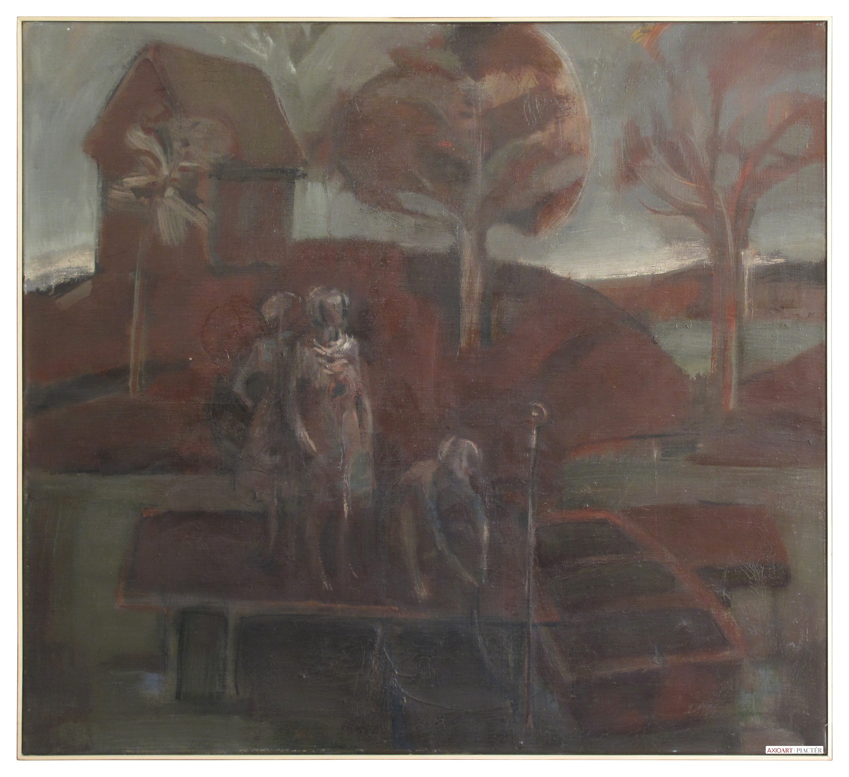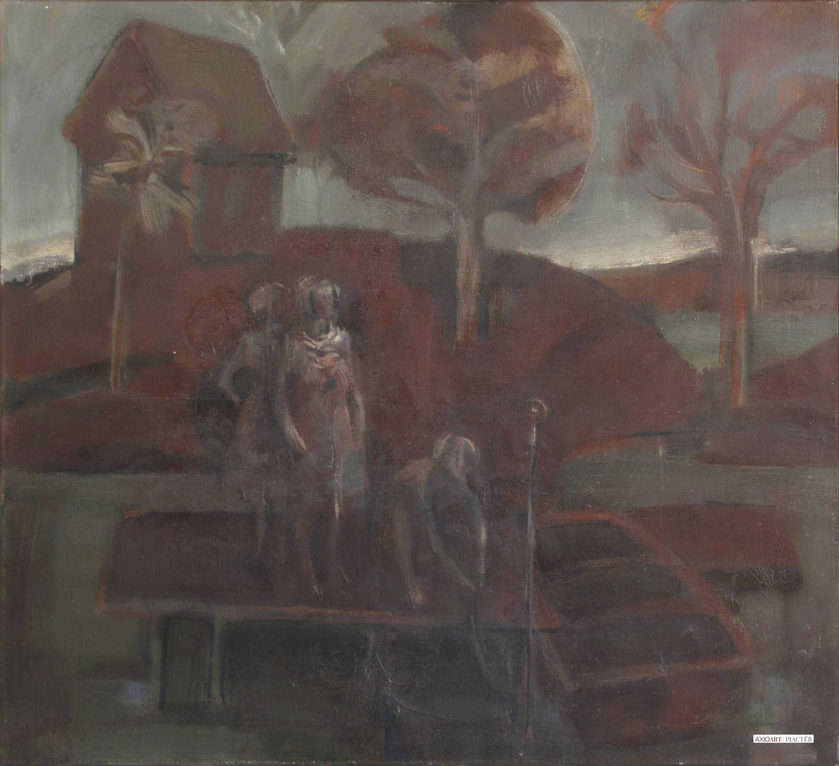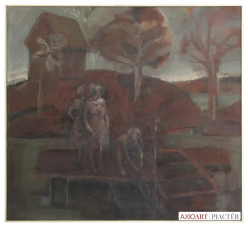 [FK0037/Z018] A kép mérete: 50 x 70 cm keret nélkül. Készült: Olaj, Vászon A kép Paizs László (Szentpéterúr, 1935) alkotása. Jelezve Jobbra lent "P. L." A festmény jó állapotban van. Keret: Ép A festmény hátoldalán a Képcsarnokvállalat címkéje található. Magyar festők és grafikusok életrajzi lexikona I-II. Festő. Tanulmányait a budapesti Iparművészeti Főiskolán végezte 1959-ben. Z. Gács György, Rákosy Zoltán és Szentiványi Lajos növendéke volt. A '60-as évek első felében hagyományosabb felfogású olajképeket festett, mozaikokat, freskókat, utóbb a pop-art körébe tartozó, a francia Arman munkáival rokon műveket alkotott. 1961 óta kiállító művész. Egyéni (Fényes Adolf Terem, Csók Galéria, Műcsarnok, Magyar Nemzeti Galéria, Halászbástya, Bástya Galéria, Vigadó Galéria, Budapest Galéria, Győr, Szombathely, Szeged, Zalaegerszeg, Duisburg, Aix-en-Provence, stb). és vegyes (Ernst Múzeum, Műcsarnok, Óbuda Galéria, Magyar Nemzeti Galéria, Csók Galéria, Vigadó Galéria, Székesfehérvár, Kaposvár, Pécs, Hódmezővásárhely, Firenze, Milano, Padova, Nápoly, Velence, Düsseldorf, Aachen, Genf, stb) tárlatokon vett részt. 1980-ban Munkácsy-díjjal jutalmazták, 1988-ban Érdemes Művész kitüntető elismerésben részesült. Munkáit őrzi a Magyar Nemzeti Galéria, a Fővárosi Képtár, a szombathelyi képtár, a pécsi Janus P. Múzeum, a székesfehérvári István Király Múzeum és a dunaszerdahelyi Kortárs Magyar Galéria. (H.B.: Műv, 1972/4, K.Gy.: Műv. 1977/2, K.G.: Műv. 1978/10, M.L.: Műv, 1983/5, R.G.: Műv, 1987/9, Sz.Gy.: Új Műv. 1995/4, MK) Magyar festők és grafikusok életrajzi lexikona I-II. Műgyűjtők és kereskedők kézikönyve Festő. Tanulmányait a bp.-i Iparművészeti Főiskolán végezte. Mozaikokat ferskókat, utóbb a pop-art körébe tartozó, a francia Arman műveivel rokon műveket alkotott. Mozaikok: a Szegedi Megyei Tanács, a Pécsi Óvoda, a Gödöllői Agrártudományi Egyetem. Freskók: Budapest - Csatárka úti Gyermekotthon. 1971-ben a Fényes Adolf Teremben volt kiállítása, 1983-ban pedig a szegedi Móra Ferenc Múzeumban nagyszabású tárlatokon mutatta be munkáit. 1988-ban érdemes művész kitüntető elismerésben részesült. (MK) Magyar festők és grafikusok adattára Az Iparművészeti Főiskolán végzett 1959-ben. Mozaikokat (Szeged, Megyei Tanács; Pécs, Óvoda; Gödöllő, Agrártudományi Egyetem), freskókat (Budapest, Csatárka úti Gyermekotthon), újabban a pop art körébe tartozó, a francia Arman műveivel rokon műveket alkotott. 1971-ben a Fényes Adolf Teremben nyílt kiállítása. 1983 februárjában a szegedi Móra Ferenc Múzeumban megrendezett nagyszabású tárlaton mutatta be alkotásait. 1988-ban érdemes művész kitüntető elismerésben részesült. - MK Művészeti lexikon I-IV. (Szentpéterur, 1935. dec. 26.- ): festő. Az Iparművészeti Főiskolán 1959-ben végzett Rákosy Zoltán, Z. Gách György és Szentiványi Lajos növendékeként. Épületdiszítő mozaikokat, (Szeged, Megyei Tanács, 1961; Pécs, Óvoda, 1964), műanyagfreskókat (Bp., Csatárka úti Gyermekotthon, 1964) és gobelinterveket készít. Kortárs magyar művészeti lexikon I-III. Festő, szobrász, grafikus. 1959: MIF, mesterei: Z. Gács György, Rákosy Zoltán, Szentiványi Lajos. 1980: Munkácsy-díj; 1988: érdemes művész. Főiskolás éveinek második felében, majd azt követően számos murális munka kivitelezésében vett részt, Fónyi Géza, Konecsni György, Z. Gács György, Rákosi Zoltán és Domanovszky Endre mellett dolgozva. A 60-as évek első felének hagyományosabb fölfogású olajképeket festett. 1964-ben a Velencei B.-n megismerkedett az amerikai pavilonban a pop art Európában akkor még újnak számító törekvésével, és részben ez inspirálta, hogy 1967-ben textil, fém, bőr anyagú "varrottas" képeket küldjön az FKS éves tárlatára; a megnyitó előtt többek között az ő munkáit is eltávolították a falról. A 70-es években pop art-os objekteket (A trónörököspár politikai gyilkosság áldozata lett, 1970, plexiüveg, újság, szarvasbogarak), majd konstruktív, átlátszó plexiüveg plasztikákat készített belső fénytörő határfelületekkel. A 80-as években készültek az anyagában színezett, konstruktív, nagyméretű poliészter szobrai, majd színes poliészter táblaképeket alkotott, mesterségesen roncsolt felületekkel, mintha régészeti leletek vagy atomtámadás utáni festmény-szurrogátumok lennének. Ekkor kezdett organikus plaszikájú bronzszobrokat is mintázni. A 90-es években, a táblaképek és szobrok mellett nagyméretű, egyedi grafikákat készített, formavilágában némileg a roncsolt táblaképekből kiindulva, de szinte kizárólag az emberi alakból elvonatkoztatott torzókat megjelenítve. Ek: 1966: Művészklub, Győr; 1971: Fényes A. T.; 1972: Bercsényi 28-30 G.; 1973: BME B-épület; 1976: Csók G.; 1977: G. Hildebrandt, Duisburg (NSZK); 1979: Bástya G., Halászbástya; Helyőrségi Műv. H., Nagyatád; József A. Műv. Közp., Szeged; Göcsej M., Zalaegerszeg; 1982: Bezzegh G., Küsnacht (CH); 1983: Móra F. M., Szeged; 1987: Műcsarnok (kat.); MNG; 1988: Pandora G., Badacsonytomaj; 1989: Parktheatter, Iserlohn (NSZK); Qualitas G.; Hevesi S. Színház, Zalaegerszeg; 1990: Vasarely Fondation (Ferdinánd Judittal, Fóth Ernővel), Aix-en-Provence (FR); 1994: Vigadó G.; 1997: Pest Center G.; 1998: Budapest G. (kat.); 1999: Pest Center G. (kat); G. Arcis, Sárvár; MMA, Bp.; 2001: SZK, Szhely; Ernst M. (kat.) Vcsk: 1961, 1964, 1966: FKS, Ernst M.; 1962: 9. Magyar Képzőműv. kiállítás, Műcsarnok; 1967: Mai magyar festészet, Új-Delhi; 1969: Vas megyei művészek, Savaria M., Szhely; V. Orsz. Grafikai B., Miskolc; 1971: Új művek, Műcsarnok; 1972: Fiatal művészek Budapestről. Likovni Salon, Újvidék (YU); 1972, 1973: Balatonboglár