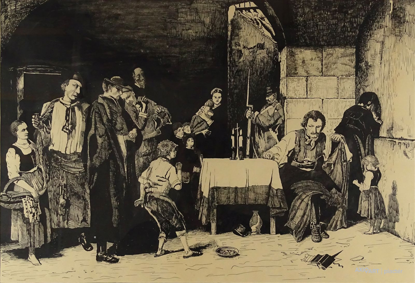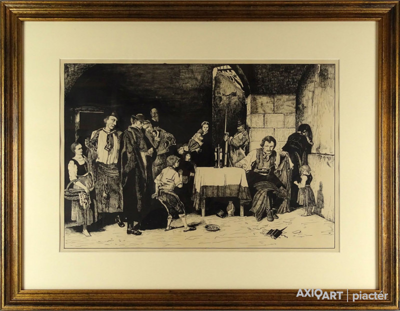 [FK0704/Bp6/6] A kép mérete: 32 x 41 cm keret nélkül. Készült: Olaj, pasztell, Merített papír A kép Tóth Ernő (Sajócseg, 1949) alkotása. Jelezve Jobbra lent "Tóth E 2003" A festmény jó állapotban van. Keret: Új Magyar festők és grafikusok életrajzi lexikona I-II. Festő és grafikus. A Képzőművészeti Gimnázium elvégzése után néhány évig az Operaház díszletfestő műhelyében dolgozott. A Képzőművészeti Főiskolán Iván Szilárd, Barcsay Jenő és Cs. Patay László voltak a tanárai. Tóth E. amióta - 1978-ban - elvégezte a főiskolát, és kiállításokon szerepel, következetesen azt a szimbolikus, groteszk világot festi, amelyben a színpadias helyszíneket, néha valóságos színpadokat színházi jelenetszerűen népesíti be valóságos, félig valóságos, valamint mitikus figurákkal, motívumokkal. Alakjainak, motívumainak megfogalmazási módja a századvég, a szecesszió hagyományaiban gyökerezik. Képei mesélő kedvűek. 1978 óta rendszeresen szerepel kollektív és egyéni kiállításokon, itthon és külföldön (USA, Hollandia, Bulgária stb.). Munkáit több díjban és kitüntetésben részesítették. 1983-ban a grabvói Humor- és Szatíra-fesztivál nagydíjával jutalmazták. A Magyar Képző- és Iparművészek Szövetségének tagja. Munkáját őrzi a Magyar Nemzeti Galéria, a debreceni Déri Múzeum, békéscsabai Munkácsy Múzeum és a hódmezővásárhelyi Tornyai J. Múzeum. (P.G.: Műv. 1986/10, BMT) Magyar festők és grafikusok adattára 1973-1978 között a Képzőművészeti Főiskola hallgatója, mint Iván Szilárd, Barcsay Jenő és Patay László mesterek növendéke. Figuráinak, motivumainak megfogalmazási módja a századvég, a szecesszió hagyományaiban gyökerezik. Képei mesélő kedvűek, fölnőtthöz gyermekhez egyaránt szólnak. 1978-ban rendszeresen vesz részt hazai tárlatokon. - Irod.: ÖLK; Pogány Ö. Gábor: A hegedülő krampusz. Tóth Ernő képeiről. Művészet, 1986.10. Magyar festők és grafikusok életrajzi lexikona I-II. Műgyűjtők és kereskedők kézikönyve Festő. A Képzőművészeti Gimnázium elvégzése után néhány évig az Operaház díszletfestő műhelyében dolgozott. A Képzőművészeti Főiskolán Iván Szilárd, Barcsay Jenő és Cs. Patay László voltak a tanárai. Tóth E. amióta - 1978-ban - elvégezte a főiskolát, és kiállításokon szerepel, következetesen azt a szimbolikus, groteszk világot festi, amelyben a színpadias helyszíneket, néha valóságos színpadokat színházi jelenetszerűen népesíti be valóságos, félig valóságos, valamint mitikus figurákkal, motívumokkal. Figuráinak, motívumainak megfogalmazási módja a századvég, a szecesszió hagyományaiban gyökerezik. Képei mesélő kedvűek. 1978 óta rendszeresen szerepel kollektív és egyéni tárlatokon. 1983-ban a grabvói Humor- és Szatíra-fesztivál nagydíjával jutalmazták. (P.G.: Műv.-1986/10) Művész életrajzok kortárs magyar képzőművészek A Képző- és Iparművészeti Gimnáziumot 1967-ben végezte el, utána 1968-1971-ig az Operaház díszlet-festőműhelyében dolgozott, majd 1973-1978-ig a Képzőművészeti Főiskola hallgatója, ahol Iván Szilárd, Patay László és Barcsay Jenő a mestere. 1980-1981-ben Derkovits-ösztöndíjas. - Önálló kiállításai: 1980 Szolnok, Aba-Novák Terem, 1981 Tornyai János Múzeum Hódmezővásárhely, 1981 Uitz Terem Dunaújváros, 1982 Munkácsy Mihály Múzeum Békéscsaba. Több országos jellegű csoportos tárlaton szerepelt, ezeken díjakat nyert. Tanulmányúton járt Hollandiában, Franciaországban és Jugoszláviában. Festészete alapvetően figurális. Nem nélkülözi a humor és a szatíra elemeit. Tájképein az Alföld levegője fátyolszerűen vonja be a látott világ tárgyait, jelenségeit, a szürreális, képzelt világ sem idegen tőle. Békéscsabán él.