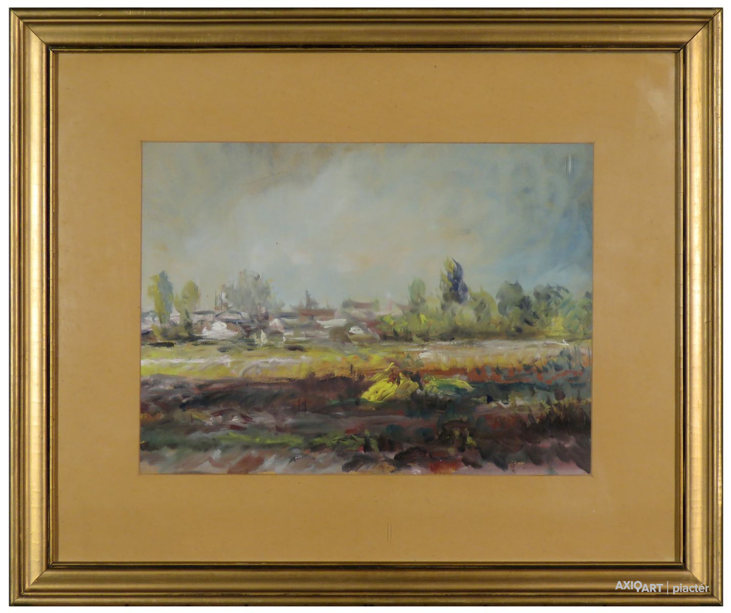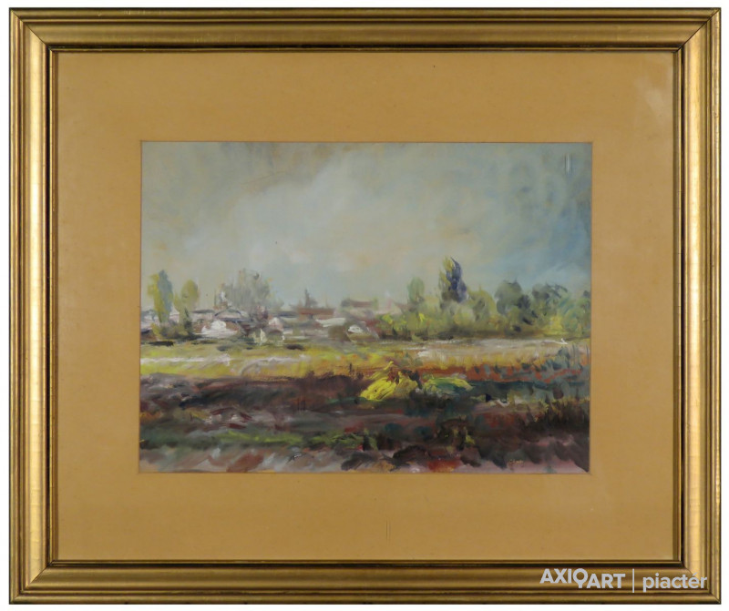 [FK0724/Bp52/8] A kép mérete: 34 x 46 cm keret nélkül. Készült: Tempera, Karton A kép Dorogi Imre (Kisújszállás, 1890, Szeged, 1976) alkotása. Jelezve: Jelzés nélkül A festmény jó állapotban van. Keret: Ép Magyar festők és grafikusok életrajzi lexikona I-II. Festő. Gimnázium rajztanára a nyaranta Hollósynál dolgozó Szunyogh Farkas volt, aki a nagybányai eredményeket adta útravalóul festegető tanítványának. A budapesti Képzőművészeti Főiskolán 1908-1913 között Révész Imre, Balló Ede és Hegedűs László voltak a mesterei. 1913-ban szerezte meg a rajztanári oklevelet. Az I. világháborút végig katonáskodta, majd 1918-ban Szegeden vállalt rajztanári állást. 1925-30 között nyaranta a kecskeméti művésztelepen dolgozott Révész Imre mellett. 1928-tól állandó szereplője volt a budapesti kiállításoknak. Az 1938-as velencei biennálén két képével szerepelt. Aba-Novák főiskolai oktatói állást ajánlott fel számára, de a terv meghiúsult. Munkássága első szakaszában egyháztörténeti művekkel foglalkozott. Akadémikus korszaka után, Dorogi Imre a '30-as évek elejétől találta meg a számára megfelelő témát és az azt kifejező igazi hangját. Szegedi tartózkodása folyamán fedezte fel a Tisza festői szépségeit. Az 1960-as években festészetét atmoszférikus festés váltotta fel. Születésének 85. évfordulóján Szegeden kamarakiállítás nyílt. Díjak: A Népművelési Minisztérium Munkajutalma; Szeged Városi Tanács alkotói díja (1956, 1962, 1970); a Munka Érdemrend ezüst fokozata; a szegedi Nyári Tárlat díja. Munkáit a szegedi Móra Ferenc Múzeum őrzi. (A.F.: Műv. 1975/5, SzZ-SzK, Szuromi Pál) Magyar festők és grafikusok életrajzi lexikona I-II. Műgyűjtők és kereskedők kézikönyve Festő. Gimnázium rajztanára a nyaranta Hollósynál dolgozó Szunyogh Farkas volt, aki a nagybányai eredményeket adta útravalóul festegető tanítványának. A bp.-i Képzőművészeti Főiskolán 1908-1913 között Balló Ede és Hegedűs László voltak a mesterei. 1913-ban szerezte meg a rajztanári oklevelet. Az I. világháborút végig katonáskodta, majd 1918-ban Szegeden vállalt rajztanári állást. 1925-30 k. nyaranta a kecskeméti művésztelepen dolgozott Révész Imre mellett. 1928-tól állandó szereplője volt a fővárosi bemutatóknak. Az 1938-as Velencei Biennálén két képével szerepelt. Aba-Novák főiskolai oktatói állást ajánlott fel számára, de a terv meghiúsult. Munkássága első szakaszában egyháztörténeti művekkel foglalkozott. Akadémikus korszaka után a 30-as évek elejétől találta meg a számára megfelelő témát és az azt kifejező igazi hangját. Szegedi tartózkodása folyamán fedezte fel a Tisza festői szépségeit. A 60-as években festészetét atmoszférikus festés váltotta fel. Születésének 85. évfordulóján Szegeden kamarakiállítás nyílt. (A.F.: Műv. 1975/5, SzZ-SzK) Magyar festők és grafikusok adattára 1908-ban a Képzőművészeti Főiskolán Balló Ede volt a mestere. 1913-ban megszerezte a rajztanári oklevelet, a háború után 1918-ban Szegeden rajztanári állást vállalt. 1925-1930 között nyaranta a kecskeméti művésztelepen Révész Imre mellett dolgozott. Munkásságának első szakaszában egyháztörténeti munkákkal foglalkozott. Akadémikus korszaka után, a harmincas évek elejétől találja meg a számára megfelelő témát és az azt kifejező igazi hangját (Tiszai csónakházak napsütésben. 1932). Szegeden tartózkodásának eredményeként fedezi föl a Tisza festői szépségét. A hatvanas években festészetét az atmoszférikus festés váltja föl. 1975-ben Szegeden kamarakiállítása nyílt, a mester születésének 85. évfordulóján. - Irod.: Szelesi Zoltán: Szeged képzőművészete. Szeged, 1975. Művészeti lexikon I-II. A bpesti Képzőműv. Főiskolán Balló Edénél, s a kecskeméti művésztelepen Révész Imrénél tanult. Vallásos tárgyú kompozíciókat (Árpádházi boldog Margit, Szent István végrendelete, Magdolna) valamint táj- és genreképeket fest. Művészi felfogása a neoimpresszionizmushoz áll közel. Kortárs magyar művészeti lexikon I-III. 1908-13: MKF, mesterei: Balló Ede, Révész Imre. 1952: Népművelési Minisztérium munkajutalma; 1954, 1962, 1970: Szegedi Városi Tanács alkotói díjai; 1970: a Munka Érdemrend ezüst fokozata; 1973: Szegedi Nyári Tárlat díja. Szegeden élt. Az alföldi táj, az itt élő ember s mindenekelőtt a Tisza elkötelezett festője volt. Korai művein még mestereinek tárgyilagos, naturalisztikus felfogását követte, habár monumentális iránti fogékonysága már itt is megmutatkoztott. Annál is inkább, mivel a 30-as évek körül több nagyméretű, egyházi témájú képet is festett. Hatással volt rá a nagybányaiak felszabadult színköltészete. Dorogi Imre atmoszférikus hatású, expresszív fényfestészete leginkább Szőnyi István és Egry József művészetével rokonítható. Ek: 1959: Móra F. M. Képtára, Szeged (gyűjt., kat.); 1970: Bartók B. Műv. Közp., Szeged; Móra F. M. Képtára, Szeged; 1975: Móra F. M. Kupolaterme, Szeged. Vcsk: 1954: Vidéken elő képzőművészek kiállítása, Ernst M.; 1957: Ernst M.; 1958: Szegedi Művészek retrospektív tárlata, Móra F. M. Képtára, Szeged; 1959: Alföld a festészetben, Műcsarnok; 1967: Szegedi képzőművészek tárlata, MNG; 1973: Vásárhelyi Őszi Tárlat, Tornyai J. M., Hmvhely; 1975: Szegedi Nyári Tárlat, Móra F. M. Képtára, Szeged; Móra F. M. (emlékkiállítás), Szeged. Mk: Móra F. M., Szeged. Irod.: Szelesi Z.: (kat. bev. tan., Móra F. M., Szeged, 1959); Horváth M.: Dorogi Imre gyűjt. kiállítása, Tiszatáj, 1959/6.; Pataj M., Cs.: Dorogi Imre, Tiszatáj, 1968/3; Vinkler L.: (kat., bev. tan. Móra F. M., Szeged, 1970); Laczó K.: Dorogi Imre gyűjt. kiállítása, Tiszatáj, 1970/11.; Pogán