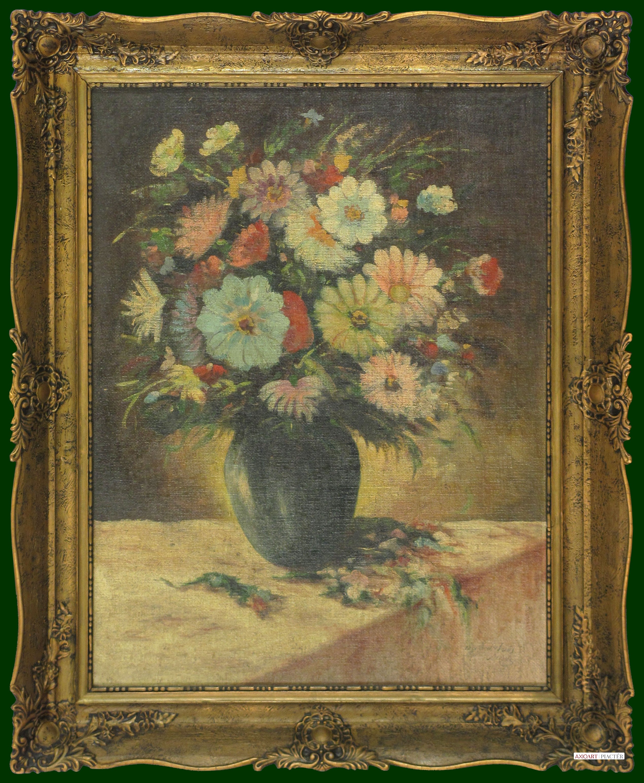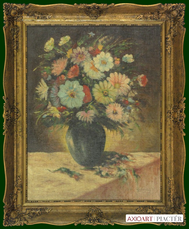 [FK2404/Z039] A kép mérete: 60 x 80 cm keret nélkül. Készült: Olaj, Vászon A kép Iván Szilárd (Újarad, 1912, Budapest, 1988) alkotása. Jelezve Jobbra lent "Iván" A festmény jó állapotban van. Keret: Ép Magyar festők és grafikusok életrajzi lexikona I-II. Festő. Rajztanára, György Antal mellett Tatay Béla, az Iparrajziskola növendéke egyengette a művészi pálya felé vezető utat. Az Iparművészeti Iskola grafika szakán egy évig tanult, majd Marsovszkyné Szirmai Ilona magániskolájába iratkozott be, ahol Iványi-Grünwald Béla, Aba-Novák Vilmos és Patkó Károly mesterek korrigálták, később egyedül a művészre legjobban ható: Szőnyi István. A budapesti Képzőművészeti Főiskolán 1930-1937 között Réti István és Varga Nándor Lajos tanítványa volt, közben egy évig, 1935-1936-ban római ösztöndíjasként Olaszországban dolgozott. Párizsban és Hollandiában járt tanulmányúton. A bécsi döntés után, Réti István tanácsára 4 évre (1940-44) elnyerte a nagybányai művésztelep egyik műtermét. Nagybányai évei alatt a művészetére később is jellemző lírai hangulatú tájképeket, képmásokat, kompozíciós műveket festett, amelyeket 1942-ben a Műbarátban mutatott be. Sűrű levelezést folytatott mesterével, e tudósítások a kolónia utolsó korszakának fontos dokumentumaiként maradnak meg (MNG Adattára). Már főiskolásként részt vett a Szinyei Ifjúsági Kiállításokon. Olajképeiből és akvarelljeiből 1942-ben a Nagybányai Szent István Ünnepi Hét kiállításán, ill. 1943-ban a kolozsvári Műcsarnok megnyitó kiállításán mutatott be. 1947-ben, 1949-ben, 1956-ban és 1960-ban gyűjteményes bemutatókat rendezett. 1966-ban a Nemzeti Galériában nyílt kiállítása, majd a Mednyánszky Teremben, a Csók István Galériában, a Csontváry Teremben, a Vigadó Galériában és több vidéki városban jelentkezett egyéni tárlatokon. 1932-től rendszeresen szerepelt a Szinyei Társaság kiállításain, a Nemzeti Szalon, a Műcsarnok, a Fővárosi Képtár, az Ernst Múzeum seregszemléin. 1958-ban Antwerpenben mutatta be műveit egy kollektív tárlaton. Főleg lírai hangú tájképeket, csendéleteket, portrékat, figurális kompozíciókat és akvarelleket alkotott. Szőnyi tanácsára, 1932-től rézkarccal és fametszéssel is foglalkozott. Monumentális munkái közül kiemelkednek seccói, sgraffitói, mozaik képei (a csepeli r.-intézet, a békéscsabai r.-intézet, az Országház stb.). Díjak: Székely Bertalan-plakett; a római Magyar Akadémia ösztöndíja; a Szinyei Társaság kitüntető elismerése; Nemes Marcell-díj; Káldi Jenő-díj; Munkácsy-díj; a Szinyei Társaság tájkép díja; a Szinyei Társaság-nagydíja; a Munka Érdemrend aranyfokozata. Egy ideig (1962-84 között) a Magyar Képzőművészeti Főiskola tanáraként működött. Arcképei egyik legkiválóbb arcképfestőnkké, tájképei tájképfestészetünk egyik jeles művelőjévé avatják. Több művét őrzi a Petőfi Irodalmi Múzeum, a Magyar Nemzeti Galéria, a Fővárosi Képtár, a budapesti Hadtörténeti Múzeum, a pécsi Janus P. Múzeum és a székesfehérvári István Király Múzeum. (ML, P.Ö.G.: Műv. 1987/6. U.B.: Műv. 1971/1, MJ-NFM, KMML) Magyar festők és grafikusok életrajzi lexikona I-II. Műgyűjtők és kereskedők kézikönyve Festő. Rajztanára, György Antal mellett Tatay Béla, az Iparrajziskola növendéke egyengette a művészi pálya felé vezető utat. Az Iparművészeti Iskola grafika szakán egy évig tanult, majd Marsovszkyné Szirmai Ilona magániskolájába iratkozott be, ahol Iványi-Grünwald Béla, Aba-Novák Vilmos és Patkó Károly mesterek korrigálták, később egyedül a művészre legjobban ható: Szőnyi István. A bp.-i Képzőművészeti Főiskolán 1930-1937 között Réti István és Varga Nándor Lajos tanítványa volt. 1935-1936-ban római ösztöndíjasként Olaszországban végzett tanulmányokat. Négy évre (1940-1944) megkapta a nagybányai művésztelep egyik műtermét. Itt többnyire tájképeket festett, melyeket 1942-ben a Műbarátban mutatott be. Már főiskolásként részt vett a Szinyei Ifjúsági Kiállításokon. 1947-ben, 1949-ben, 1956-ban és 1960-ban gyűjteményes tárlatokat rendezett. 1966-ban a Nemzeti Galériában nyílt kiállítása. Főleg lírai hangú tájképeket, csendéleteket, portrékat, figurális kompozíciókat, valamint akvarelleket festett. Szőnyi tanácsára, 1932-től rézkarccal és fametszéssel is foglalkozott. Monumentális művei közül kiemelkednek seccói, sgraffitói, mozaik képei (a csepeli és békéscsabai rendelőintézet, az Országház stb.) 1937-ben Székely Bertalan plakettet, 1945-ben a Szinyei Társaság-díját, 1953-ban Munkácsy-díjat kapott. Külhoni tárlatokon is szerepelt. A bp.-i Képzőművészeti Főiskola tanáraként működött. Arcképei egyik legkiválóbb arcképfestőnkké, tájképei tájképfestészetünk egyik jeles művelőjévé avatják. Több művét őrzi a MNG. (ML,P.Ö.G.: Műv.-1987/6, U.B.: Műv.-1971/1) Magyar festők és grafikusok adattára A Képzőművészeti Főiskolán Réti István növendéke, majd 1935-1936-ban római ösztöndíjas. Hazai kiállításai mellett (1942: Műbarát, 1949: Fővárosi Népművelési Központ, 1960: Csók Galéria, 1969: Mednyánszky Terem, 1973: Eger, 1975: Csók Galéria) bemutatta vásznait Franciaországban, Belgiumban, Finnországban és a Szovjetunióban is. 1984 novemberében a Csontváry Teremben (Konfár Gyulával és Ridovics Lászlóval együtt) mutatta be műveit. Munkássága elismeréseként 1937-ben megkapta a Székely Bertalan-díjat, 1945-ben a Szinyei Társaság nagydíját, 1953-ban a Munkácsy-díjat. 1969 óta a Képzőművészeti Főiskola tanára. - A természethez sok szállal fűződő, szoros érzelmi kapcsolat szövi át műveinek egészséges realizmusát. - Irod.: P.Sz.T.: Művész
