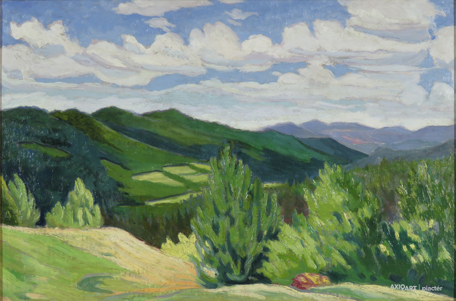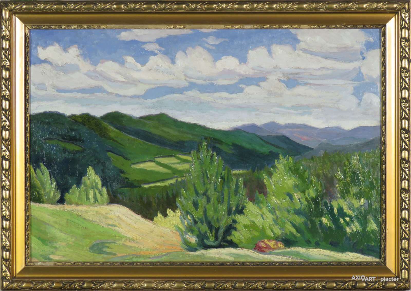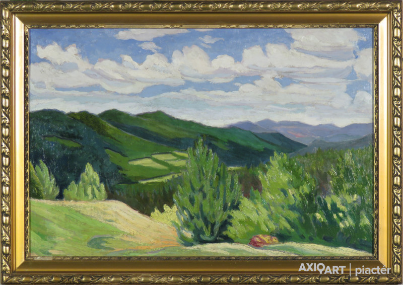 [1Y029/Z018] Olaj farost festmény, üveglap mögött, hibátlan képcsarnokos keretben. Hátoldalán Képcsarnok Vállalat papír címkéje: A művész neve: SCHÉNER MIHÁLY A kép címe: TÁJ Magasság: 66.5 cm Szélesség: 86 cm Súly: 6.54 kg Schéner Mihály festő, grafikus, szobrász, keramikus, bábtervező Medgyesegyháza, 1923-01-9 Elhalálozott: Budapest, 2009. május 11. Honlap: http://www.kormendigaleria.hu/kiadvany.html 1942-1947: Magyar Képzőművészeti Főiskola, tanára: Rudnay Gyula. 1978: Munkácsy-díj; 1984: érdemes művész; 1989: kiváló művész; 1995: Kossuth-díj. 1992-től a Magyar Művészeti Akadémia, 1993-tól a Széchenyi Irodalmi és Művészeti Akadémia tagja. 1956-ig tanított. 1982: Nagyatádi Faszobrász Alkotótelep, 1985: Nemzetközi Acélszobrász Alkotótelep, Dunaújváros. A stílusában felismerhető, mégis sokféle műtárgyat létrehozó ~ gazdag, állandóan alakuló életműve a folyton változó világban helyét kereső, az alkotói szabadságot megvalósító XX. századi képzőművész példázata lehetne. Magát expresszív-szürrealista alkotónak nevezi. Egyaránt dolgozik festékkel, textillel, fával, fémmel. Rajzol, szerkeszt, farag, épít, gyúr, varr és ragaszt, felhasználja a mézesbábok öntőformáit. Festő, rajzoló, textilszobor- és bábkészítő, fazekas, asztalos, esztergályos. Háromlépcsős folyamatban gondolkozik: rajzban tervez, majd fest, szobrot készít, “formába önt”, mindig a végső plasztikai megoldást keresi. Ami állandó és mégis játékosan változékony megjelenésű Schéner művészetében, az a gyermekkori emlékek által meghatározott népi mesterségek iránti tiszteletet kifejező motívumkincs, a tárgyi folklór formakészlete, amely már-már kézjegyként ismétlődik munkáin. Mitologikussá nőtt képzelete új lényeket teremt, pl: a Pigulát, amely disznótestű, emberfejű teremtmény. Schéner festményein a szürrealista motívumokat konstruktív szerkezetbe rendezi, a geometriát és az organikus természeti motívumokat egyaránt beépíti műveibe. A népi, népművészeti formakincsből merített lovas huszárok, betyárok, szegénylegények cifra szűr mentéje, piros csákója, fekete csizmája, az önálló életet élő zsinórdíszek és mézeskalács bábok, a kiskocsik a gyermekkori vásárok, búcsúk színes forgatagába vezet. A primér motívumokat aztán felváltják a vastagon felhordott felületbe karcolt jelek, vonalhálózatok, amelyek a játszó gyermek homokba rajzolt ábráit, a pásztorember fába vésett üzeneteit, az ősember barlang falába rótt mágikus jeleneteit idézik meg. A művész pillanatnyi érdeklődésének megfelelően a színek búvópatakként tűnnek el és jelennek meg ismét. A 60-as években leginkább a formákkal való játék érdekelte, a festmények felülete egyre gazdagodott: a táblaképek felületén applikációk jelentek meg, vagy lemállasztott rétegek hagyták maguk után hiányukat, motívumok nélküli ősformák, archetipikus képzetek bukkantak fel művészetében. A véletlenszerűnek látszó rétegekkel való játék azonban tudatos komponálás eredménye, amely később nyilvánvaló ritmusnak és formai szerkesztettségnek adja át a helyét, mint a Törvénytáblák c. sorozaton. A különböző művészi kifejezési formák egymásra termékenyítő hatással vannak, át- meg áthatják egymást. Textilszobrai, amelyekkel új műfajt teremtett, ugyanazzal az automatikus, expresszív-szürrealista módszerrel készülnek, mint festményei. A hagyományosan a népművészetben alkalmazott anyag, a filc lehetőséget ad a népi formakincs felelevenítésére, amely azonban a művész különös szürrealista átiratában jelenik meg. A szívekkel kivarrt, zsinórdíszes Posztókotlós c. művén mézesbábok lógnak, hátán huszárok lovagolnak. Egész sor textilből készült kéz-plasztikát alkot, amelyeket az ujjakra rávarrt díszekkel öltöztet, személyesít meg. A színes-különös világból aztán ~ újra puritán képi és formai rendbe juttatja el a nézőt, majd nemsokára tépett, gyűrt, vágott, csorgatott, repedezni hagyott szenvedélyesen vonagló képi felületeket hagy hátra. Schéner készített apró gyermekjátékokat, térstruktúra-tereket, mászókákat is. A magyar népi formák mellett szürreális játékaiban gyakran alkalmaz görög mitológiai alakokat, “elkentaurosodott” lovakat, Gorgó-fejeket, sellőket, hárpiákat, Pán-ábrázolásokat. Schéner nemcsak saját művészetéről publikál, hanem művésztársairól is számos írása jelenik meg, elsősorban az Új Auróra c. folyóiratban, amelynek egy ideig főmunkatársa volt. Irodalom kiállítása, Magyar Építőművészet, 1962/4. Húsz év után, Művészet, 1965/4. BOZÓKY M.: ~, Tiszatáj, 1968/5. PERNECZKY G.: Nincs uborkaszezon, Élet és Irodalom, 1969. augusztus 8. BARÁNSZKY-JÓB L.: ~, Művészet, 1969/9. LÁSZLÓ GY.: ~ kaposvári kiállítása, Jelenkor, 1969/4. MAJOR M.: Pásztorok, betyárok, huszárok - kezek, Tükör, 1970. szeptember 15. FRANK J.: Bemutatjuk ~t, Élet és Irodalom, 1972. május 6. ról kiállítása ürügyén, Képzőművészeti Almanach, Budapest, 1972 Sötétkék kokasok, Élet és Irodalom, 1973. szeptember 9. MAJOR M.: ~ játékai, Élet és Irodalom, 1974. július 27. BARTA J.: Egy különös művész, Alföld, 1974/6. VADAS J.: Szárnykészítők, Élet és Irodalom, 1975. október 4. JUHÁSZ F.: A halál ellen játszani, Élet és Irodalom, 1975. május 17. PAP G.: Kincsek és műkincsek, Művészet, 1975/6. P. SZŰCS J.: Az utak kettéválnak, Művészet, 1978/3. Békési művészet, Művészet, 1978/7. SZAMOSI F.: ~ [kismonográfia], Budapest, 1978 VADAS J.: Játék a játékkal, Élet és Irodalom, 1979. augusztus 18. NÉMETH L.: ~ műveiről, Művészet, 1979/4. MIKLÓS P.: Mit akar ez a múzeum?, Művésze