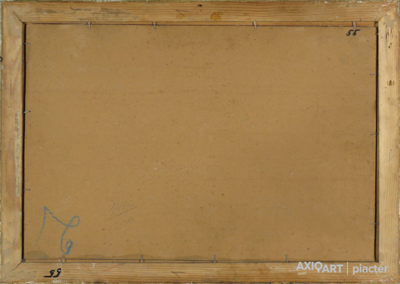 [1Y034/Z018] Olaj vászon festmény, üveglap mögött, szép állapotú képcsarnokos keretben. Akasztási lehetőséggel rendelkezik. Jelezve jobbra lent: Balog A. Hátoldalán a kereten Képcsarnok Vállalat címke töredék látható, rajta felirat: A művészeti alkotás címe: LEÁNY Magasság: 86 cm Szélesség: 66 cm Súly: 5.37 kg Balogh András (képei szignóján az 1960-as évektől Balog) (Budapest, 1919. március 14. — Budapest, 1992. március 18.) festőművész, kerttervező, művészeti szakíró, c. egyetemi tanár. Életpályája és munkássága Apai ágon a géresi Baloghok Szatmár megyéből a dél-erdélyi Alsó-Fehér megyébe származtak, anyai fölmenői a Székelyföldön: Csíkban, ill. Háromszéken éltek. Szülei az 1900-as évek elején költöztek Budapestre. A Képzőművészeti Főiskolán 1937-ben kezdte meg tanulmányait Burghardt Rezső tanítványaként. 1950-töl 1980-ig a Kertészeti Főiskolán (később Kertészeti Egyetem) tanított a kerttervezési tanszéken művészettörténetet, szabadkézi rajzot, ábrázoló geometriát és kertesztétikát. Az Iparművészeti Főiskolán óraadóként kertesztétikát adott elő. 1971-ben részt vett a firenzei Palazzo Strozziban rendezett biennálén, ahol aranyéremmel tüntették ki. Rendszeres önálló és csoportos kiállítások sora következett ezután nemcsak Magyarországon, hanem Olaszország és Németország számtalan városában, kiállított Finnországban, Kanadában is. Egyéni kiállításai gyakran katalógusokkal jelentek meg.[1][2][3] Nyaranként Tihanyban vagy Zsennyén alkotott. Festészetét poétikus realizmus jellemzi, dekoratív elrendezésű kompozíciói és lágy színvilága bensőséges hangulatot, szépséget, harmóniát árasztanak. (Lány egyszarvúval; Alvó, Emberpár és táj, stb.) Nagyon sok tájképet és portrét festett, történelmi személyiségekről is, 1978 és 1989 közt megfestette Mindszenty József bíboros portréját. Képei a Magyar Nemzeti Galériában, vidéki múzeumainkban, olasz, német, finn, észak-amerikai, kanadai, ausztráliai gyűjteményekben vannak.