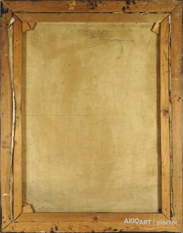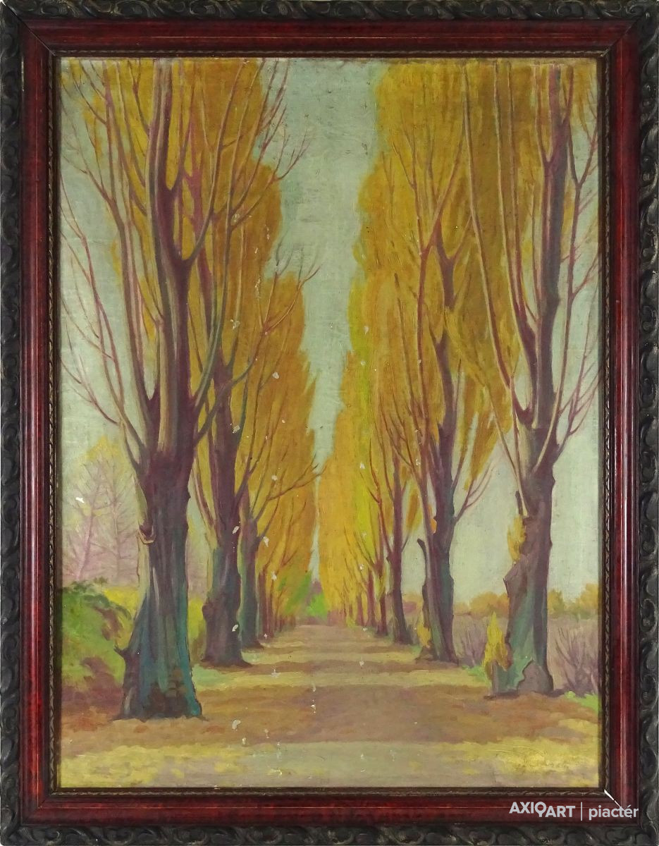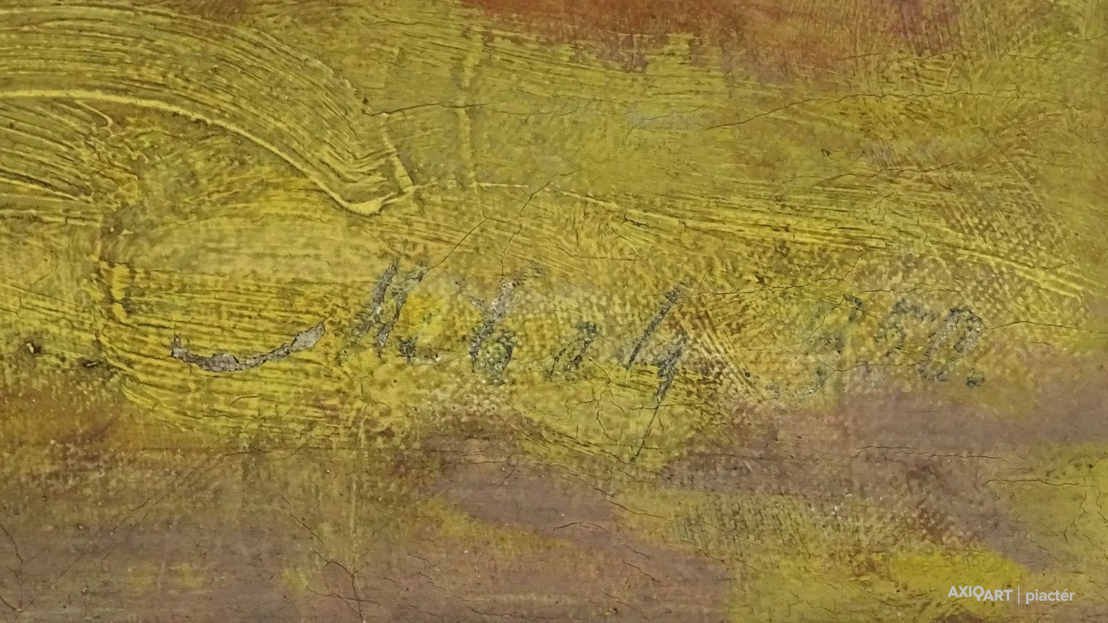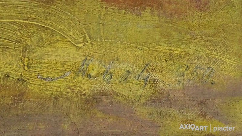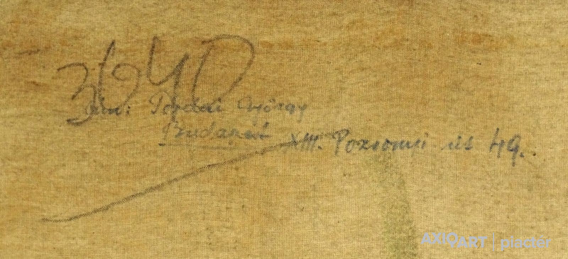 [1K344/032] Olaj vászon festmény régi keretben. Akasztási lehetőséggel rendelkezik. Datált jelzés jobbra lent, lásd fotó. Hátoldalán régi tulajdonosi feljegyzés, lásd fotó. Magasság: 90 cm Szélesség: 70.5 cm Súly: 2.65 kg