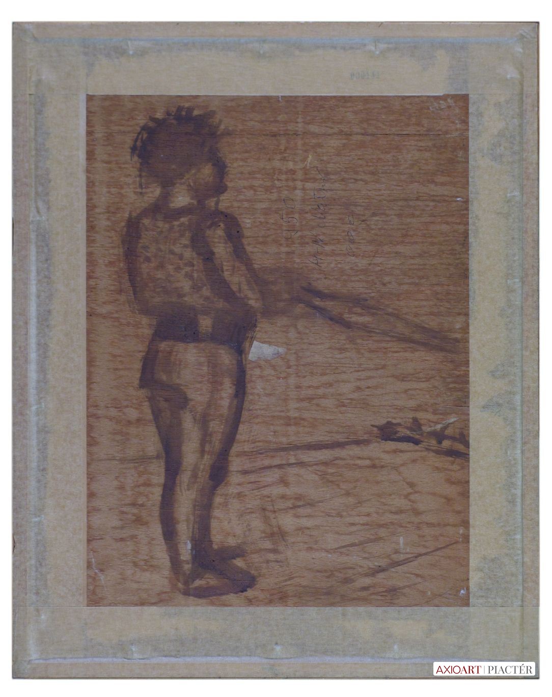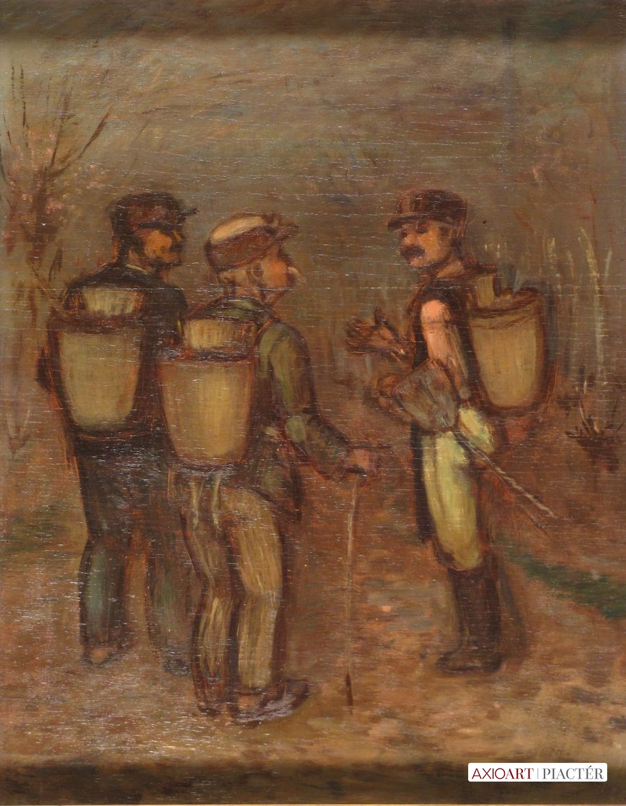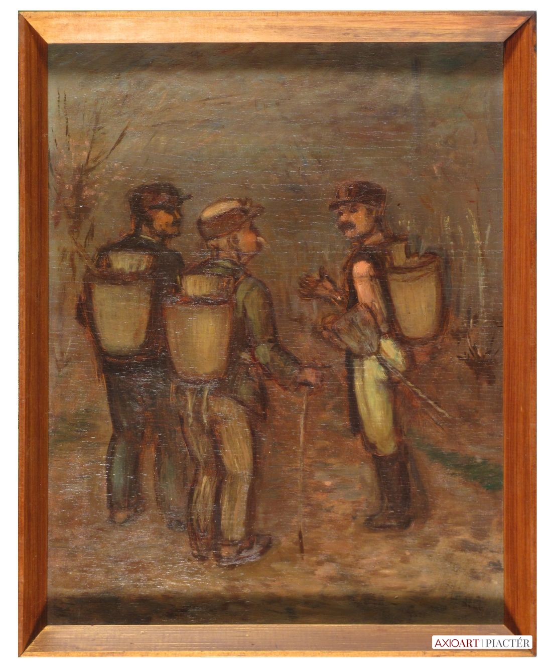 [FK1751/BX-2] A kép mérete: 16 x 25 cm keret nélkül. Készült: Olaj, Falemez A kép Magyar-Mannheimer Gusztáv (Pest, 1859, Budapest, 1937) alkotása. Jelezve: Jelzés nélkül A festmény jó állapotban van. Keret: Új MNG bírálati szám: 1108/1977. Magyar festők és grafikusok életrajzi lexikona I-II. Festő. Előbb a fővárosi Mintarajziskolában, később Bécsben H. Makartnál végzett művészeti tanulmányokat. 1878-tól a müncheni Képzőművészeti Akadémia növendéke lett. Itt a rézkarcoló Raab-nak, utána Löfftznek és Wagner Sándornak az irányításával tanult olyan sikerrel, hogy 1880-ban ezüstérmet, 1881-ben pedig dicsérő oklevelet és budapesti ösztöndíjat is kapott. Budapestre hazatérve, Benczúr-mesteriskolájában tanult a kapott ösztöndíjjal. Ekkor mutatkozott be a budapesti Műcsarnok közönségének az "Olvasó öregasszony", "A vőlegény jó kilátásai" című éleképekkel és néhány vázlattal. Később Bécsben H. Makartnak lett segédje egy dekoratív munkánál. A '90-es évek végén a nagybányai művésztelepen is megfordult. Ezután következett gyakran megismételt olaszországi útja. Még a sugárzó verőfény országában is híven kísérte a tompító müncheni tónus. 1901-ben "Esti hangulat" című alkotásával Társulati-díjat, 1902-ben állami kis aranyérmet nyert. 1910-ben a Velencei Biennálén "Tavasz" című festményét a Velencei Modern Képtár számára vásárolták meg. 1912-ben állami nagy aranyérmet nyert. Több ízben vett részt a budapesti Műcsarnok és a Nemzeti Szalon seregszemléin. 1913-ban, 1920-ban, 1922-ben, 1929-ben és 1933-ba kollektív kiállítása volt az Ernst Múzeumban. Stílusát a romantikus, a naturalizmus és a Makart-féle akadémikus dekorativizmus ötvözete jellemezte. A Szinyei Társaság alapítói közép tartozott. Illusztrálta Bródy Sándor, Mikszáth Kálmán, stb. műveit. Számos műve megtalálható a Magyar Nemzeti Galériában. Önarcképe a Magyar Történeti Képtárban van. (ML, Éber, L-MMM) Magyar festők és grafikusok életrajzi lexikona I-II. Műgyűjtők és kereskedők kézikönyve Festő. Előbb a fővárosi Mintarajziskolában, később Bécsben H. Makartnál, Münchenben pedig L. von Löfftznél és Wagner Sándornál tanult. Budapestre visszatérve, Benczúr-mesteriskolájában kapott több éves ösztöndíjat. 1901-ben "Esti hangulat" c. alkotásával Társulati-díjat, 1902-ben állami kis aranyérmet nyert. 1910-ben a Velencei Biennálén "Tavasz" c. képét a Velencei Modern Képtár számára vásárolták meg. 1912-ben állami nagy aranyérmet kapott. Több ízben szerepelt a Műcsarnok és a Nemzeti Szalon kiállításain. 1913-ban, 1920-ban, 1922-ben, 1929-ben és 1933-ban kollektív tárlata volt az Ernst Múzeumban. Stílusát a romantikus, a naturalizmus, és a Makart-féle akadémikus dekoratizmus ötvözete jellemezte. A Szinyei Társaság alapítói közé tartozott. Illusztrálta Bródy Sándor, Mikszáth Kálmán, stb. műveit. Számos műve megtalálható a MNG-ban. Önarcképe a MTK-ban van. (ML, Éber) Magyar festők és grafikusok adattára A bécsi akadémián Makart, a müncheni akadémián pedig Wágner tanítványa volt. Hazatérve a Benczúr-mesteriskola tagja lett. Stílusát a romantikus, a naturalizmus és a Makart-féle akadémikus dekoratizmus ötvözte, jellemezte. 1901-ben Esti hangulat c. képével társulati díjat, 1902-ben állami kis aranyérmet, 1912-ben állami nagy aranyérmet nyert. Tavasz c. képét 1910-ben megvásárolta a velencei Modern Képtár. Több ízben szerepelt csoportos kiállításon a Nemzeti Szalonban és az Ernst Múzeumban. Képei találhatók a MNG-ban. Számos illusztrációt is készített (Mikszáth Kálmán és Bródy Sándor műveihez stb.). Önarcképe a Magyar Történelmi Képcsarnokban található. Egyik alapító tagja volt a Szinyei Társaságnak. - Irod.: Herman Lipót: Magyar-Mannheimer Gusztáv. Magyar Művészet, 1937. Művészeti lexikon I-IV. Festő. Előbb a Mintarajziskolában, majd Bécsben H. Makartnál, Münchenben L. von Löfftznél és Wagner Sándornál tanult. Bp.-re visszatérve Benczúr mesteriskolájában kapott több éves ösztöndíjat. 1910-ben a Velencei Biennále kiállításán egyik képét (Tavasz) a velencei Modern Képtár számára megvásárolták. Színes, oldott előadású tájképeivel, sötétes hangulatú alakos kompozícióival a kiállítások állandó szereplője volt. Illusztrálta Bródy, Mikszáth stb. műveit. A Szinyei Társaság alapító tagjai közé tartozott, s több állami díjat nyert. Kampis Antal Művészeti lexikon I-II. Festő. Münchenben és Bécsben végezte tanulmányait. Képei túlnyomó részének tárgyát gyakori olaszországi tanulmányútjaiból merítette. Ilyenekkel szerepelt a Műcsarnokban a nyolcvanas évek óta, de temperamentumos előadása, mélytüzű színei csak nagysokára szereztek neki elismerést. A Campagna, sziklás, pikáns olasz tájai, kavargó felhői, patetikus hangulatai, élénk és egyéni előadása végre legjobb művészeink sorába emelték. Ily művei: Est a Campagnában, Esti hangulat, Erdőszéle stb. Eleinte inkább világos színhatású, utóbb mélyrefogott barnából és zöldből formált színharmóniája jelentkezik néhány alakos képén és tanulmányfején is (Libapásztorok, Arckép, Pulykapásztorlány)