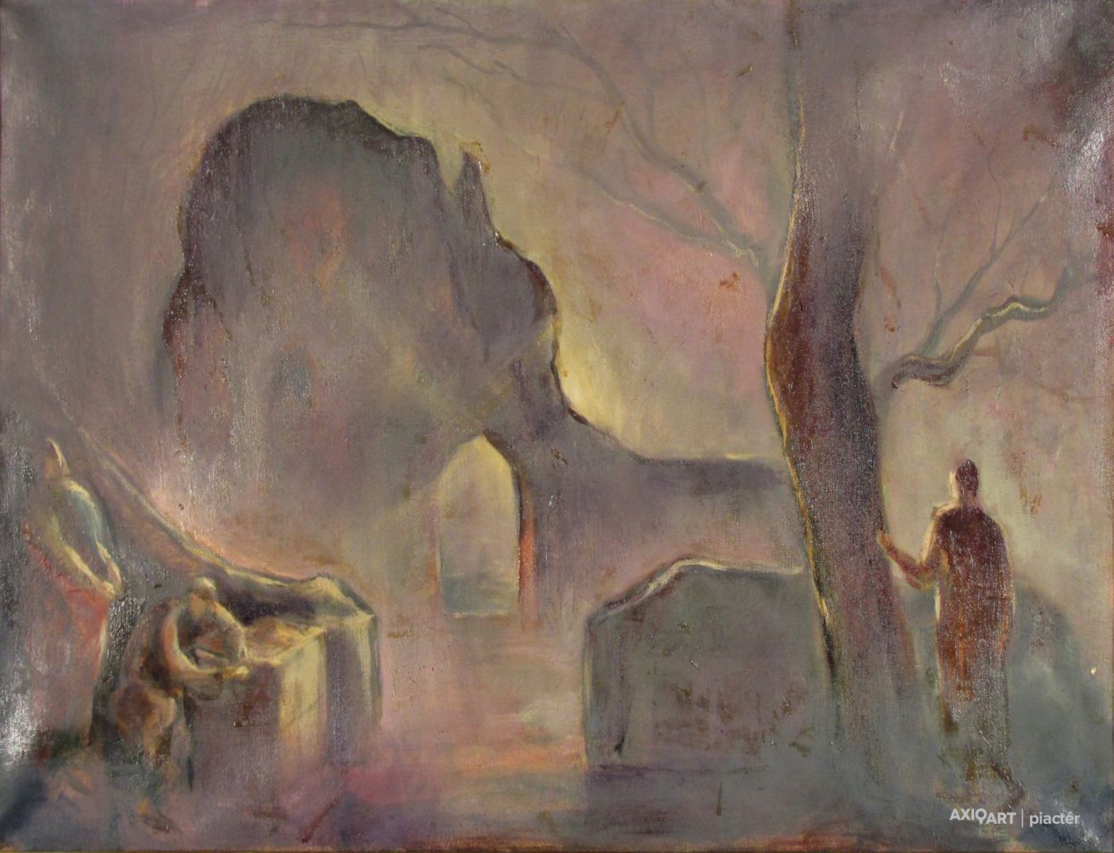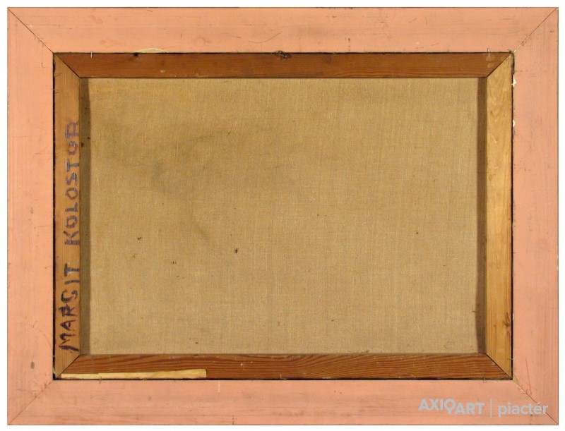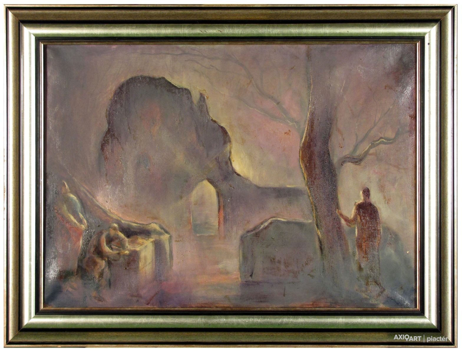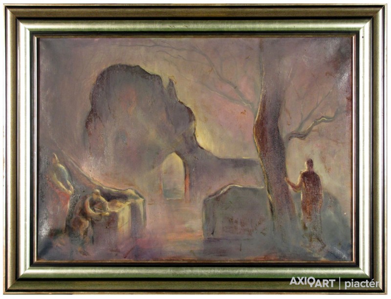 [FKC235/BX-1] A kép mérete: 49 x 41,5 cm keret nélkül. Készült: Olaj, Vászon A kép Vass Vera (Szeged, 1908, Kőszeg, 1958) alkotása. Jelezve: jelzés nélkül A festmény jó állapotban van. Keret: Új A festmény hátoldalán: Szelesi Zoltán Móra F. Múzeum évkönyve 1972-73/2. felirat látható. Kortárs magyar művészeti lexikon I-III. festő (Szeged, 1908. nov. 10.-Kőszeg, 1958. szept. 15.) Festői pályafutását a 30-as évek elején kezdte: először Szegeden, Buday Györgytől fametszet technikát és grafikát, majd Bp.-en reklámgrafikát tanult. 1934-38 között Aba Novák Vilmos festőiskolájának növendéke, egyes munkáknál a mester munkatársa volt. A 30-as évek végén Bp.-en a Szinyei Társaság több kiállításán is részt vett. A 40-es évek közepétől kiújuló gyermekkori betegsége nagy mértékben korlátozta aktív festői pályafutását és a képzőművészeti közéletben való részvételét; az 50-es évek elejétől már festeni sem tudott. Ekkor verseket kezdett írni, melyek egy részét férfi álnéven elküldte véleményezésre Németh Lászlónak, aki komoly elismeréssel nyilatkozott verseiről. Festészete leginkább Gulácsy Lajos légies, finom piktúrájához hasonlítható (Parkban, Délután, 1940 k.), kisebb mértékben mutat hasonlóságokat Rippl-Rónai enteriőr korszakával (Enteriőr, 1940 k.). Akár figurát, akár csendéletet vagy bensőséges jelenetet fest, a képmezőt sfumáto-szerű pára fedi be, e mögött bukkan fel a staffázs-figura, mely kilép szerepéből, jelentőssé válik. Félig elfelejtett művészete napjainkban kezdi elfoglalni helyét a művészettörténetben. Ek: 1995: Vass Vera emlékkiállítása, Móra F.M. Szeged; 1998: Ráday G.: 1999: Vass Vera emlékkiállítása, Sigray Palota, Kőszeg; Vass Vera emlékkiállítása, SzK, Szhely. Vcsk: 1947: Magyar Képzőművészek Szabad Szakszervezete kiállítása, Károlyi Palota. Mk: Móra F. M., Szeged. Km: freskók restaurálása (a Pannonhalmi Apátság Jubileumi Kápolnája) Irod.: Szuromi P.: A holdvilág jegyese - Vass Vera élete és festészete, Szeged, 1995. júl-dec.; Szuromi P.: Szépen, szomorúan, légiesen, ÉS, 1995. okt. 20.; N.N.: Egy elfelejtett művész: Vass Vera, Kőszeg és vidéke, 1999. ápr. 23., Lengyel A.: "... ismeretlensége biztosan fel fog tárulni" - Vass Vera hagyatékából, Szeged, 1994. júl-aug. (H.F.)