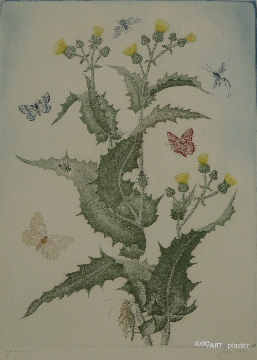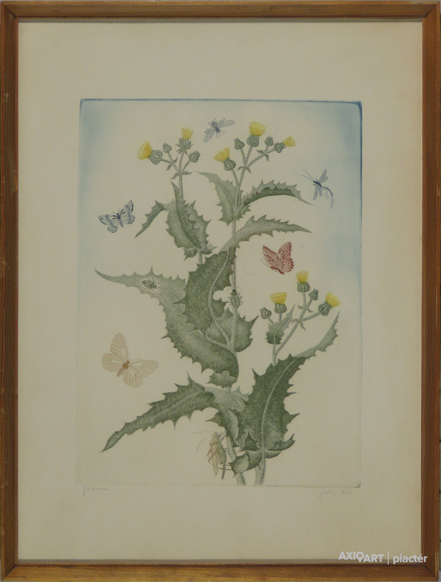 [FK3831/FL-5] A kép mérete: 29 x 19,5 cm keret nélkül. Készült: Rézkarc, akvatinta, Papír A kép Kass János (Szeged, 1927, Budapest, 2010) alkotása. Jelezve lent "Mars, 94/100, Kass 78 (ceruzával)" A festmény jó állapotban van. Keret: Ép Magyar festők és grafikusok életrajzi lexikona I-II. Grafikus, festő. A budapesti Iparművészeti Iskola elvégzése után a Képzőművészeti Főiskolán tanult, hol Hincz Gyula, Konecsni György és Kádár György tanítványa volt. 1960-1961-ben a lipcsei Houchschule für Grafik und Buchkunst könyvművészeti tanszékén aspiráns, majd 1967-81 között a Magyar Iparművészeti Főiskola grafikai tanszékén tanít. 1973 óta postabélyegeket tervez, legjobb könyvillusztrátoraink közé tartozik, filmplakátokat is készít. Számos hazai és külhoni bemutatón szerepelt. Több vidéki bemutató mellett 1964-ben a Dürer Teremben, 1967-ben a Kulturális Kapcsolatok Intézetében, 1973-ban a Petőfi Irodalmi Múzeumban, Békéscsabán a Tízek Klubjában volt önálló kiállítása. Önállóan mutatkozott be Olaszországban és Ausztriában, valamint Svájcban. Kiállított az 1960-as velencei Biennálén, az 1961-es párizsi Ifjúsági Biennálén, szerepelt a luganoi, a tokiói, a ljubjanai, a Sao Pauloi és a Buenos Airesi Beinnálékon, a berlini Intergrafikon, továbbá a magyar grafika számos külföldi bemutatóján. Több hazai és nemzetközi díj nyertese. 1956-1959 között Derkovits-ösztöndíj, Munkácsy-díj (1954, 1967), a brüsszeli világkiállítás ezüstérmese (1958), Érdemes Művész (1966, 1977), Kiváló Művész (1986), Magyar Köztársaság Érdemrend tiszti keresztje (1992), Kossuth-díj (1999). Moszkvában, Brnóban, Torontóban, Pozsonyban, Sao Paulóban, magyar és német "Szép könyv" versenyeken nyert díjakat. 1966-ban és 1977-ben Lipcsében, 1999-ben Frankfurtban a könyvművészeti kiállításon, "A legszebb könyv" díjat kapta. A Magyar Festők Társaságának, az ATIPY ICTA, DCC (London), CDL (Franciaország) és a Német Könyvművész Szövetség tagja. Szeged díszpolgára. Sokoldalú, eredeti művész, a legegyszerűbb mondanivalóját is gondolati elemekkel tölti meg. Munkái megtalálhatók a Magyar Nemzeti Galériában, számos vidéki és külföldi közgyűjteményben. (MÉ, ML, Sasvári Edit-Pogány Gábor adatközlése nyomán) Magyar festők és grafikusok életrajzi lexikona I-II. Műgyűjtők és kereskedők kézikönyve Grafikus, festő. A bp.-i Iparművészeti Iskola elvégézése után a Képzőművészeti Főiskolán tanult, hol Hincz Gyula, Konecsni György és Kádár György tanítványa volt. 1958-ban a brüsszeli világkiállításon pannója ezüstérmet nyert. Legjobb könyvillusztrátoraink közé tartozik. Filmplakátokat is készít. Számos hazai és külföldi tárlaton szerepelt. Több vidéki bemutató mellett 1964-ben a Dürer Teremben, 1967-ben a Kulturális Kapcsolatok Intézetében, 1973-ban a Petőfi Irodalmi Múzeumban, Békéscsabán a Tízek Klubjában volt önálló kiálllítása. Önállóan mutatkozott be Olaszországban és Ausztráliában, valam. Svájcban. Kiállított az 1960-as Velencei Biennálén, az 1961-es párizsi Ifjusági Biennálén, szerepelt a luganoi, a tokiói, a ljubjanai, a Sao Pauloi és a Buenos Airesi Biennálékon, a berlini Intergrafikon, továbbá a magyar grafika számos külföldi bemutatóján. Több hazai és nemzetközi díj nyertese. 1958-ban, a brüsszeli világkiállításon ezüstérmet, 1966-ban és 1977-ben Lipcsében aranyérmet nyert. 1956-1959 k. Derkovits-ösztöndíjban részesült, 1954-ben, 1967-ben Munkácsy-díjjal, 1977-ben pedig érdemes művészi címmel tüntették ki. Sokoldalú és eredeti művész, a legegyszerűbb mondanivalóját is gondolati elemekkel tölti meg. 1960-61-ben a Lipcsei Könyvművészeti Fősikolán aspiráns, majd a bp.-i Iparművészeti Főiskolán tanárként működött. (MÉ, ML) Magyar festők és grafikusok adattára Az Iparművészeti Főiskolán kezdte, majd a Képzőművészeti Főiskolán fejezte be tanulmányait 1951-ben Hincz Gyula, Konecsni György és Kádár György növendékeként. 1960-1961-ben a lipcsei Könyvművészeti Főiskolán aspiráns, majd az Iparművészeti Főiskola tanára. Több vidéki bemutató (Miskolc, Debrecen, Eger, Veszprém stb.) mellett 1964-ben a Dürer Teremben, 1967-ben a Kulturális Kapcsolatok Intézetében, 1973-ban a Petőfi Irodalmi Múzeumban, Békéscsabán a Tízek Klubjában volt egyéni kiállítása. Plasztikai kísérleteit 1975-ben a Kulturális Kapcsolatok Intézetében, 1976-ban a Csepel Galériában mutatta be csoportkiállításon. Önállóan mutatkozott be Olaszországban (1963), Ausztráliában (1970) és Svájcban (1976). Kiállított az 1960-as Velencei Biennálén, az 1961-es Párizsi Ifjúsági Biennálén, szerepelt a lugánói, tokiói, ljubjanai, Sao Paulo-i, Buenos Aires-i biennálékon, a berlini Intergrafikon, továbbá a magyar grafika számos külföldi bemutatóján. Több hazai és nemzetközi díj nyertese, az 1958-as brüsszeli világkiállításon ezüstérmet, 1966-ban és 1977-ben Lipcsében aranyérmet kapott. 1956-1959-ben Derkovits-ösztöndíjban részesült, 1954-ben és 1967-ben Munkácsy-díjjal, 1977-ben pedig érdemes művész címmel tüntették ki. Sokoldalú és utolérhetetlenül eredeti művész. A legegyszerűbb mondanivalóját is gondolati elemekkel tölti meg. A hazai könyvművészet, tervezés és illusztrálás kiemelkedő egyénisége. Szülővárosának ajándékozott műveiből állandó kiállítása nyílt Szegeden. - Irod.: P. Sz. T.: Művész életrajzok. Bp. 1985. Művészeti lexikon I-IV. Grafikus, Munkácsy-díjas. Az Iparművészeti Iskolán tanult, majd a Képzőművészeti Főiskolát végezte el 1951-ben. Hincz Gyula, Konecsni György és Kádár György voltak a mesterei. Az 1958-as brüsszeli világkiállításon pannója ezüstérmet nyert. Legjobb k