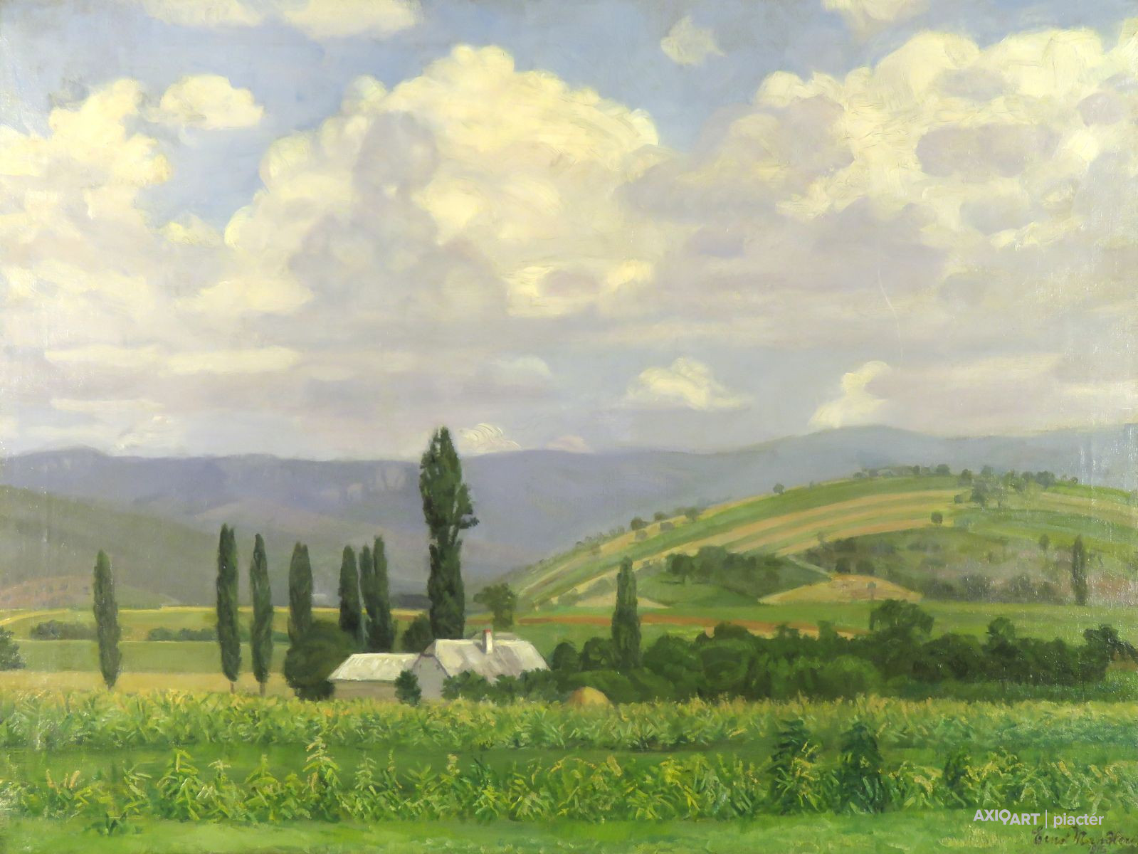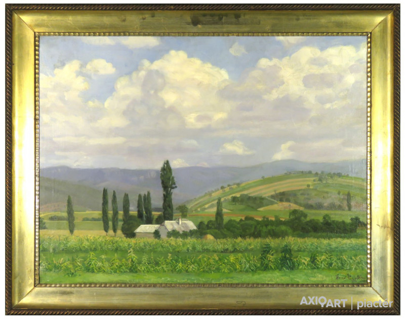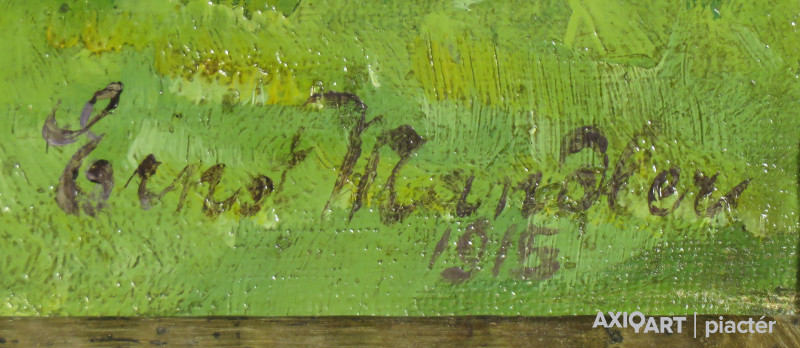 [FK2668/Bp301/4] A kép mérete: 50,5 x 80,5 cm keret nélkül. Készült: Olaj, Vászon A kép Moldován István (Kolozsvár, 1911) alkotása. Jelezve Jobbra lent "Moldován István" A festmény jó állapotban van. Keret: Ép A festmény hátoldalán a Képcsarnokvállalat raglapja láltható. Magyar festők és grafikusok életrajzi lexikona I-II. Festő. Tanulmányait Kolozsvárott, a Szépművészeti Főiskolán kezdte 1930-ban. A következő esztendőben a nagybányai Szépművészeti Iskolában Thorma János és Krizsán János korrektúráján képezte magát. 1931-ben a budapesti Képzőművészeti Főiskola hallgatója lett. Réti István, később Szőnyi István volt a mestere. Már mint főiskolás sok díjat és kitüntetést nyert. 1948-ban megkapta a római ösztöndíjat, de lemondva róla, Erdélybe ment. 1948-1950 között Erdélyben élt, és népművészetben gazdag vidékein festett. 1943-ban Kolozsvárott, 1946-ban Gyöngyösön, 1955-ben, 1959-ben és 1962-ben a Kulturális Kapcsolatok Intézetében, illetve a Csók Galériában rendezett egyéni bemutatókat. Ezen kívül több Európai országban, az USA-ban, Kanadában és Indiában is bemutatta munkáit. Eleinte sajátos atmoszférájú, lírai tájképeket, eleven színvilágú képmásokat festett, később mondernebb, erőteljesebben szerkesztett művekkel jelentkezett. A Pécsi Tanárképző Főiskola számára mozaikot készített. Erdély szerelmese volt. A székely népművészet gazdag formavilágának hatása döntő jelentőségűvé vált sokoldalú művészetében. Műv. díjak: a Szinyei Társaság elismerő oklevele, a Főváros festészeti-díja, "Kolozsvár a képzőművészetben" II. díj, állami ösztöndíj, római ösztöndíj, a Képzőművészek Szövetsége Észak-Magyarországi festészeti díja, SZOT festészeti díj. Több murális művet (mozaik) alkotott. A Magyar Nemzeti Galéria több alkotását őrzi. (M. L.: Műv. 1967/6, RI-NM) Magyar festők és grafikusok életrajzi lexikona I-II. Műgyűjtők és kereskedők kézikönyve Festő. Tanulmányait a kolozsvári Szépművészeti Főiskolán kezdte 1930-ban. A nagybányai szabadiskolában is megfordult. Itt Thorma János és Krizsán János korrektúráján képezte magát. 1931-ben Budapesten a Képzőművészeti Főiskola hallgatója lett. Réti István, később Szőnyi István volt a mestere. Már mint főiskolás sok díjat nyert. 1948-ban megkapta a római ösztöndíjat, de lemondva róla, Erdélybe ment. 1948-1950 k. Erdélyben élt, és népművészetben gazdag vidékein festett. 1943-ban Kolozsváron, 1946-ban Gyöngyösön, 1955-ben, 1959-ben és 1962-ben a Kulturális Kapcsolatok Intézetében, illetve a Csók Galériában rendezett önálló kiállítást. Ezen kívül több Európai országban, az USA-ban, Kanadában és Indiában is bemutatta műveit. Eleinte sajátos atmoszférájú, lírai tájképeket, eleven színvilágú képmásokat festett, később mondernebb, erőteljesebben szerkesztett művekkel jelentkezett. A Pécsi Tanárképző Főiskola számára mozaikot készített. Erdély szerelmese volt. A székely népművészet gazdag formavilágának hatása döntő jelentőségűvé vált sokoldalú művészetében. 1942-ben megkapta a Szinyei Társaság elismerését, és a Főváros festészeti-díjat,1943-ban elnyerte a "Kolozsvár a képzőművészetben" c. díjat. 1947-ben állami ösztöndíjat,1948-ban a római ösztöndíjat, 1972-ben a Képzőművészek Szövetsége Észak-Magyarországi festészeti díját kapta meg. A MNG több művét őrzi. (M. L.: Műv.-1976/6) Magyar festők és grafikusok adattára Tanulmányait Kolozsvárott a Képzőművészeti Főiskolán, majd Nagybányán Thorma János és Krizsán János irányítása mellett kezdte, 1931-től Budapesten megszakításokkal a Képzőművészeti Főiskolán Réti István és Szőnyi István növendékeként fejezte be. 1949-ben és 1950-ben ösztöndíjjal dolgozott Erdélyben, majd hosszú tanulmányutakra indult Nyugat-Európába, az Egyesült Államokba, s a Szovjetunióba. Először Kolozsvárott lépett a nyilvánosság elé 1943-ban, majd 1946-ban Egerben és Gyöngyösön, 1947-ben Miskolcon, 1948-ban Hatvanban, 1955, 1961 és 1981-ben a Csók Galériában, 1959-ben a KKI-ben, 1960-ban Nagykanizsán, 1963-ban Kiskunfélegyházán, 1966-ban Debrecenben, 1969 és 1975-ben Békéscsabán, 1971-ben a Mednyánszky Teremben, 1973-ban Gyöngyösön és Debrecenben, 1977-ben Egerben, 1979-ben Veszprémben, 1983-ban Miskolcon, 1984-ben Csepelen, 1986-ban a Vigadó Galériában rendezett önálló kiállítást. Külföldi kiállításai: Moszkva, Varsó, India, Szófia, Párizs, Bukarest, Belgrád, New York, Montreál és Toronto. Eddig közel kétezer színes táblaképet festett, de szívesen foglalkozik mozaikkészítéssel is. 1964-ben a Pécsi Pedagógiai Főiskola, 1968-ban a Salgótarjáni Kórház, 1969-ben a názáreti templom és 1970-ben a Videoton Vállalat díszterme részére mozaikot készített. - Erdély szerelmese. A székely népművészet gazdag formavilágának hatása döntő jelentőségűvé vált festészetében. Olyan formanyelvet alakított ki magának, amely színvilágában és summázó formaalakításában sajátos erdélyi zamat érződik, ugyanakkor korszerűen modern is konstruktivista stílusa. Munkásságát 1942-ben a Szinyei Társaság elismerésével és a Fővárosi festészeti-díjjal, 1943-ben Római-ösztöndíjjal, 1947-ben Állam ösztöndíjjal (Románai), 1963-ben a SZOT festészeti-díjával, 1972-ben a Képzőművészek Szövetsége Észak-Magyarországi festészeti-díjával tüntették ki. - Irod.: Bíró Béla: Kolozsváry Moldován István. Erdélyi Helikon, 1943.; Felvinczi Takács Zoltán: Kolozsváry Moldován István. Kolozsvár, 1943.; Dutka Mária: Magyar Nemzet, 1961.; Maksay László: Moldován István. Művészet, 1965.; D. Fehér Zsuzsa. Moldován István, Bp. 1971.; Theisler G
