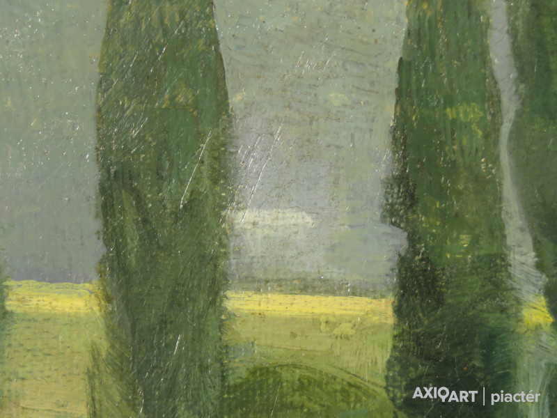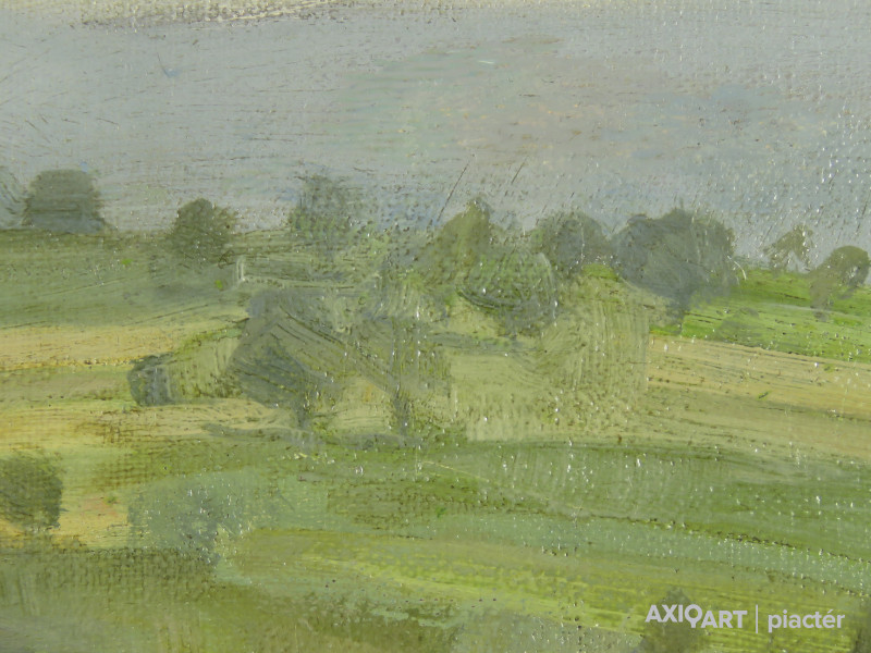 [FK0037/Z018] A kép mérete: 50 x 70 cm keret nélkül. Készült: Olaj, Vászon A kép Paizs László (Szentpéterúr, 1935) alkotása. Jelezve Jobbra lent "P. L." A festmény jó állapotban van. Keret: Ép A festmény hátoldalán a Képcsarnokvállalat címkéje található. Magyar festők és grafikusok életrajzi lexikona I-II. Festő. Tanulmányait a budapesti Iparművészeti Főiskolán végezte 1959-ben. Z. Gács György, Rákosy Zoltán és Szentiványi Lajos növendéke volt. A '60-as évek első felében hagyományosabb felfogású olajképeket festett, mozaikokat, freskókat, utóbb a pop-art körébe tartozó, a francia Arman munkáival rokon műveket alkotott. 1961 óta kiállító művész. Egyéni (Fényes Adolf Terem, Csók Galéria, Műcsarnok, Magyar Nemzeti Galéria, Halászbástya, Bástya Galéria, Vigadó Galéria, Budapest Galéria, Győr, Szombathely, Szeged, Zalaegerszeg, Duisburg, Aix-en-Provence, stb). és vegyes (Ernst Múzeum, Műcsarnok, Óbuda Galéria, Magyar Nemzeti Galéria, Csók Galéria, Vigadó Galéria, Székesfehérvár, Kaposvár, Pécs, Hódmezővásárhely, Firenze, Milano, Padova, Nápoly, Velence, Düsseldorf, Aachen, Genf, stb) tárlatokon vett részt. 1980-ban Munkácsy-díjjal jutalmazták, 1988-ban Érdemes Művész kitüntető elismerésben részesült. Munkáit őrzi a Magyar Nemzeti Galéria, a Fővárosi Képtár, a szombathelyi képtár, a pécsi Janus P. Múzeum, a székesfehérvári István Király Múzeum és a dunaszerdahelyi Kortárs Magyar Galéria. (H.B.: Műv, 1972/4, K.Gy.: Műv. 1977/2, K.G.: Műv. 1978/10, M.L.: Műv, 1983/5, R.G.: Műv, 1987/9, Sz.Gy.: Új Műv. 1995/4, MK) Magyar festők és grafikusok életrajzi lexikona I-II. Műgyűjtők és kereskedők kézikönyve Festő. Tanulmányait a bp.-i Iparművészeti Főiskolán végezte. Mozaikokat ferskókat, utóbb a pop-art körébe tartozó, a francia Arman műveivel rokon műveket alkotott. Mozaikok: a Szegedi Megyei Tanács, a Pécsi Óvoda, a Gödöllői Agrártudományi Egyetem. Freskók: Budapest - Csatárka úti Gyermekotthon. 1971-ben a Fényes Adolf Teremben volt kiállítása, 1983-ban pedig a szegedi Móra Ferenc Múzeumban nagyszabású tárlatokon mutatta be munkáit. 1988-ban érdemes művész kitüntető elismerésben részesült. (MK) Magyar festők és grafikusok adattára Az Iparművészeti Főiskolán végzett 1959-ben. Mozaikokat (Szeged, Megyei Tanács; Pécs, Óvoda; Gödöllő, Agrártudományi Egyetem), freskókat (Budapest, Csatárka úti Gyermekotthon), újabban a pop art körébe tartozó, a francia Arman műveivel rokon műveket alkotott. 1971-ben a Fényes Adolf Teremben nyílt kiállítása. 1983 februárjában a szegedi Móra Ferenc Múzeumban megrendezett nagyszabású tárlaton mutatta be alkotásait. 1988-ban érdemes művész kitüntető elismerésben részesült. - MK Művészeti lexikon I-IV. (Szentpéterur, 1935. dec. 26.- ): festő. Az Iparművészeti Főiskolán 1959-ben végzett Rákosy Zoltán, Z. Gách György és Szentiványi Lajos növendékeként. Épületdiszítő mozaikokat, (Szeged, Megyei Tanács, 1961; Pécs, Óvoda, 1964), műanyagfreskókat (Bp., Csatárka úti Gyermekotthon, 1964) és gobelinterveket készít. Kortárs magyar művészeti lexikon I-III. Festő, szobrász, grafikus. 1959: MIF, mesterei: Z. Gács György, Rákosy Zoltán, Szentiványi Lajos. 1980: Munkácsy-díj; 1988: érdemes művész. Főiskolás éveinek második felében, majd azt követően számos murális munka kivitelezésében vett részt, Fónyi Géza, Konecsni György, Z. Gács György, Rákosi Zoltán és Domanovszky Endre mellett dolgozva. A 60-as évek első felének hagyományosabb fölfogású olajképeket festett. 1964-ben a Velencei B.-n megismerkedett az amerikai pavilonban a pop art Európában akkor még újnak számító törekvésével, és részben ez inspirálta, hogy 1967-ben textil, fém, bőr anyagú "varrottas" képeket küldjön az FKS éves tárlatára; a megnyitó előtt többek között az ő munkáit is eltávolították a falról. A 70-es években pop art-os objekteket (A trónörököspár politikai gyilkosság áldozata lett, 1970, plexiüveg, újság, szarvasbogarak), majd konstruktív, átlátszó plexiüveg plasztikákat készített belső fénytörő határfelületekkel. A 80-as években készültek az anyagában színezett, konstruktív, nagyméretű poliészter szobrai, majd színes poliészter táblaképeket alkotott, mesterségesen roncsolt felületekkel, mintha régészeti leletek vagy atomtámadás utáni festmény-szurrogátumok lennének. Ekkor kezdett organikus plaszikájú bronzszobrokat is mintázni. A 90-es években, a táblaképek és szobrok mellett nagyméretű, egyedi grafikákat készített, formavilágában némileg a roncsolt táblaképekből kiindulva, de szinte kizárólag az emberi alakból elvonatkoztatott torzókat megjelenítve. Ek: 1966: Művészklub, Győr; 1971: Fényes A. T.; 1972: Bercsényi 28-30 G.; 1973: BME B-épület; 1976: Csók G.; 1977: G. Hildebrandt, Duisburg (NSZK); 1979: Bástya G., Halászbástya; Helyőrségi Műv. H., Nagyatád; József A. Műv. Közp., Szeged; Göcsej M., Zalaegerszeg; 1982: Bezzegh G., Küsnacht (CH); 1983: Móra F. M., Szeged; 1987: Műcsarnok (kat.); MNG; 1988: Pandora G., Badacsonytomaj; 1989: Parktheatter, Iserlohn (NSZK); Qualitas G.; Hevesi S. Színház, Zalaegerszeg; 1990: Vasarely Fondation (Ferdinánd Judittal, Fóth Ernővel), Aix-en-Provence (FR); 1994: Vigadó G.; 1997: Pest Center G.; 1998: Budapest G. (kat.); 1999: Pest Center G. (kat); G. Arcis, Sárvár; MMA, Bp.; 2001: SZK, Szhely; Ernst M. (kat.) Vcsk: 1961, 1964, 1966: FKS, Ernst M.; 1962: 9. Magyar Képzőműv. kiállítás, Műcsarnok; 1967: Mai magyar festészet, Új-Delhi; 1969: Vas megyei művészek, Savaria M., Szhely; V. Orsz. Grafikai B., Miskolc; 1971: Új művek, Műcsarnok; 1972: Fiatal művészek Budapestről. Likovni Salon, Újvidék (YU); 1972, 1973: Balatonboglár