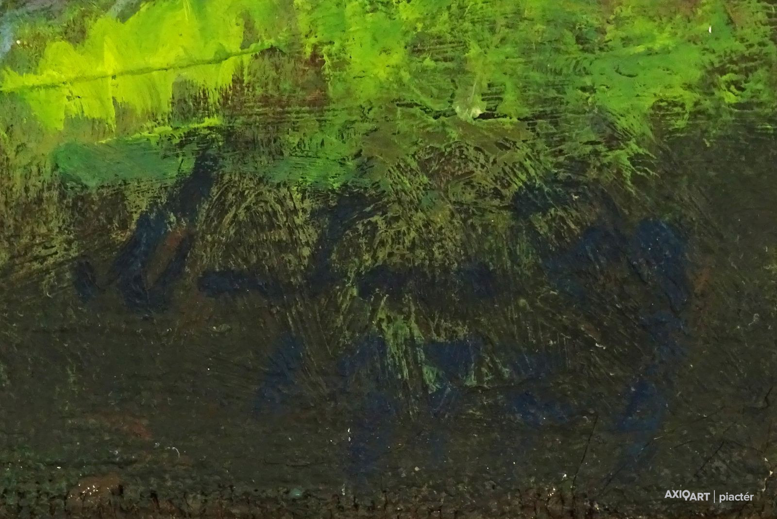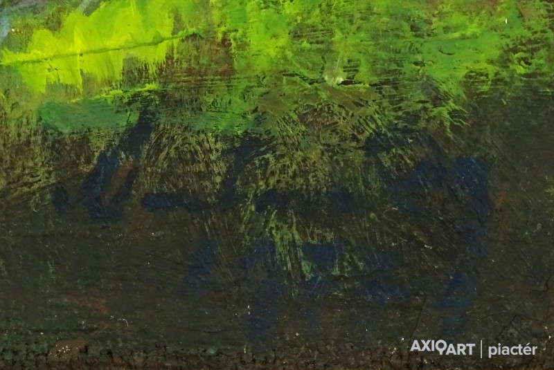 [FK0037/Z018] A kép mérete: 50 x 70 cm keret nélkül. Készült: Olaj, Vászon A kép Paizs László (Szentpéterúr, 1935) alkotása. Jelezve Jobbra lent "P. L." A festmény jó állapotban van. Keret: Ép A festmény hátoldalán a Képcsarnokvállalat címkéje található. Magyar festők és grafikusok életrajzi lexikona I-II. Festő. Tanulmányait a budapesti Iparművészeti Főiskolán végezte 1959-ben. Z. Gács György, Rákosy Zoltán és Szentiványi Lajos növendéke volt. A '60-as évek első felében hagyományosabb felfogású olajképeket festett, mozaikokat, freskókat, utóbb a pop-art körébe tartozó, a francia Arman munkáival rokon műveket alkotott. 1961 óta kiállító művész. Egyéni (Fényes Adolf Terem, Csók Galéria, Műcsarnok, Magyar Nemzeti Galéria, Halászbástya, Bástya Galéria, Vigadó Galéria, Budapest Galéria, Győr, Szombathely, Szeged, Zalaegerszeg, Duisburg, Aix-en-Provence, stb). és vegyes (Ernst Múzeum, Műcsarnok, Óbuda Galéria, Magyar Nemzeti Galéria, Csók Galéria, Vigadó Galéria, Székesfehérvár, Kaposvár, Pécs, Hódmezővásárhely, Firenze, Milano, Padova, Nápoly, Velence, Düsseldorf, Aachen, Genf, stb) tárlatokon vett részt. 1980-ban Munkácsy-díjjal jutalmazták, 1988-ban Érdemes Művész kitüntető elismerésben részesült. Munkáit őrzi a Magyar Nemzeti Galéria, a Fővárosi Képtár, a szombathelyi képtár, a pécsi Janus P. Múzeum, a székesfehérvári István Király Múzeum és a dunaszerdahelyi Kortárs Magyar Galéria. (H.B.: Műv, 1972/4, K.Gy.: Műv. 1977/2, K.G.: Műv. 1978/10, M.L.: Műv, 1983/5, R.G.: Műv, 1987/9, Sz.Gy.: Új Műv. 1995/4, MK) Magyar festők és grafikusok életrajzi lexikona I-II. Műgyűjtők és kereskedők kézikönyve Festő. Tanulmányait a bp.-i Iparművészeti Főiskolán végezte. Mozaikokat ferskókat, utóbb a pop-art körébe tartozó, a francia Arman műveivel rokon műveket alkotott. Mozaikok: a Szegedi Megyei Tanács, a Pécsi Óvoda, a Gödöllői Agrártudományi Egyetem. Freskók: Budapest - Csatárka úti Gyermekotthon. 1971-ben a Fényes Adolf Teremben volt kiállítása, 1983-ban pedig a szegedi Móra Ferenc Múzeumban nagyszabású tárlatokon mutatta be munkáit. 1988-ban érdemes művész kitüntető elismerésben részesült. (MK) Magyar festők és grafikusok adattára Az Iparművészeti Főiskolán végzett 1959-ben. Mozaikokat (Szeged, Megyei Tanács; Pécs, Óvoda; Gödöllő, Agrártudományi Egyetem), freskókat (Budapest, Csatárka úti Gyermekotthon), újabban a pop art körébe tartozó, a francia Arman műveivel rokon műveket alkotott. 1971-ben a Fényes Adolf Teremben nyílt kiállítása. 1983 februárjában a szegedi Móra Ferenc Múzeumban megrendezett nagyszabású tárlaton mutatta be alkotásait. 1988-ban érdemes művész kitüntető elismerésben részesült. - MK Művészeti lexikon I-IV. (Szentpéterur, 1935. dec. 26.- ): festő. Az Iparművészeti Főiskolán 1959-ben végzett Rákosy Zoltán, Z. Gách György és Szentiványi Lajos növendékeként. Épületdiszítő mozaikokat, (Szeged, Megyei Tanács, 1961; Pécs, Óvoda, 1964), műanyagfreskókat (Bp., Csatárka úti Gyermekotthon, 1964) és gobelinterveket készít. Kortárs magyar művészeti lexikon I-III. Festő, szobrász, grafikus. 1959: MIF, mesterei: Z. Gács György, Rákosy Zoltán, Szentiványi Lajos. 1980: Munkácsy-díj; 1988: érdemes művész. Főiskolás éveinek második felében, majd azt követően számos murális munka kivitelezésében vett részt, Fónyi Géza, Konecsni György, Z. Gács György, Rákosi Zoltán és Domanovszky Endre mellett dolgozva. A 60-as évek első felének hagyományosabb fölfogású olajképeket festett. 1964-ben a Velencei B.-n megismerkedett az amerikai pavilonban a pop art Európában akkor még újnak számító törekvésével, és részben ez inspirálta, hogy 1967-ben textil, fém, bőr anyagú "varrottas" képeket küldjön az FKS éves tárlatára; a megnyitó előtt többek között az ő munkáit is eltávolították a falról. A 70-es években pop art-os objekteket (A trónörököspár politikai gyilkosság áldozata lett, 1970, plexiüveg, újság, szarvasbogarak), majd konstruktív, átlátszó plexiüveg plasztikákat készített belső fénytörő határfelületekkel. A 80-as években készültek az anyagában színezett, konstruktív, nagyméretű poliészter szobrai, majd színes poliészter táblaképeket alkotott, mesterségesen roncsolt felületekkel, mintha régészeti leletek vagy atomtámadás utáni festmény-szurrogátumok lennének. Ekkor kezdett organikus plaszikájú bronzszobrokat is mintázni. A 90-es években, a táblaképek és szobrok mellett nagyméretű, egyedi grafikákat készített, formavilágában némileg a roncsolt táblaképekből kiindulva, de szinte kizárólag az emberi alakból elvonatkoztatott torzókat megjelenítve. Ek: 1966: Művészklub, Győr; 1971: Fényes A. T.; 1972: Bercsényi 28-30 G.; 1973: BME B-épület; 1976: Csók G.; 1977: G. Hildebrandt, Duisburg (NSZK); 1979: Bástya G., Halászbástya; Helyőrségi Műv. H., Nagyatád; József A. Műv. Közp., Szeged; Göcsej M., Zalaegerszeg; 1982: Bezzegh G., Küsnacht (CH); 1983: Móra F. M., Szeged; 1987: Műcsarnok (kat.); MNG; 1988: Pandora G., Badacsonytomaj; 1989: Parktheatter, Iserlohn (NSZK); Qualitas G.; Hevesi S. Színház, Zalaegerszeg; 1990: Vasarely Fondation (Ferdinánd Judittal, Fóth Ernővel), Aix-en-Provence (FR); 1994: Vigadó G.; 1997: Pest Center G.; 1998: Budapest G. (kat.); 1999: Pest Center G. (kat); G. Arcis, Sárvár; MMA, Bp.; 2001: SZK, Szhely; Ernst M. (kat.) Vcsk: 1961, 1964, 1966: FKS, Ernst M.; 1962: 9. Magyar Képzőműv. kiállítás, Műcsarnok; 1967: Mai magyar festészet, Új-Delhi; 1969: Vas megyei művészek, Savaria M., Szhely; V. Orsz. Grafikai B., Miskolc; 1971: Új művek, Műcsarnok; 1972: Fiatal művészek Budapestről. Likovni Salon, Újvidék (YU); 1972, 1973: Balatonboglár