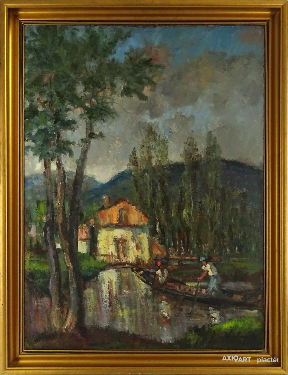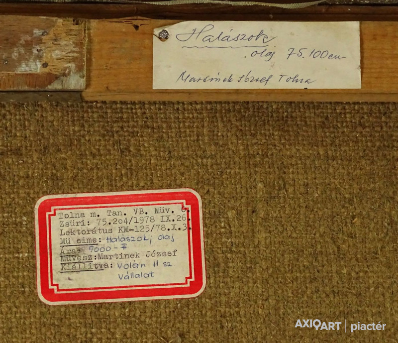 [1H153/012] Olaj vászon festmény, hatalmas aranyozott keretben. Datált jelzés jobbra lent és balra lent lásd fotó! Hátoldalán címke, rajta felirat: TOLNAI M. TAN. VB. MÜV. ZSŰRI: 5.204/1978.NOV.26. LEKTORÁTUS: KM-125/78.X.3. MŰ CÍME: HALÁSZOK, OLAJ MŰVÉSZ: MARTINEK JÓZSEF KIÁLLÍTVA: VOLÁN II. SZ. VÁLLALAT Magasság: 112 cm Szélesség: 85.5 cm Súly: 6.55 kg MARTINEK JÓZSEF PÉCS, 1904 - 1996, TOLNA Festő. Tanítói képesítést szerzett, magánúton folytatott művészeti tanulmányokat Aba-Novák festőiskolájában, majd Baján Rudnaynál. Tolnán működött. A pécsi Tanárképző Főiskolán 1956-ban szerzett rajztanári diplomát. A szegedi Pedagógiai Főiskola gyakorló iskolájában, majd Budapesten tanított. 1959-ben költözött vissza Tolnára, ahol a helyi képzőművész kör vezetője lett. Több önálló kiállítása volt Tolnán, Pécsett, Szekszárdon és más városokban.  Forrás: kieselbach.hu