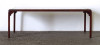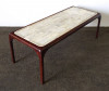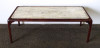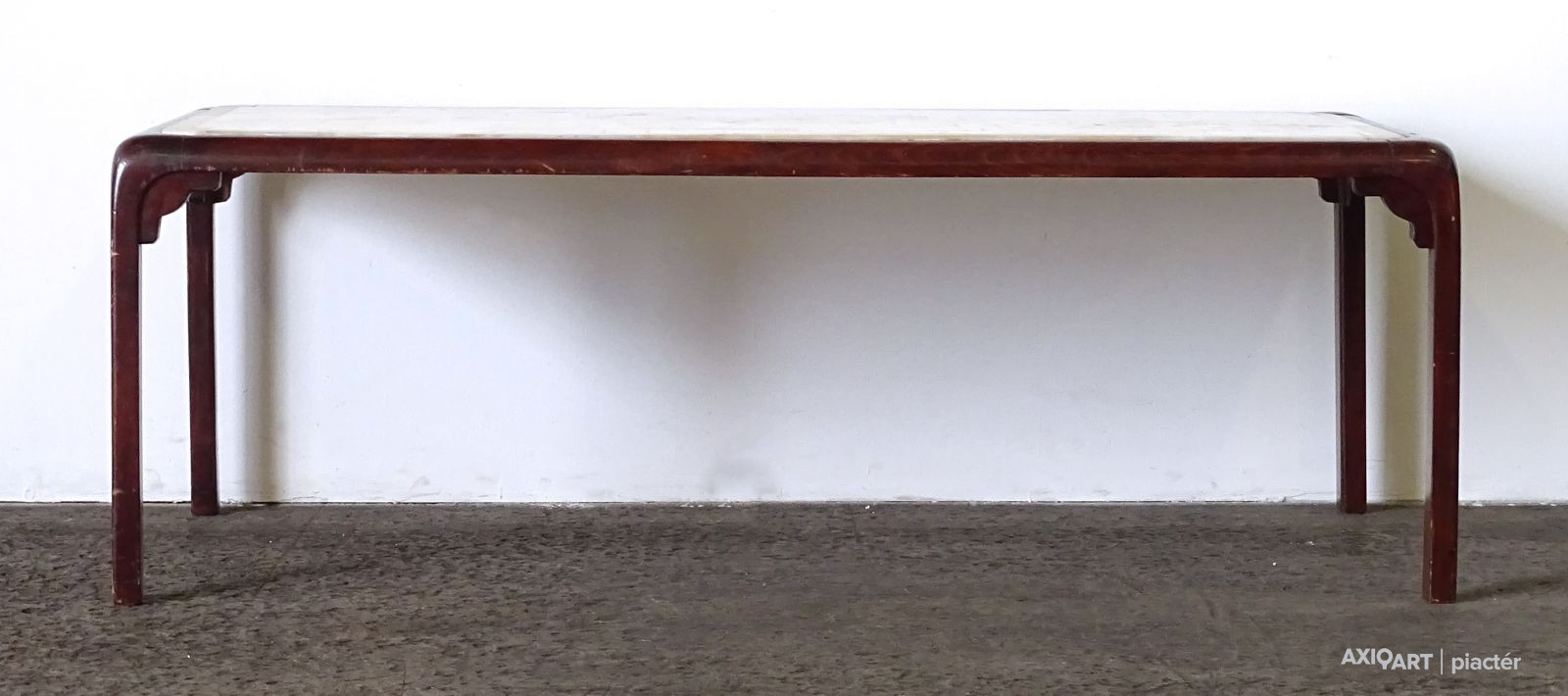 [1G644/KCS] Barna színű, nagy méretű világos színű márvány betéttel rendelkező minimalista orientalista bútor, dohányzóasztal. Az asztal szélei lekerekítettek, lábak illesztéseinél faragott keleti motívumokkal díszíttek. Magasság: 46 cm Szélesség: 56 cm Hosszúság: 132 cm