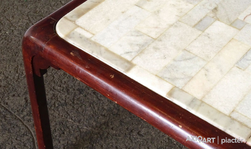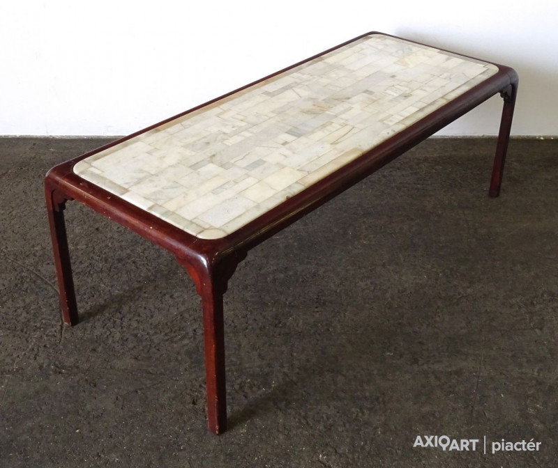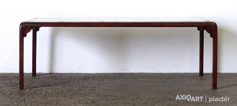 Barna színű, nagy méretű világos színű márvány betéttel rendelkező minimalista orientalista bútor, dohányzóasztal. Az asztal szélei lekerekítettek, lábak illesztéseinél faragott keleti motívumokkal díszíttek.