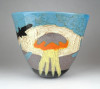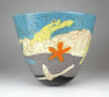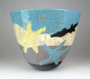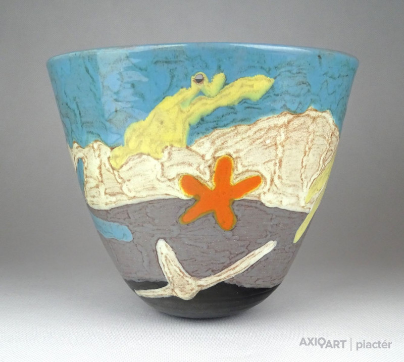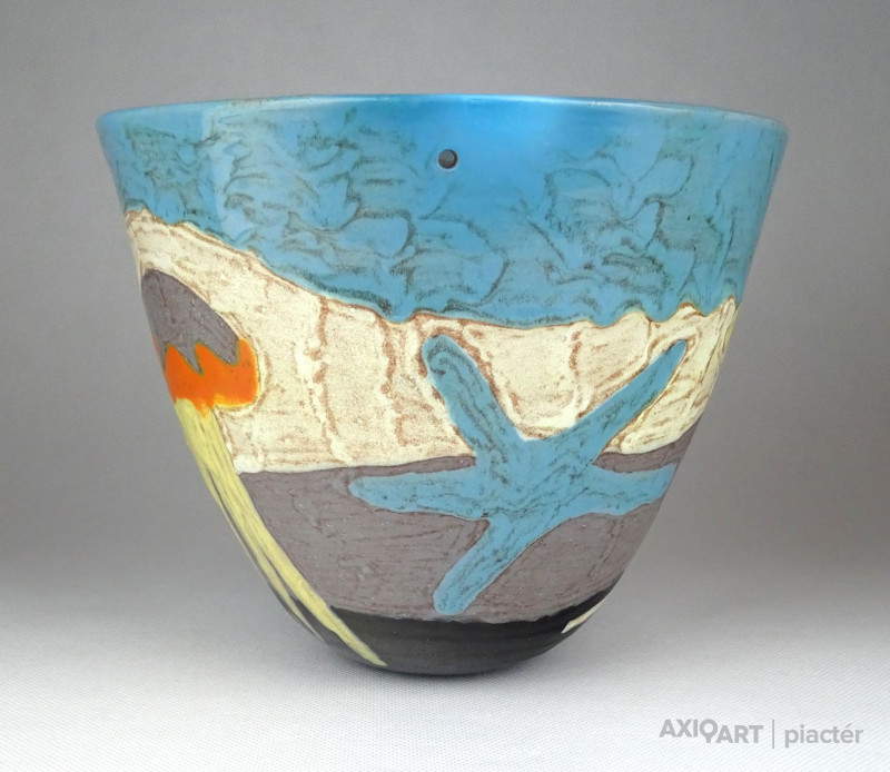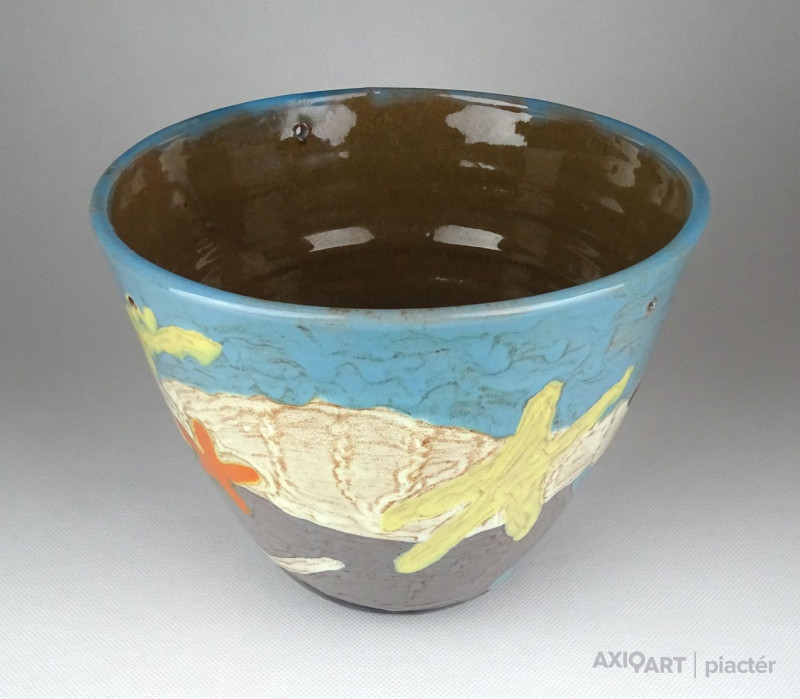 Hibátlan állapotú, akasztási lehetőséggel rendelkező kerámia kaspó. Színes mázas, kézzel festett, ritka egzotikus díszítéssel. Rajta tengeri csillag és medúza díszítés. Peremén profi restaurátor javítása található.