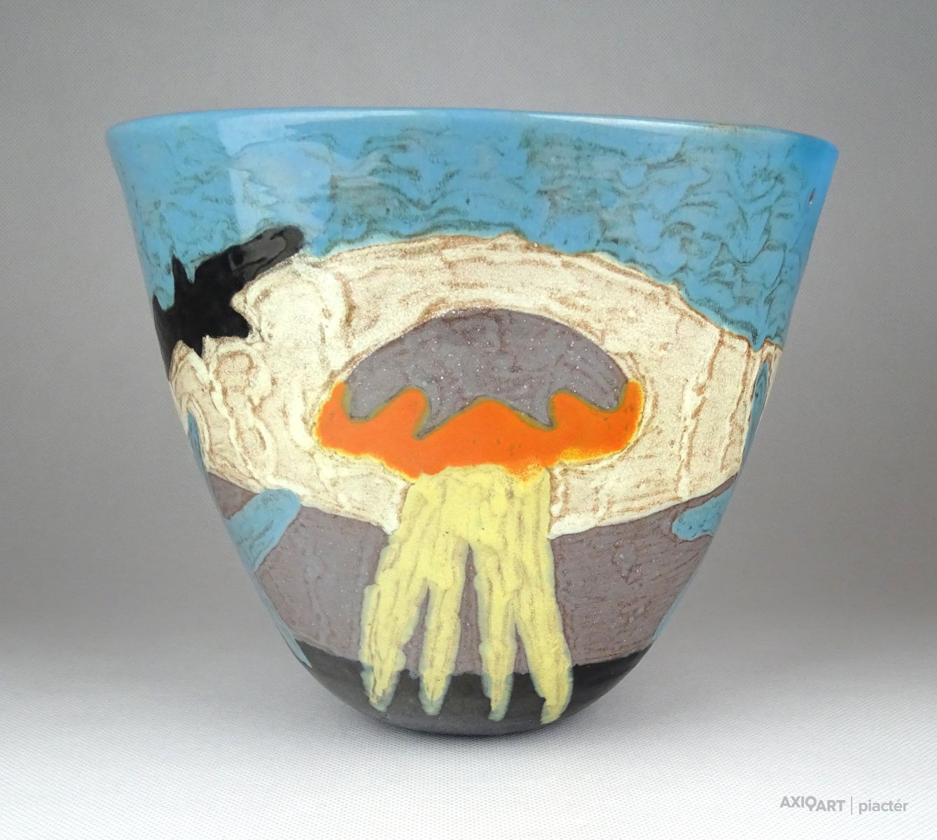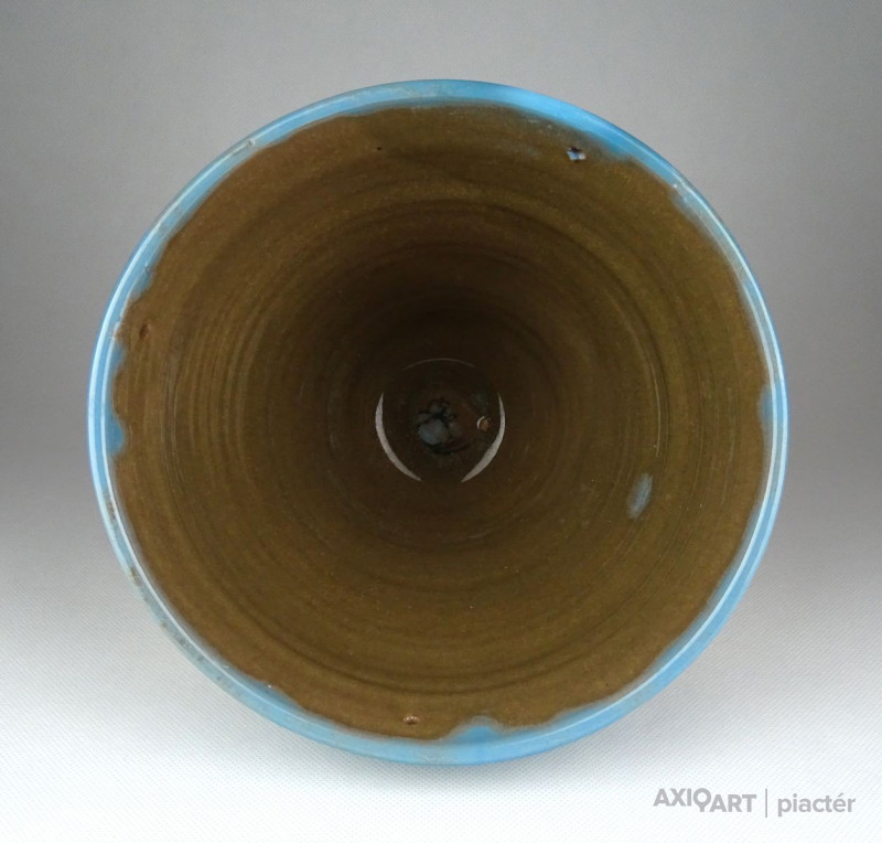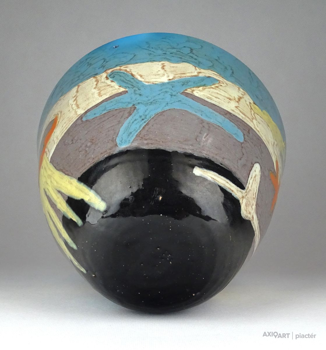 [1M055/X305] Retro hibátlan állapotú iparművészeti kerámia váza, díszváza. Alján jelzés: B. VÁRDEÁK Alján zsűri címke, rajta felirat: IPARMŰVÉSZETI VÁLLALAT ZSŰRISZÁM: 108154 69-995 Magasság: 10.5 cm Szélesség: 6.5 cm Hosszúság: 10.5 cm Súly: 0.35 kg B.Várdeák Ildikó keramikus Abony, 1929-05-13 Névváltozat: Bődy Oszkárné 1953-ban diplomázott a Magyar Iparművészeti Főiskolán Gádor István és Borsos Miklós növendékeként. 1971-ben és 1972-ben részt vett a Siklósi Kerámia Szimpóziumon. 1979: Faenza, aranyérem [Bődy Oszkárral]; 1980: Patikaedény-kiállítás, aranyérem, Gualdo Tadino. Kezdetben porcelán- és kerámiaedények tervezésével, kivitelezésével foglalkozott, majd kerti plasztikákat készített samottos agyagból. Jelenleg cserépkályhát, kandallót tervez és kivitelez, valamint régi épületkerámiák restaurálásával foglalkozik. Irodalom Mai magyar iparművészet. Kerámia, porcelán, üveg, Budapest, 1975. Egyéni kiállítások Egyéni kiállítások 1971 • Népház, Budapest-Óbuda 1980 • Faipari Szakiskola, Budapest 1992 • Angelika Cukrászda, Budapest. Válogatott csoportos kiállítások Válogatott csoportos kiállítások 1955 • Fiatal Iparművészek Kiállítása, Ernst Múzeum, Budapest 1955, 1959, 1965 • 2., 4., 5. Országos Iparművészeti kiállítás, Műcsarnok, Budapest 1958 • Magyar Iparművészek Kiállítása, Világkiállítás, Brüsszel 1959 • Magyar Képzőművésznők II. kiállítása, Műcsarnok, Budapest 1960 • Képzőművésznők nemzetközi kiállítása, Műcsarnok, Budapest 1963 • Modern magyar kerámia, Royal Festival Hall, London 1966 • Gádor István és tanítványai kiállítása, Ernst Múzeum, Budapest 1967 • Kerámia kiállítás, Vármúzeum, Siklós 1968, 1972, 1975, 1978, 1980 • I., III-VI. Országos Kerámia Biennálé, Pécs 1968, 1972, 1977, 1979 • Nemzetközi Kerámia Kiállítás, Faenza 1971, 1972 • Kerámia Szimpozion, Siklós 1972 • Edénykultúra, Műcsarnok, Budapest 1974 • Mai Magyar Iparművészet II., Iparművészeti Múzeum, Budapest 1975 • Jubileumi Iparművészeti Kiállítás, Műcsarnok, Budapest 1979 • Nemzetközi Kerámia Kiállítás, Sopot 1980 • Művészek az üzemekben, Magyar Nemzeti Galéria, Budapest 1982 • Magyar Kerámia, Palazzo delle Esposizione, Faenza 1983 • Nemzetközi Kerámia Kiállítás, Perugia – Gualdo Tadino 1995 • XX. századi magyar keramikusok. Válogatás az Iparművészeti Múzeum gyűjteményéből, Iparművészeti Múzeum, Budapest 1998 • In Memoriam Tornyai, Tornyai János Múzeum, Hódmezővásárhely 1998 • Őszi kerámia kiállítás, Palme Ház, Budapest Művek közgyűjteményekben Művek közgyűjteményekben Forrás: artportal.hu