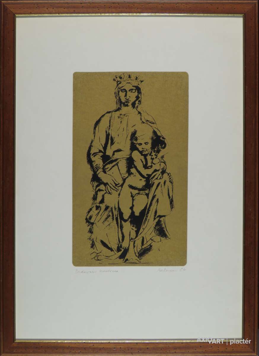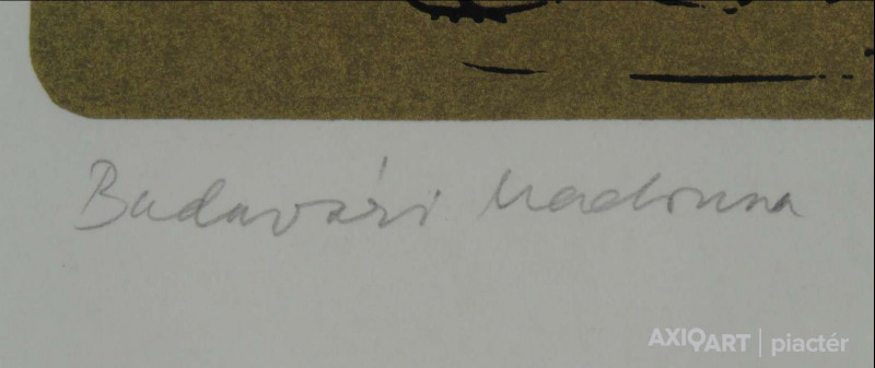 [FKC838/Bp57/33] A kép mérete: 36 x 21,5 cm keret nélkül. Készült: Szitanyomat, Papír A kép Melocco Miklós (Róma, 1935) alkotása. Jelezve lent "Budavári Madonna Melocco 84 (ceruzával)" A festmény jó állapotban van. Keret: Ép Művészeti lexikon I-IV. Szobrász. A Képzőművészeti Főiskolán Gyenes Tamás, Mikus Sándor és Pátzay Pál tanítványa volt. Ózdon és a gellérthegyi Jubileumi Parkban került felállításra egy-egy kútfigurája.