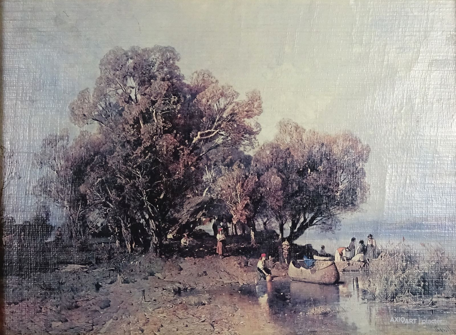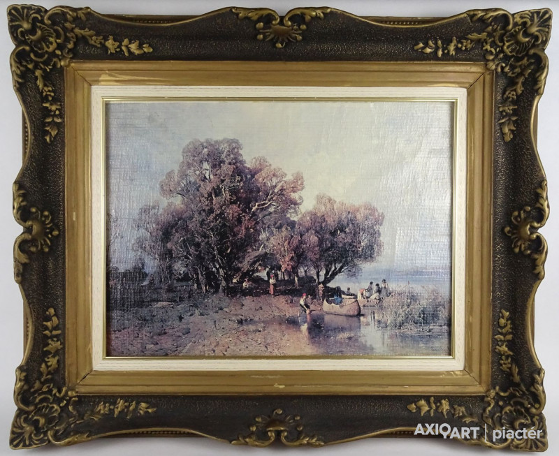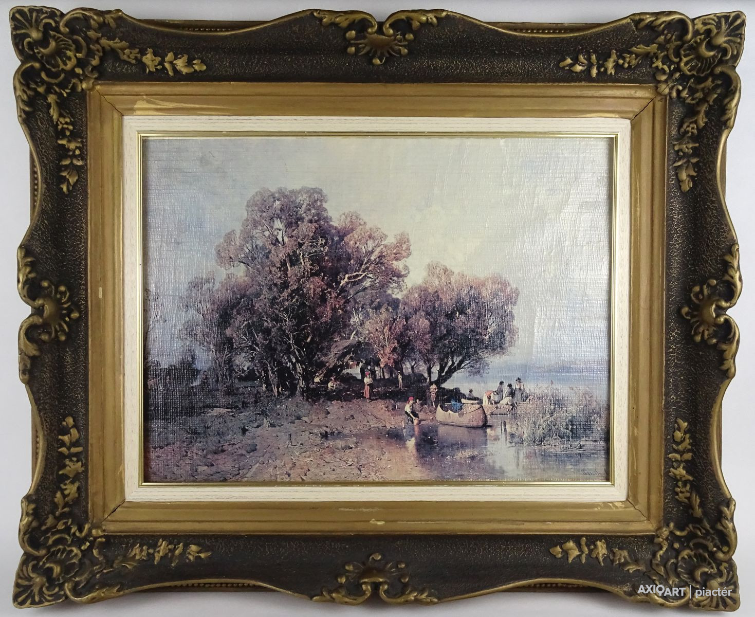 [1S388/059] Régi, aranyozott Blondel keretben található színes nyomat, reprodukció. Akasztási lehetőséggel rendelkezik. Jelzés jobbra lent: MÉSZÖLY G. Magasság: 61.5 cm Szélesség: 74.5 cm Súly: 4.57 kg BALATONI HALÁSZTANYA 1877 olaj, vászon (Magyar Nemzeti Galéria, Budapest)     Forrás: http://www.irodalmiradio.hu/femis/muveszetek/4muveszek/m_menu/meszoly_f/04meszoly.htm