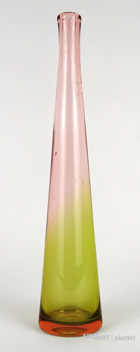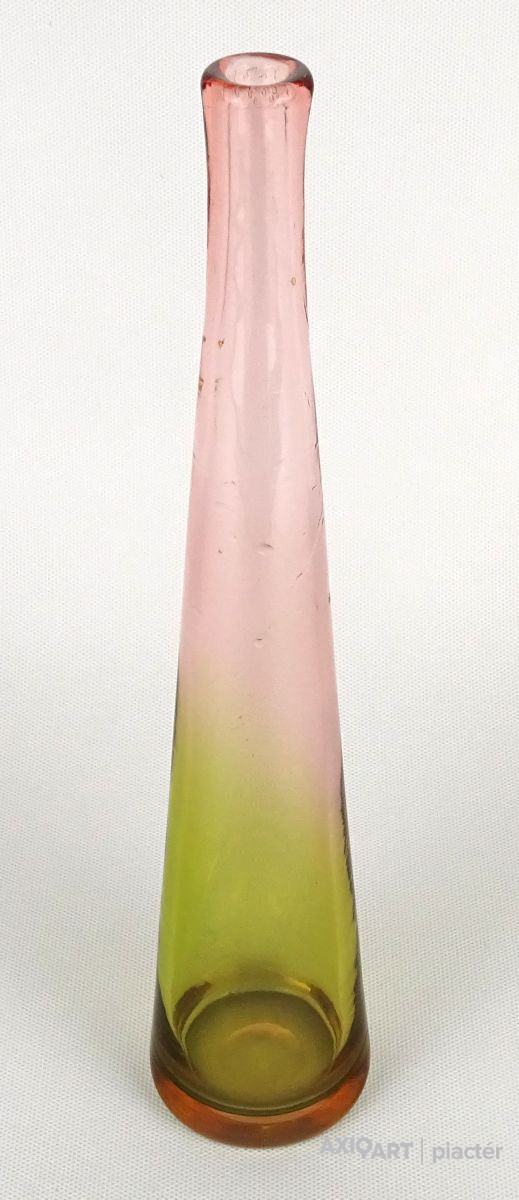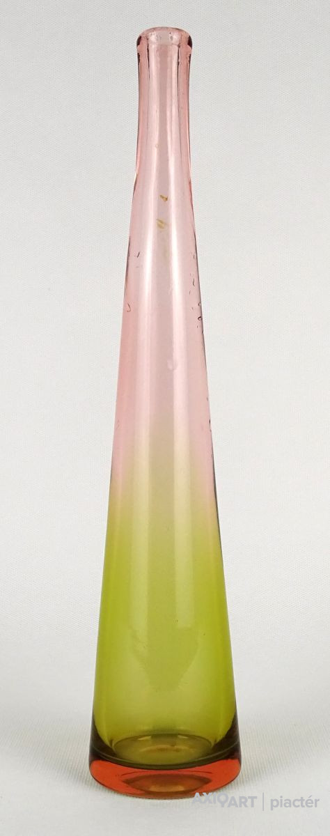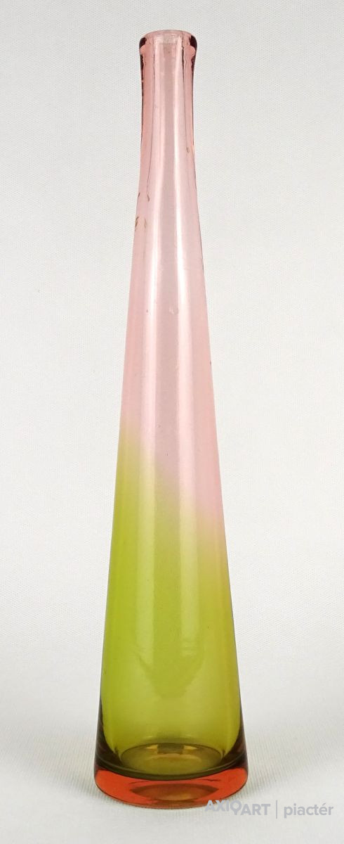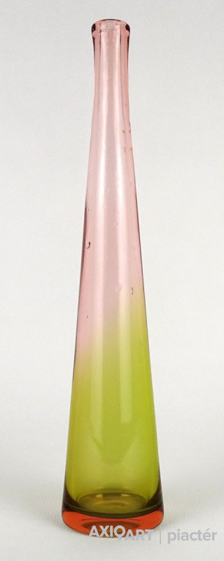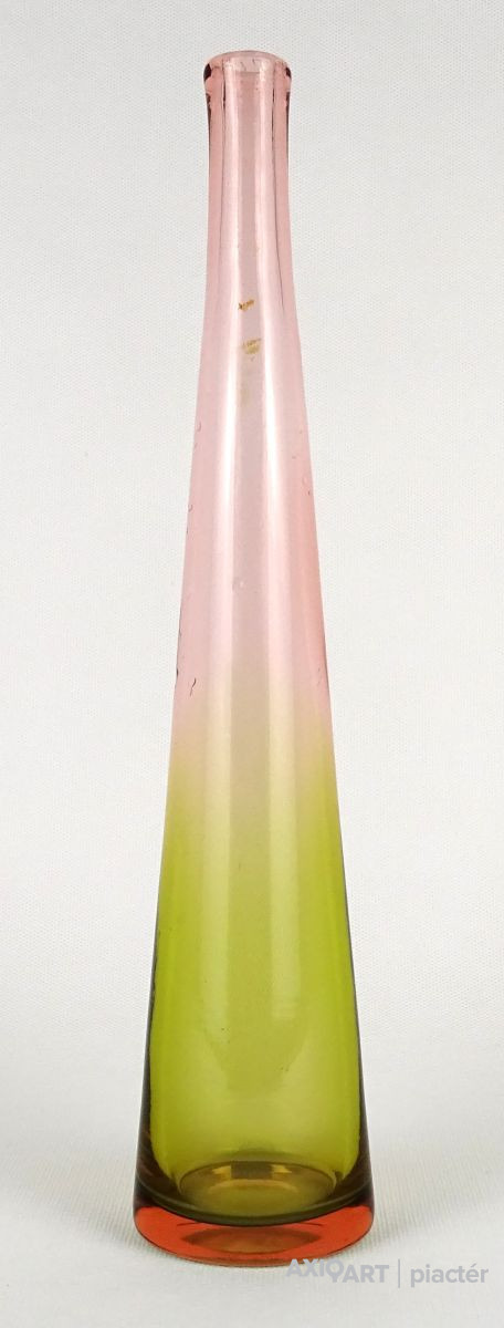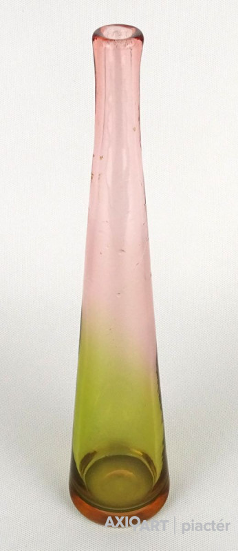 Hibátlan állapotú, sárga és rózsaszín rózsaváza, fújt üveg egyszálváza. Mid centuty üvegváza. A váza alján a fújás szakítás kicsiszolt nyoma látható.