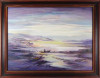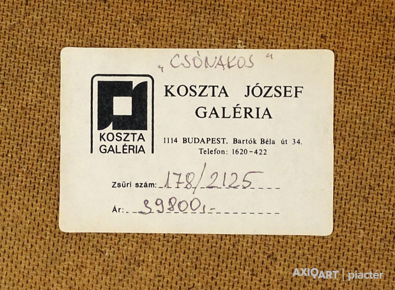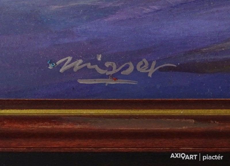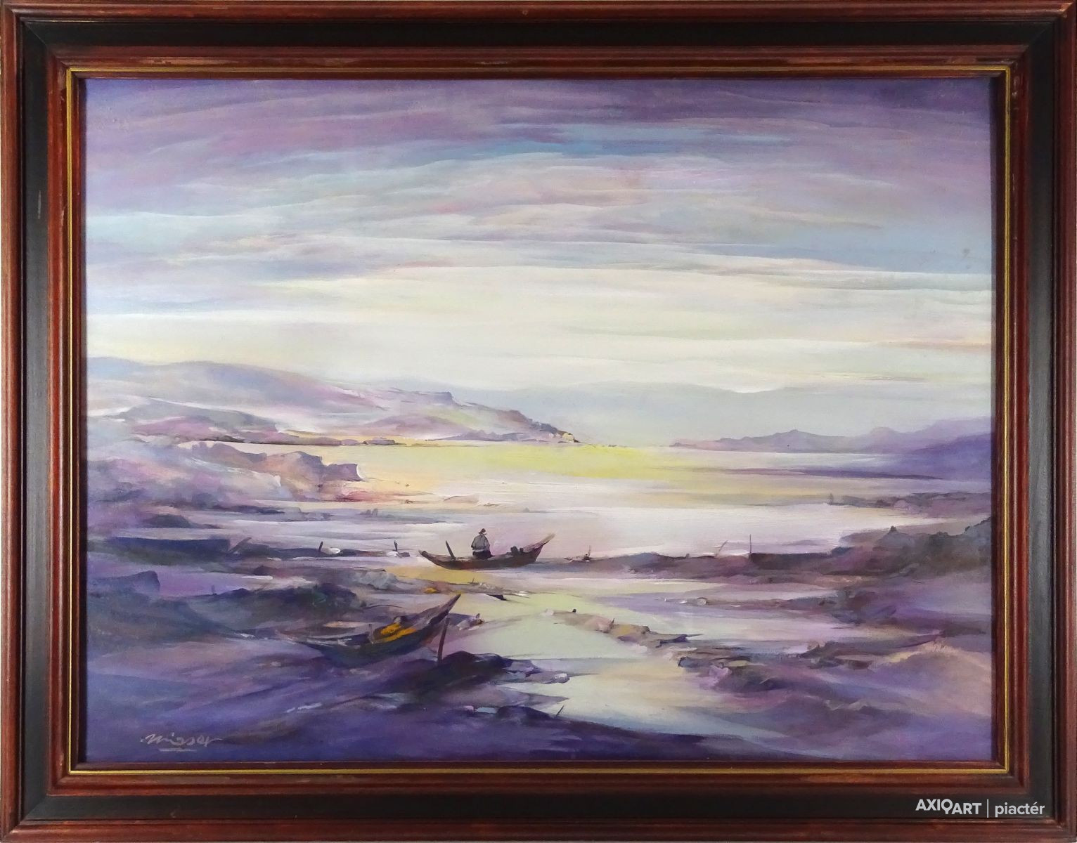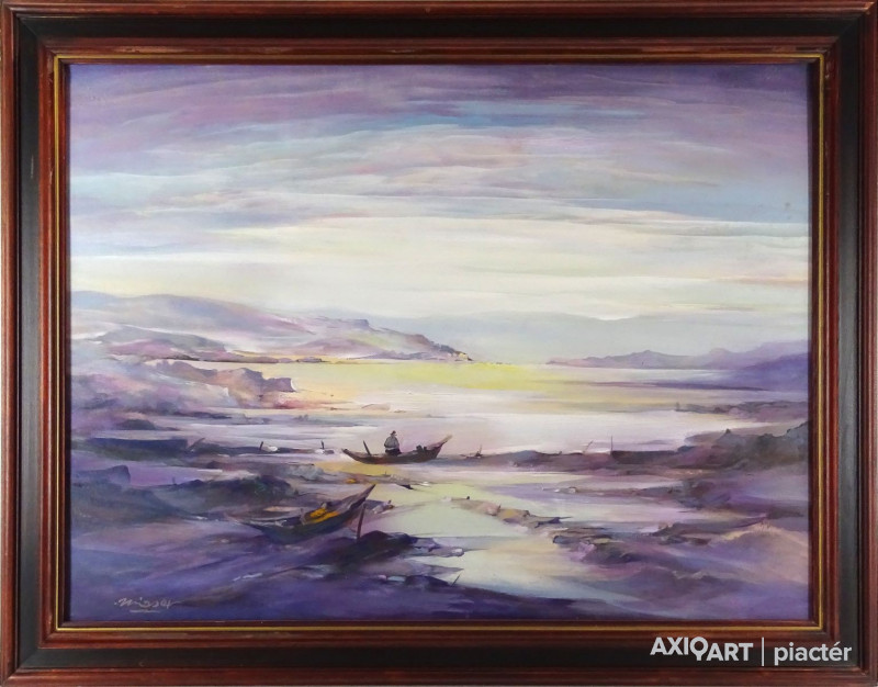 [1F165/046] Olaj farost festmény, üveglap mögött, kopottas barna keretben. Jelzés jobbra lent: MIZSER PÁL '69 Hátoldalon címke, rajta felirat: KOSZTA JÓZSEF GALÉRIA BUDAPEST ZSŰRI SZÁM: 178/2125 "CSÓNAKOS" Magasság: 72 cm Szélesség: 92 cm Súly: 6.81 kg Mizser Pál festő Újpest, 1941-04-14 Szerző: Pogány Gábor 1960: Magyar Képzőművészeti Főiskola, mestere: Fónyi Géza. 1968-1971: Derkovits-ösztöndíj. Kezdeti konstruktív szerkezetbe komponált természetelvű látványfestészete fokozatosan egyre színesebbé vált; a 70-es évek második felében valós tájszerkezetét a valószerűtlenül élénk, vöröses-lilás-narancsos színvilága tette látomásossá. Később a tájelemek váltak egyre szürreálisabbakká, mintha Tanguy világa jelent volna meg a Duna menti dombvidéken, ezzel párhuzamosan színei higgadtabbá váltak. Irodalom Egyéni kiállítások Egyéni kiállítások 1967, 1971, 1975 • Vác 1972 • Miskolc • Dunaújváros • Budapest 1976 • Kecskemét, Érd.    Forrás: artportal.hu