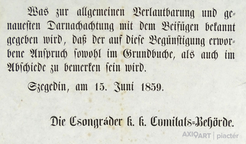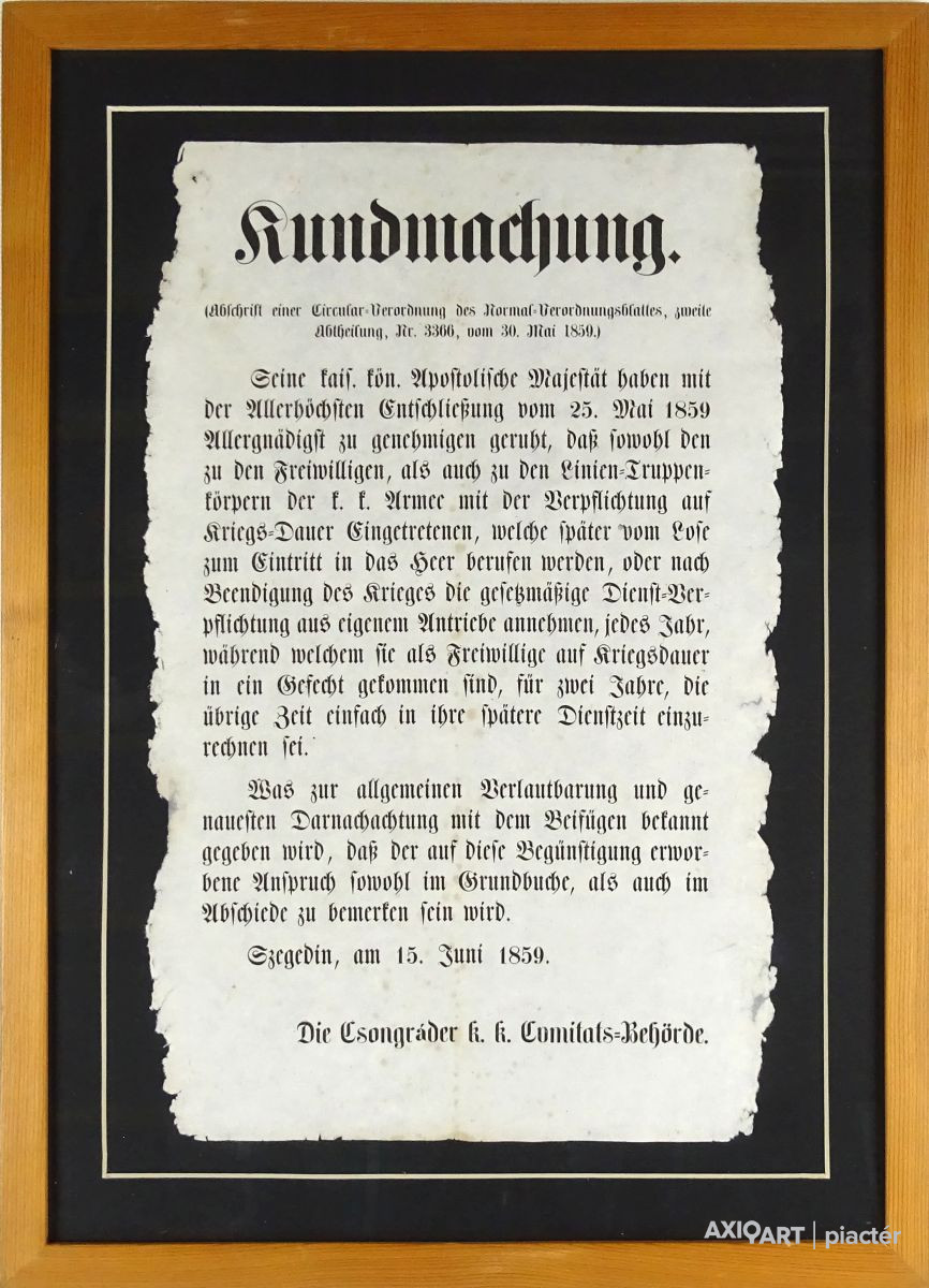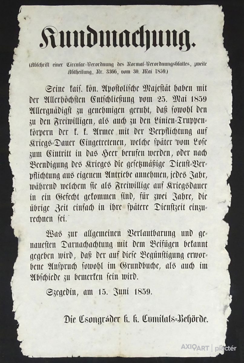 [1B590/020] HIRDETMÉNY 1859 Szeged Hivatalos katonai hirdetmény. A lapszélek sérültek, a szövegmező nem károsodott, a szöveg jól olvasható. A hirdetmény címe, hivatkozása: Másolata a német nyelvű szabályrendeleti lapok második részében 1859 év május 30-áról 3366. sz.a. megjelent (katonai) körrendeletnek. A hirdetmény tartalma: A katonai szolgálat és a katonai szolgálati idő megállapítása A hirdetményt kiadta: Csongrád megye cs. kir. katonai főnöksége Dátum: Szeged, 1859. június 15. Üveglap mögött, fekete háttéren, fenyő keretben. Magasság: 50.5 cm Szélesség: 36 cm Súly: 1.025 kg