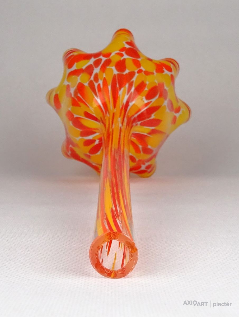 Hibátlan állapotú, fújt, csorgatott művészi Muránói üveg tölcsér. Földbe, virágcserépba szúrható virágtartó tölcsér. Sárga piros művészi üvegmunka.