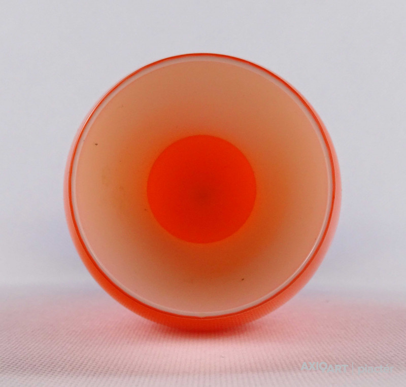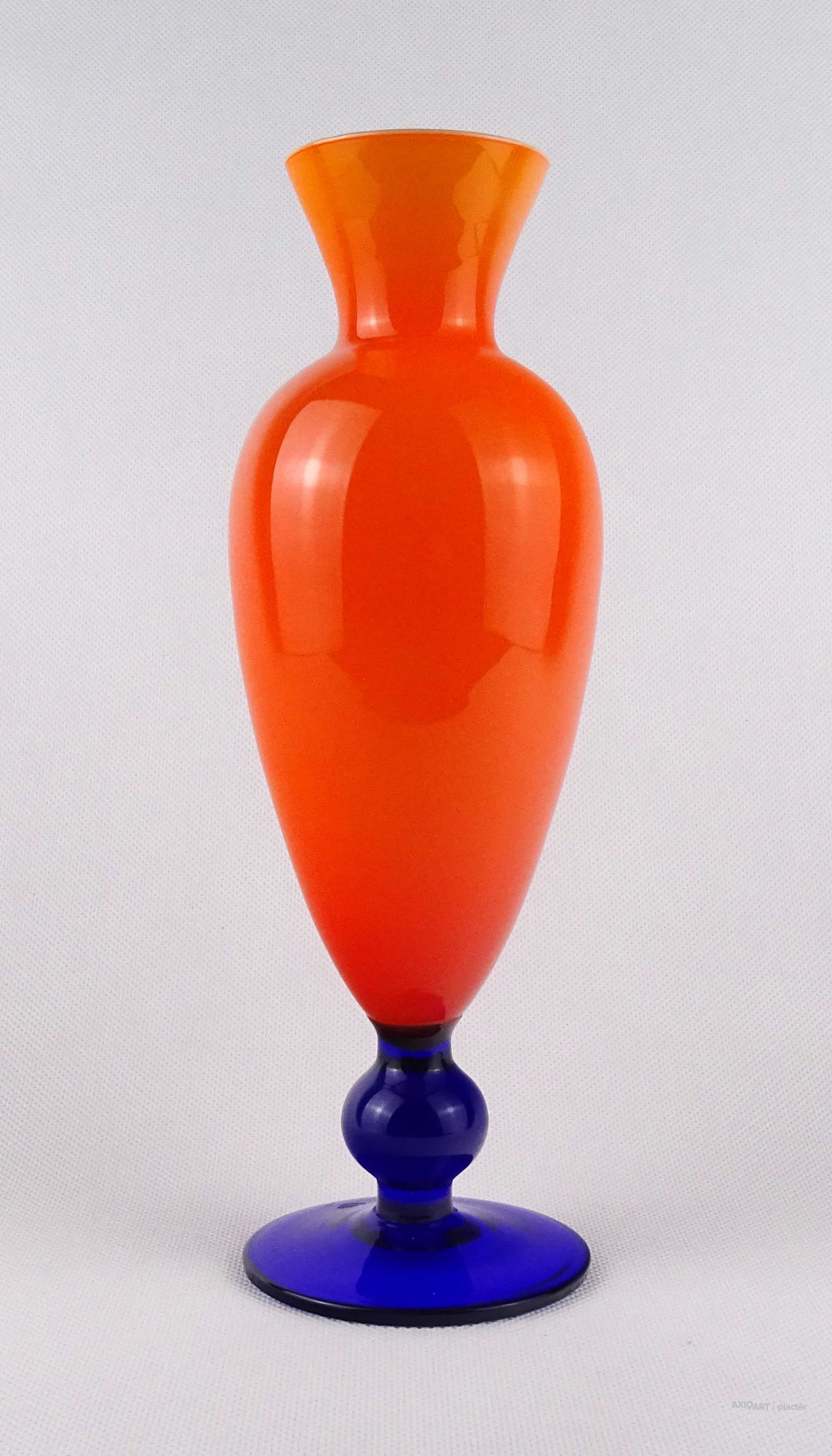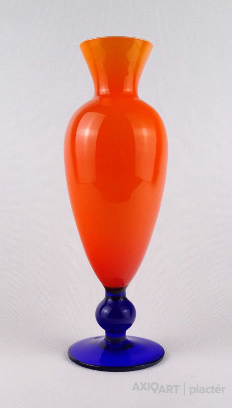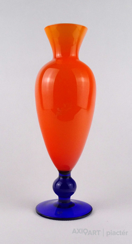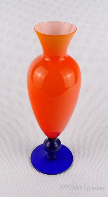 [1O212/Z046] Hibátlan állapotú, színezett fúvott üveg váza, talpas üveg váza vagy üveg kupa. Skandináv design üveg. Talpán a fúvás szakítás nyoma szépen kivehető. Magasság: 14 cm Szélesség: 6.5 cm Súly: 0.215 kg Erik Höglund  Ugrás a navigációhozUgrás a kereséshez A papról (1902–1971) lásd Erik Höglund (pap) . Erik Höglund Született 1932. január 31. Karlskrona , Blekinge megye Halál 1998. január 27. (65 éves) Maria Magdalena plébánia , Stockholm Állampolgárság svéd Foglalkozás/megbízás Tervező, művész Ismert Tervezés Koszta Boda számára Feleség Maerit Levin (sz. 1953–1967; elvált) Ingrid Höglund (sz. 1974–1998; halála) Partner Monica Backström (partner 1968-1972) Rokonok Anna Höglund (lánya) Erika Höglund (lánya) Albin Höglund (fia)  Erik Sylvester Höglund , 1932. január 31-én született Karlskronában , 1998. január 27-én halt meg a stockholmi Maria Magdalena plébánián , svéd szobrász , festő , grafikus és üvegművész . Életrajz  Erik Höglund Torsten Höglund és Jenny Jonsson könyvelő fia, valamint Tore Enar Höglund szobrász és grafikus öccse volt . Tanulmányait a stockholmi Konstfackban végezte , először dekorfestészetet Fritz Sjöströmnek , majd szobrászatot Robert Nilssonnak , végül 1951–1952-ben Harald Sallbergnek grafikát . Erik Rosén , a Boda Üveggyár 1953 és 1973 között dolgozó tervezője fogadta be , és ez idő alatt jött el, hogy átalakítsa a svéd műüveggyártást az üvegtermékek kinézetére vonatkozó új ötletek bevezetésével. Ösztöndíja többek között metszetekkel kapcsolatban, a színek és a földes, aszimmetrikus dizájn sikeres lett a külpiacon. Bodán töltött ideje alatt fenyővel, vasalással és bútorokkal is foglalkozott. Később más üveggyárakkal is együttműködött, például a Pukeberggel , a Lindshammarral és a Studioglas Strömbergshyttannal . 1968-ban Monica Backström üvegművésszel megalapította a Backström & Höglund Design AB formatervező céget, amely bútorok, háztartási eszközök és használati tárgyak tervezésével foglalkozik. Höglund tagja volt a Vet Hut AB-nek is, amelyet 1971-ben alapított a Boda glasbruk tíz tervezője szokásos munkájuk mellett: Erik Höglund, Monica Backström, Ann Wolff , Göran Wärff , Bertil Vallien , Ulrica Hydman-Vallien , Per Arne. Lundahl, Liselotte Jörgensdotter, Gunhild Sinnemark és Rolf Sinnemark . Erik Höglund szobrászként számos köztéri dekorációt készített különféle anyagokból, köztük téglából és betonból. Ezt követően gyakran dolgozott együtt olyan építészekkel, mint Jon Höjer a Höjer & Ljungqvistnél , Bengt Gate és Lars Ågren .  Kiállítás  A stockholmi Palmcrantzska gyárban korábban Ulf G. Lindén állandó kiállítása volt Erik Höglund alkotásaival. Ezt a gyűjteményt 2009 szeptemberében a karlskronai Blekinge Múzeumnak adományozták.  Közművek válogatásban  Két állat és egy játék (1966), gránit, Bredängs Torg Stockholmban. Fiskargumman a karlskronai halpiacon. Négyzet alakú oszlop Gävle-ben Erik Höglund mintegy 150 köztéri dekorációt készített üvegből, bronzból, kovácsolásból, téglából, gránitból és betonból. Kerékpárosok I (1956), bronz, a trelleborgi oktatási intézmény Kerékpárosok II (1957), bronz, a karlskogai oktatási intézmény Kerékpárosok III (1957), bronz, stockholmi Hökarängens iskola Az élő szó (1958), festmény a nybrói városi könyvtárban Kerékpárosok IV (1958), bronz, Handverkstorget Sandvikenben Kerékpárosok V (1959), Sjöboskolan, Borås Falfestmény üvegablak (1962) a borgholmi templomban Kristallglasskogen (1964), üvegmozaik fal, Ellagårdsskolan Täby községben A tudás fája (1966), vasműves és üveg, Folkets Hus Nybroban Állatszobrok (1964-67), gránit, Hallsberg Két állat és egy játék (1966), gránit, Bredängs torg Stockholmban Tó szökőkúttal (1967), gránit, Trelleborg Ülő terhes nő (1971), bronz, Haganässkolan Älmhultban Hajó halászokkal (1972), vas, üveg és fa, Hotel Witt Kalmarban Négyzet alakú oszlop (1971-74), beton, Stortorget Gävle -ben A súlyemelő (1974), bronz, az östersundi sportcsarnok Gyűrűk a vízen (1976-77), bronz, Rödeby Torg , Karlskrona önkormányzat Az élet játéka , tégladomborműves fal és régi érmék , üveg, mindkettő 1979–1980, Sparbanken Linköpingben Úszók (1980), kovácsoltvas, úszócsarnok Rödebyben , Karlskrona önkormányzat Cirkuszgömb (1980-81), kovácsoltvas, Kristianstad megyei tanács Fiskargumman (1981-82), bronz, halpiac Karlskronában Az olvasócsalád (1983), bronz és üveg, Kalmár Városi Könyvtár Életmentő (1985), réz, úszócsarnok Haganässkolanban Älmhultban Dans bort i vägen (1985), bronz, Torsås volt Anya és gyermeke , bronz, Trelleborg A büszke apa és Két ember , bronz, Eskadern lakónegyed Linköpingben Játssz szobrot téglából, Lönneberga óvoda, Norra Fäladen Lundban  Forrás: wikipédia
